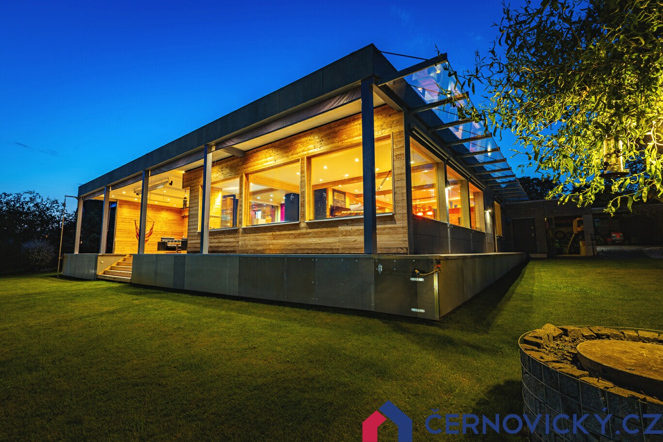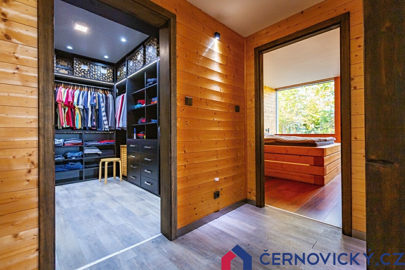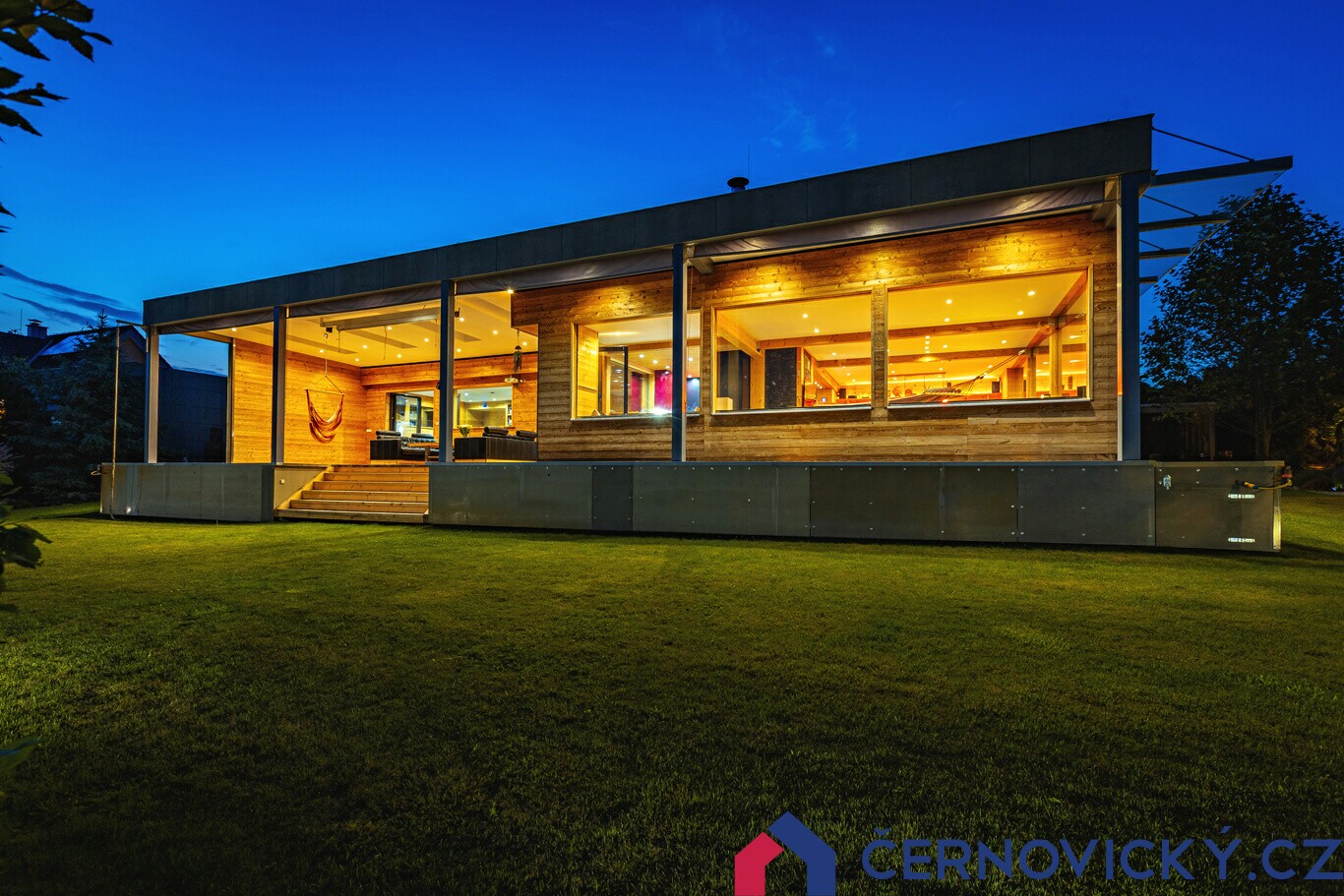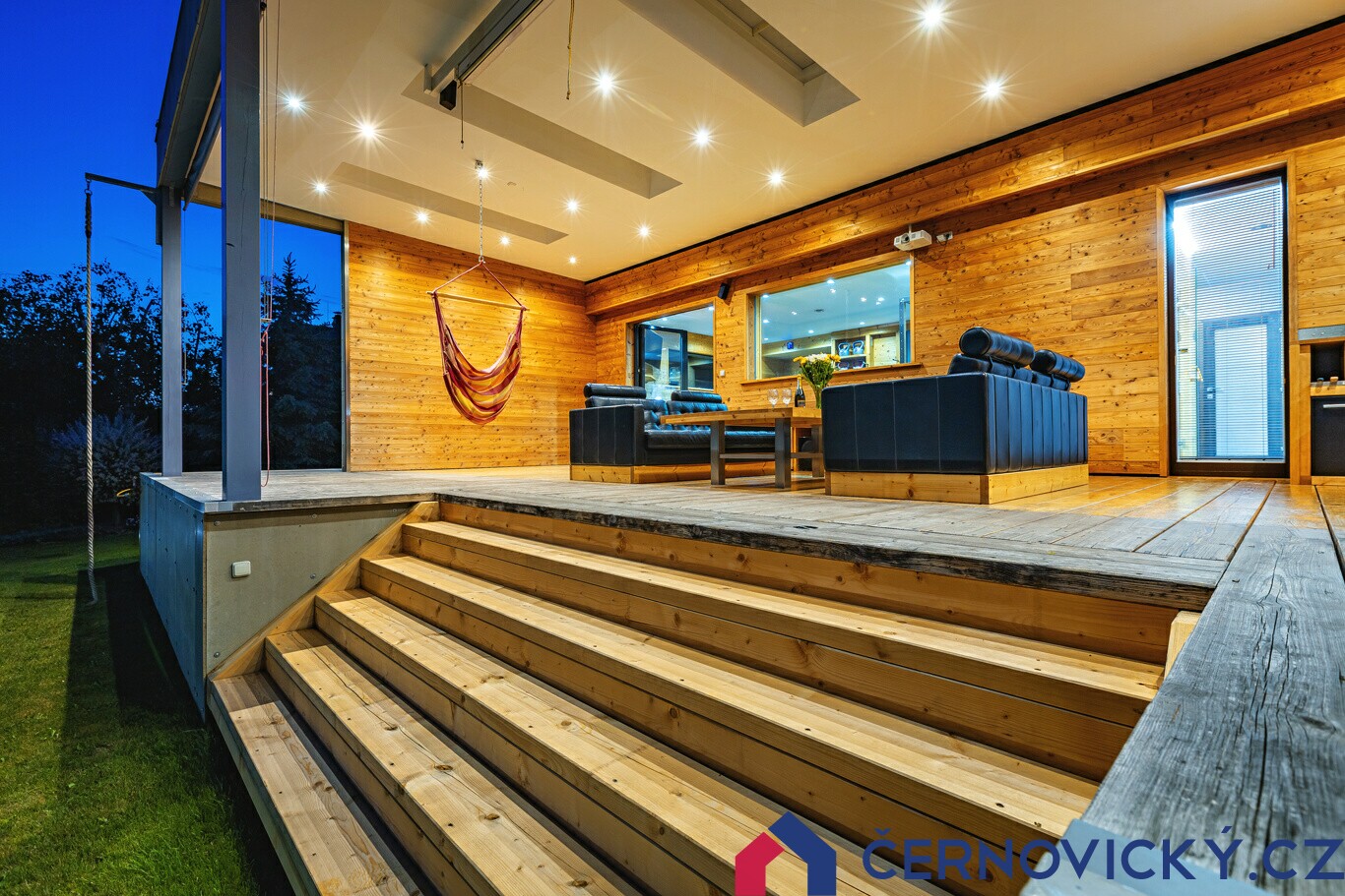 Vytápění trojicí tepelných čerpadel, rozvod teplého vzduchu z krbu po domě, solární panely, sauna, bezrámová okna, centrální vysavač, rozvody audio, obrovská garáž a extrémně nízké náklady na provoz. To je jen bleskový výčet vlastností a zajímavostí domu. Majitel se mnoho let živí prováděním dřevostaveb. Na tomto domě se maximálně vyřádil, aby naplnil své vysoké nároky.