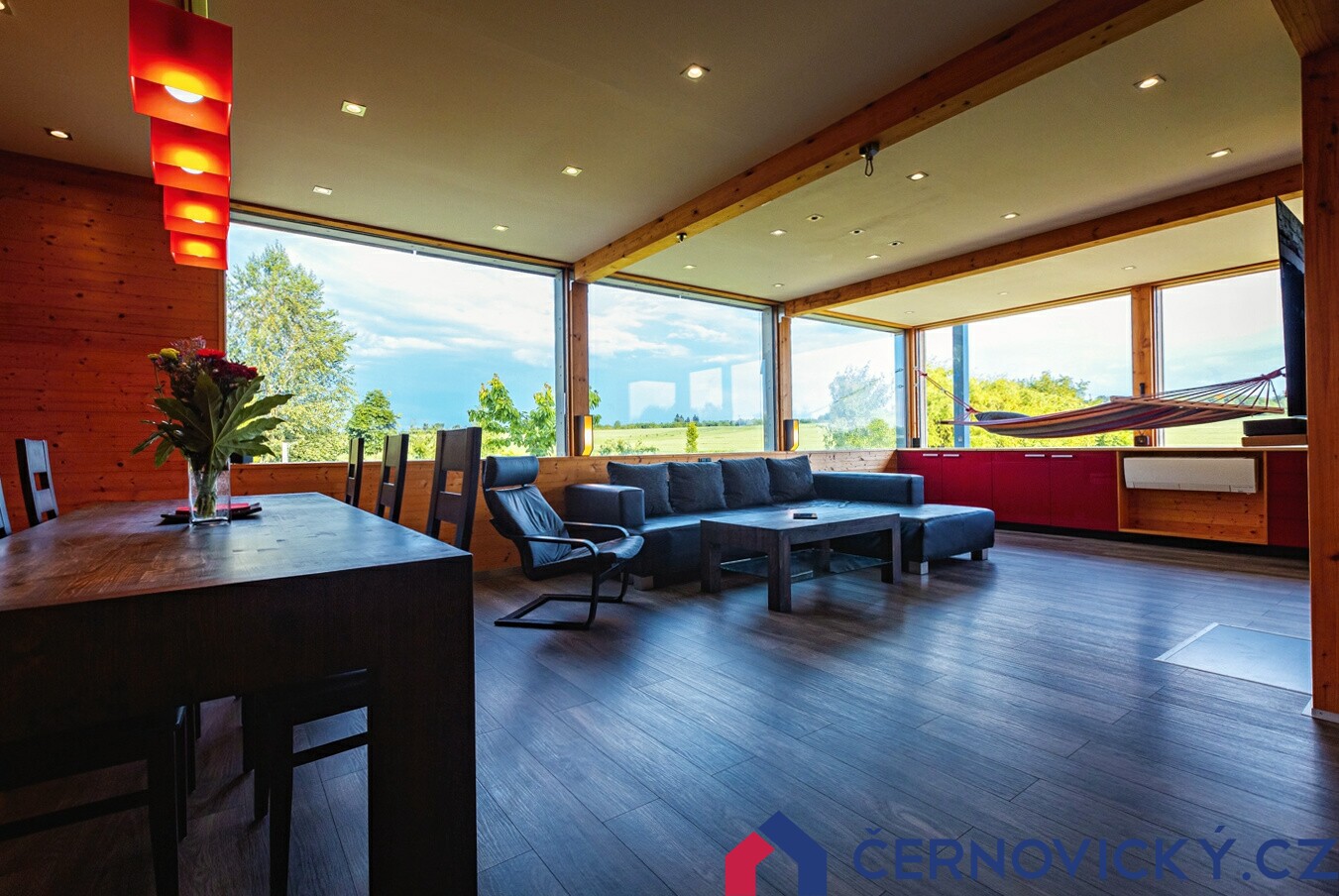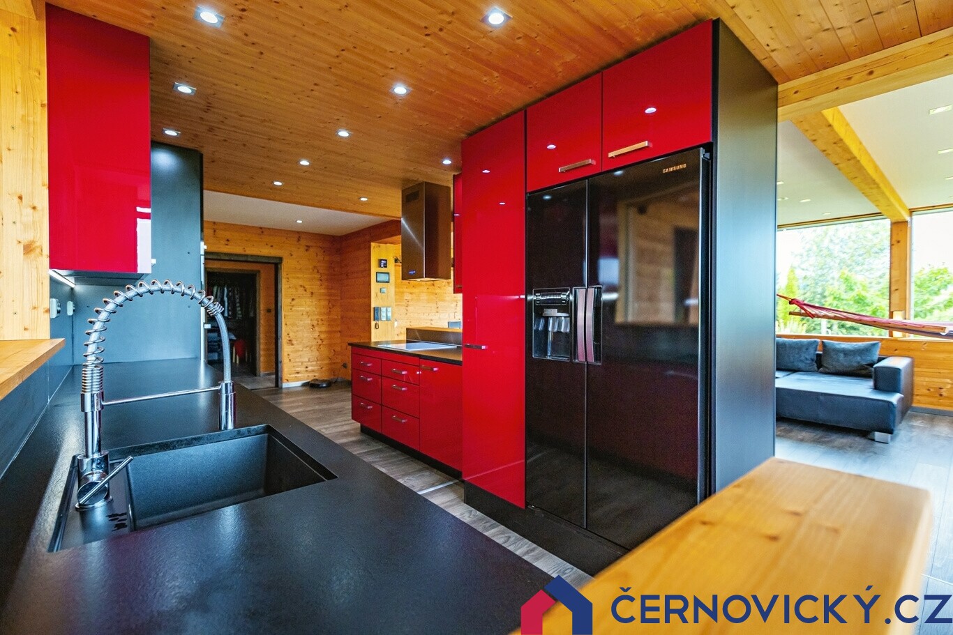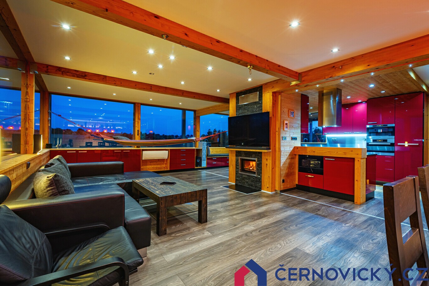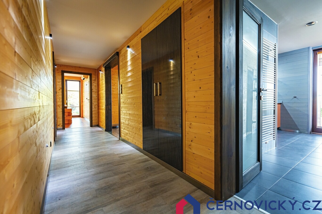 Vytápění trojicí tepelných čerpadel, rozvod teplého vzduchu z krbu po domě, solární panely, sauna, bezrámová okna, centrální vysavač, rozvody audio, obrovská garáž a extrémně nízké náklady na provoz. To je jen bleskový výčet vlastností a zajímavostí domu. Majitel se mnoho let živí prováděním dřevostaveb. Na tomto domě se maximálně vyřádil, aby naplnil své vysoké nároky.