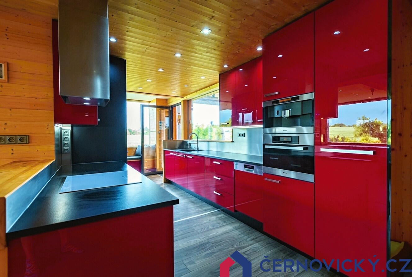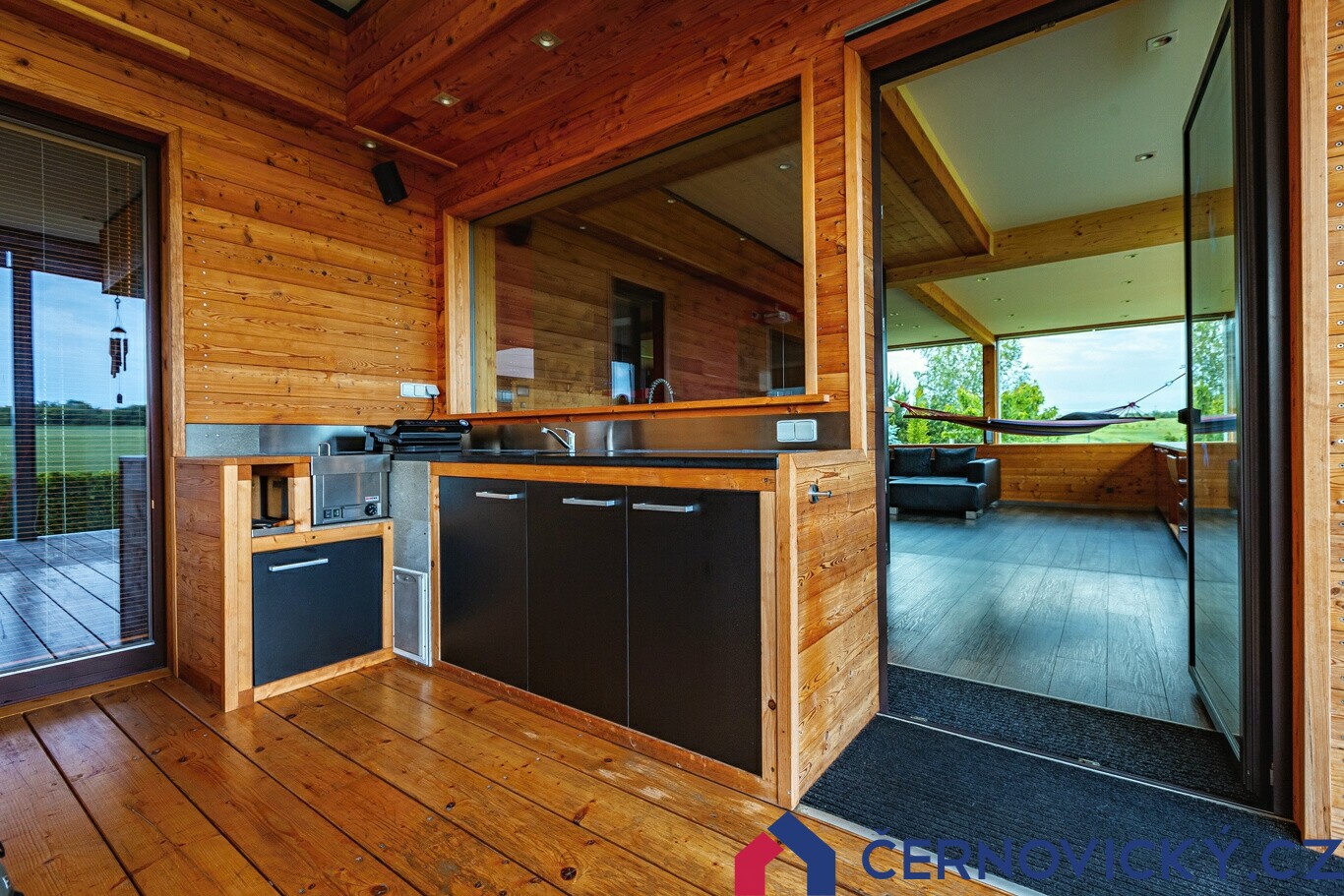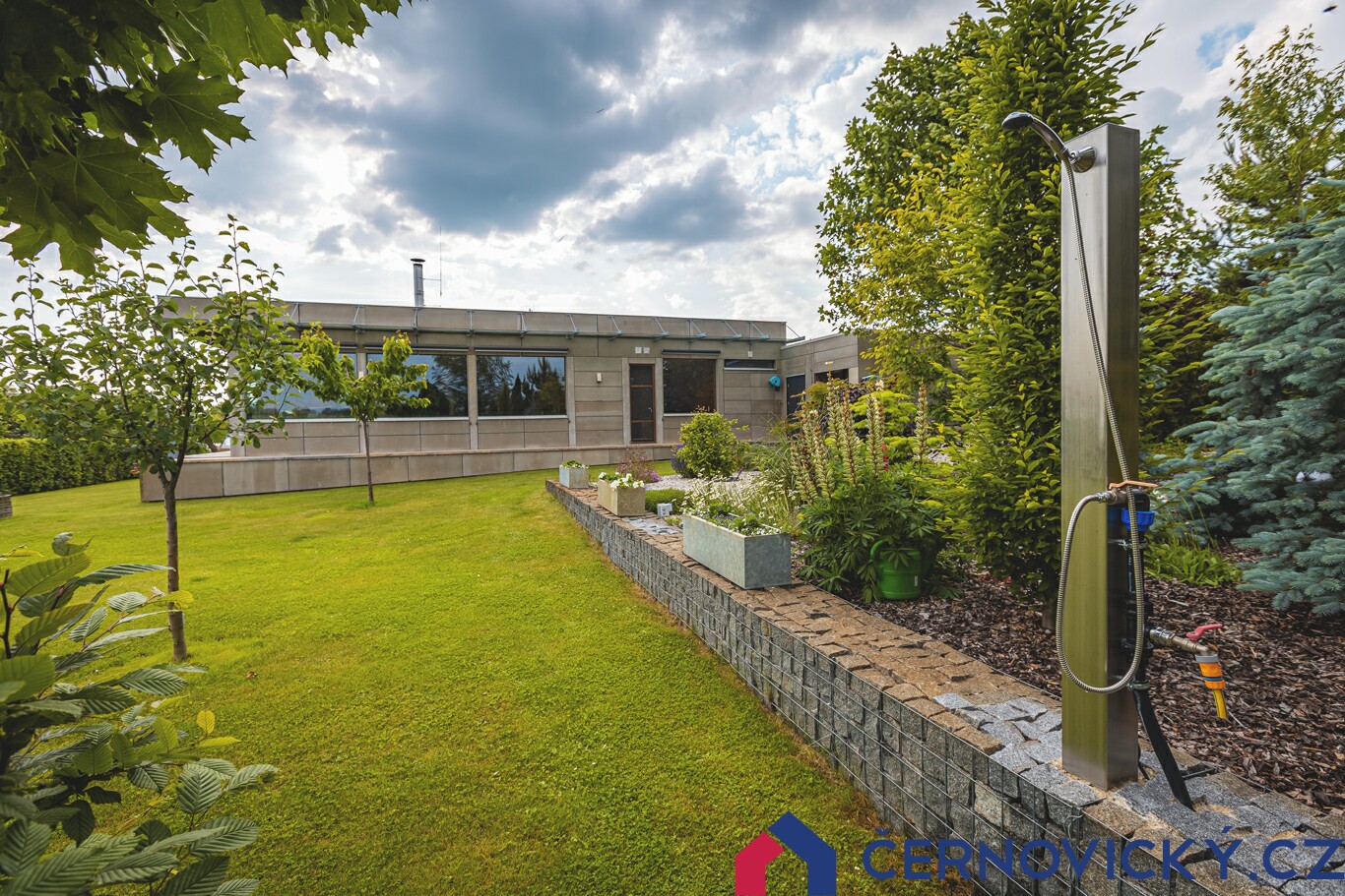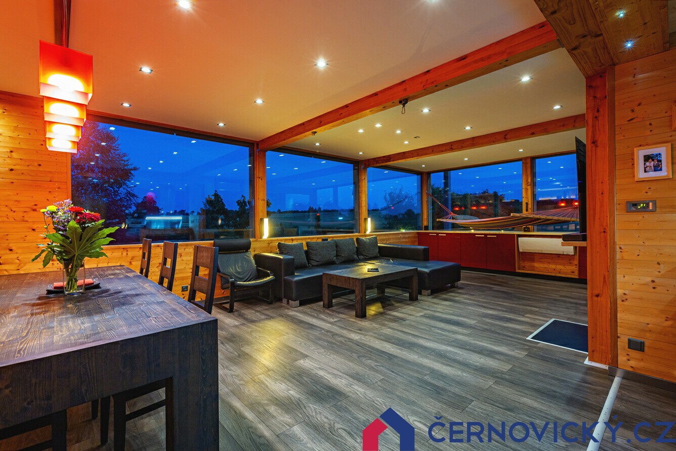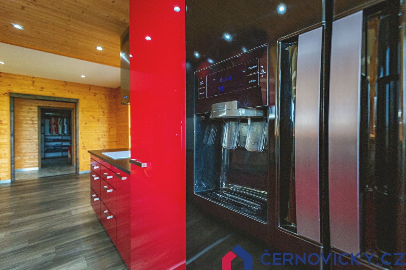Vytápění trojicí tepelných čerpadel, rozvod teplého vzduchu z krbu po domě, solární panely, sauna, bezrámová okna, centrální vysavač, rozvody audio, obrovská garáž a extrémně nízké náklady na provoz. To je jen bleskový výčet vlastností a zajímavostí domu. Majitel se mnoho let živí prováděním dřevostaveb. Na tomto domě se maximálně vyřádil, aby naplnil své vysoké nároky.