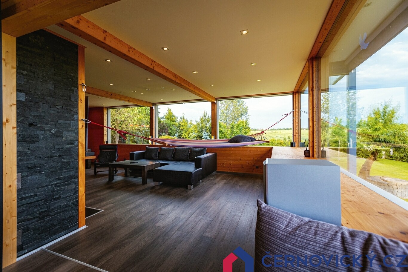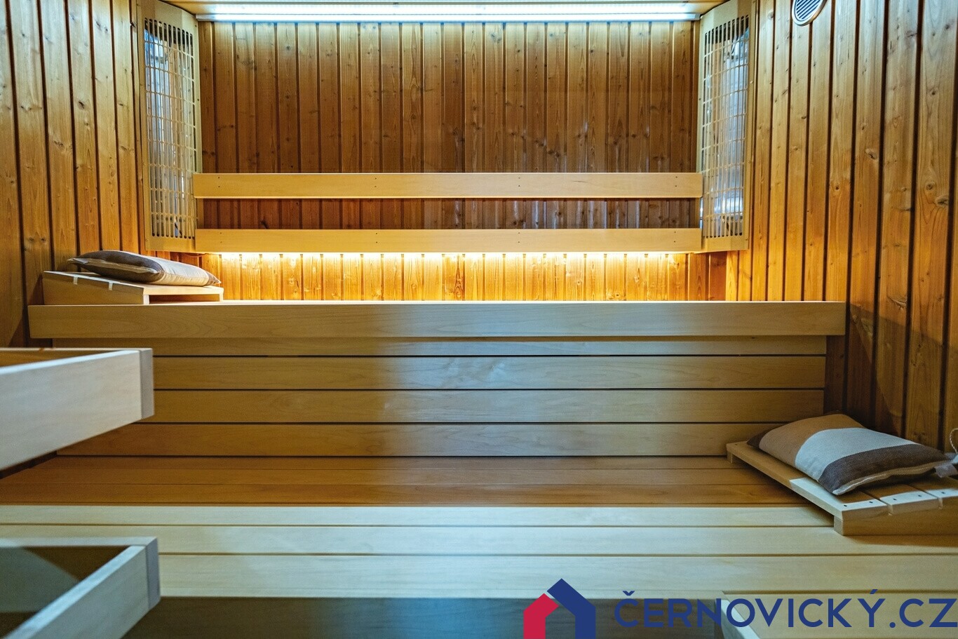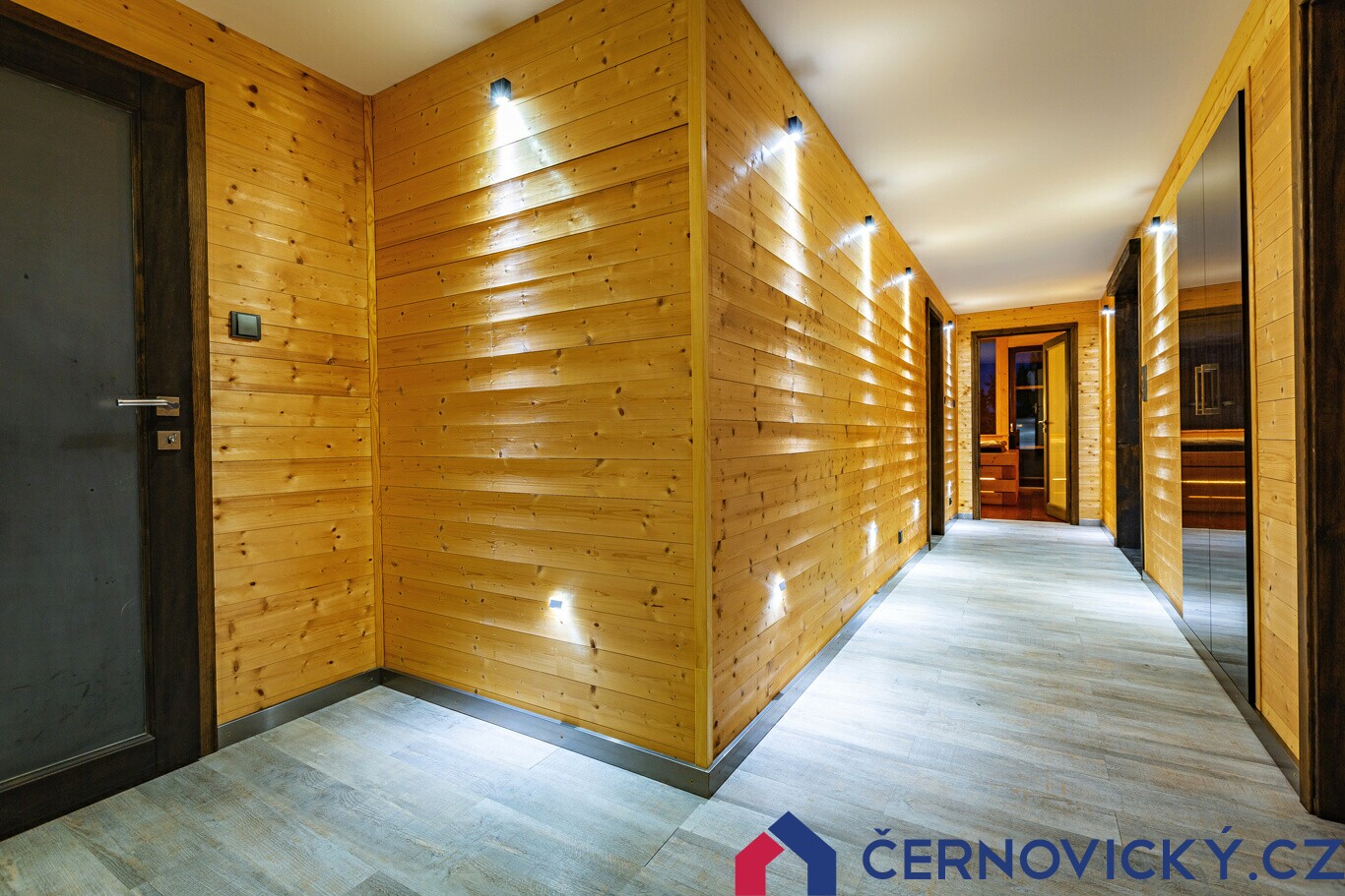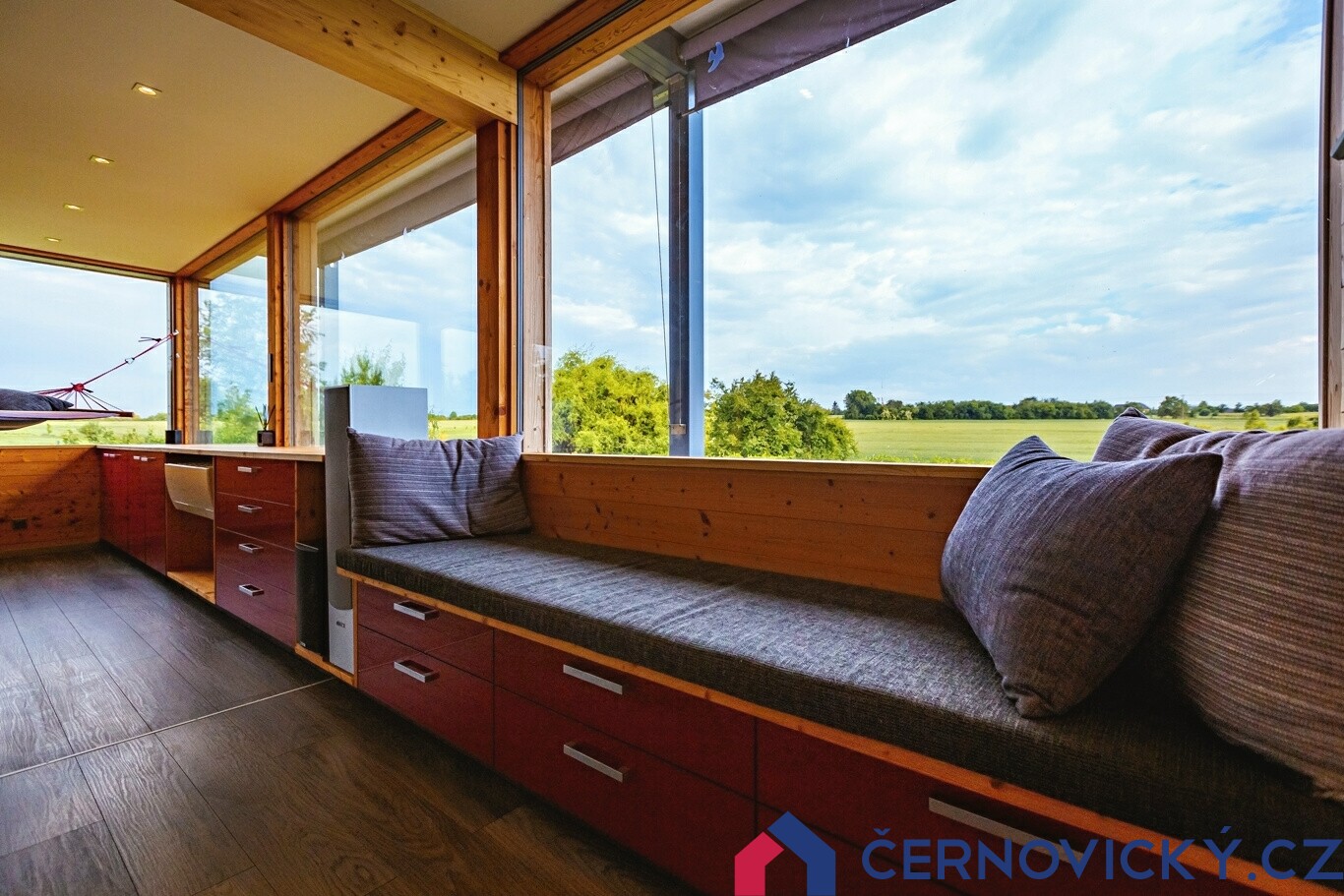 Vytápění trojicí tepelných čerpadel, rozvod teplého vzduchu z krbu po domě, solární panely, sauna, bezrámová okna, centrální vysavač, rozvody audio, obrovská garáž a extrémně nízké náklady na provoz. To je jen bleskový výčet vlastností a zajímavostí domu. Majitel se mnoho let živí prováděním dřevostaveb. Na tomto domě se maximálně vyřádil, aby naplnil své vysoké nároky.
