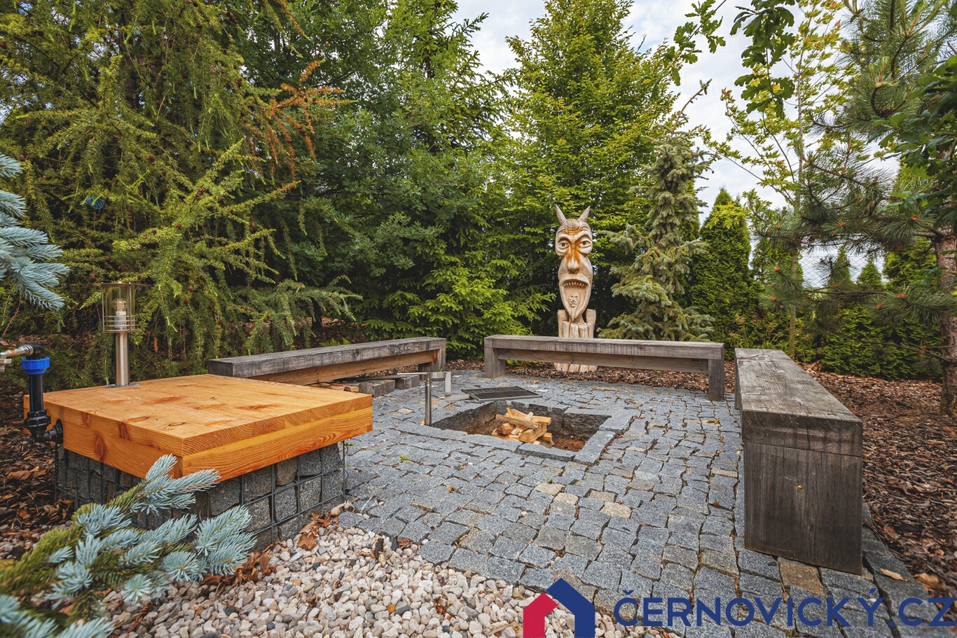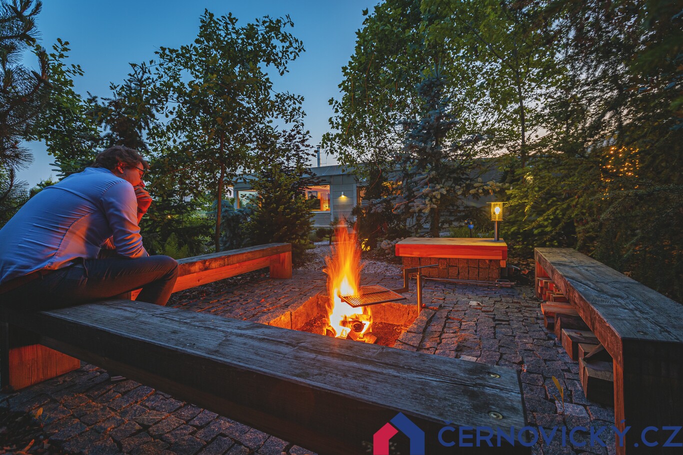 Mezi stromy je pak ukryté venkovní grilovací místo s lavičkami, originálním roštem a zapuštěným ohništěm. Po celé zahradě je umístěné osvětlení.
