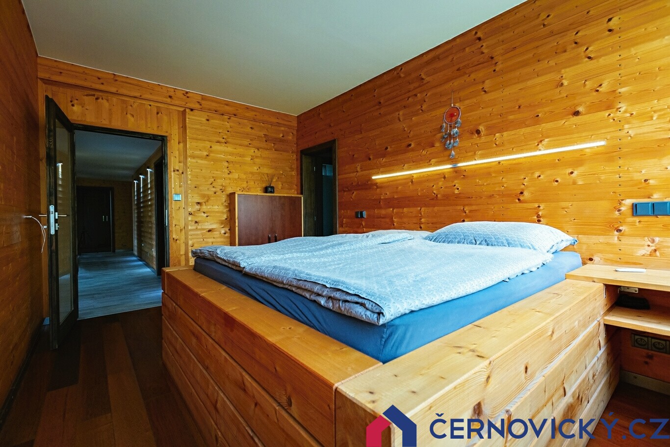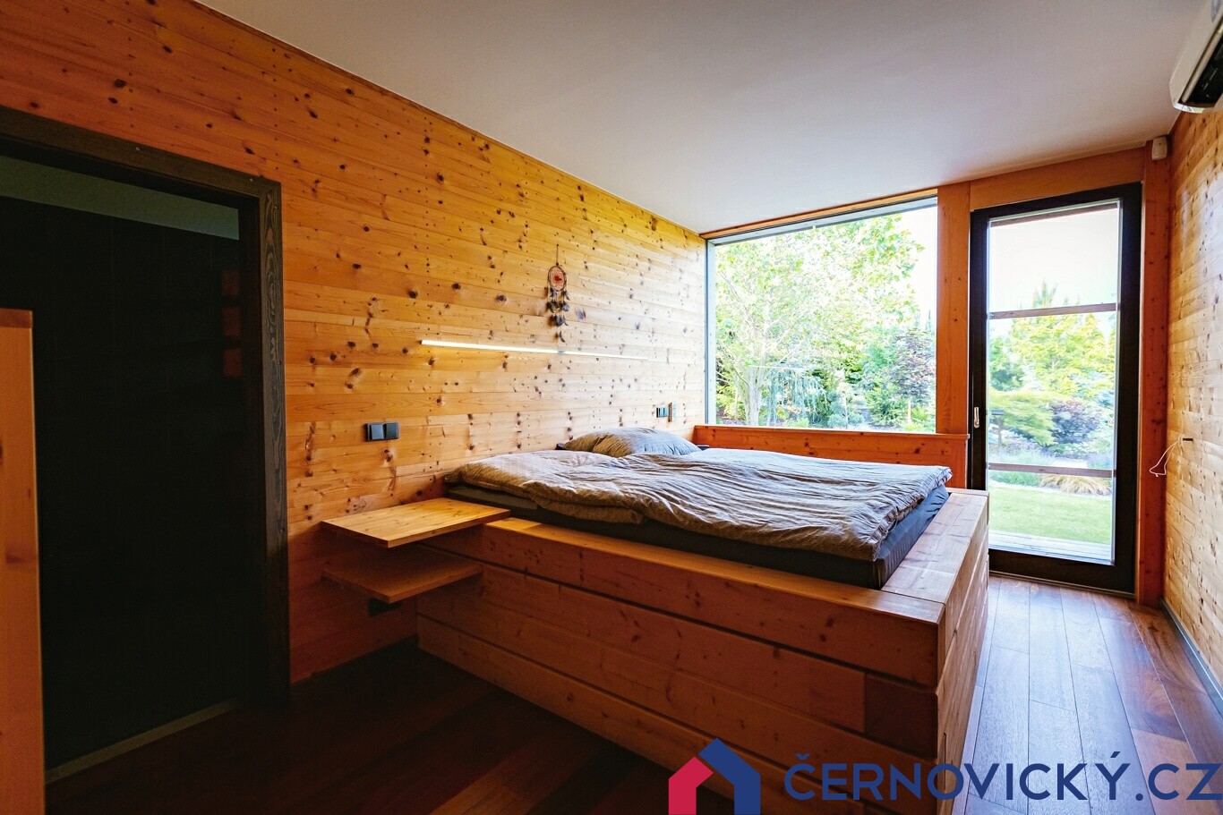Ložnice, která se v momentální koncepci domu nachází jedna, je laděna do tónů přírodního dřeva. Díky tomu působí prostor hřejivou a klidnou atmosférou. Jistě zaujme i originálně řešená postel. Zkrátka je vidět, že majitel to se dřevem opravdu umí. Teplé letní měsíce posledních let vás trápit nebudou, ložnice je totiž vybavena klimatizací (kterou se dá rovněž topit). Dveře na terasu, která lemuje dům, jsou vybaveny sítí proti hmyzu.