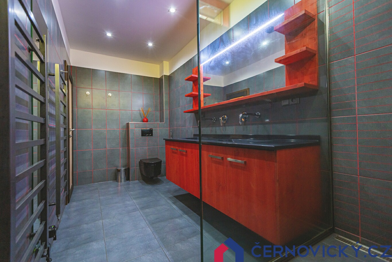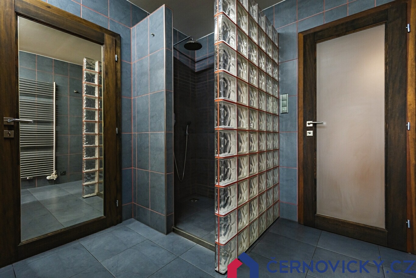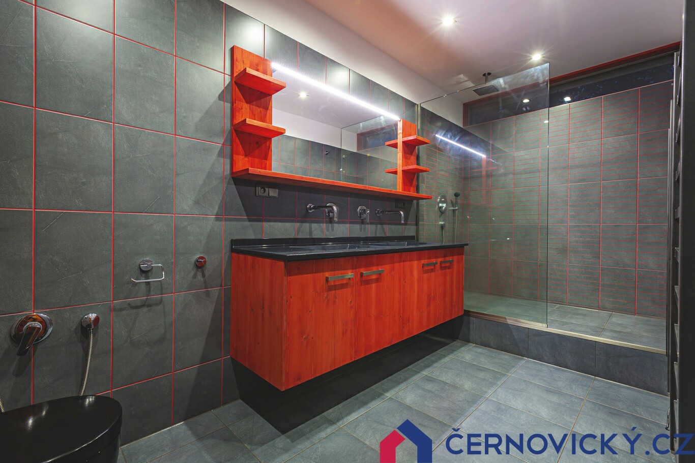 Přímo z ložnice je přístupná první koupelna, která nabízí opravdu královský sprchový kout (šířka 1.9 metru)
