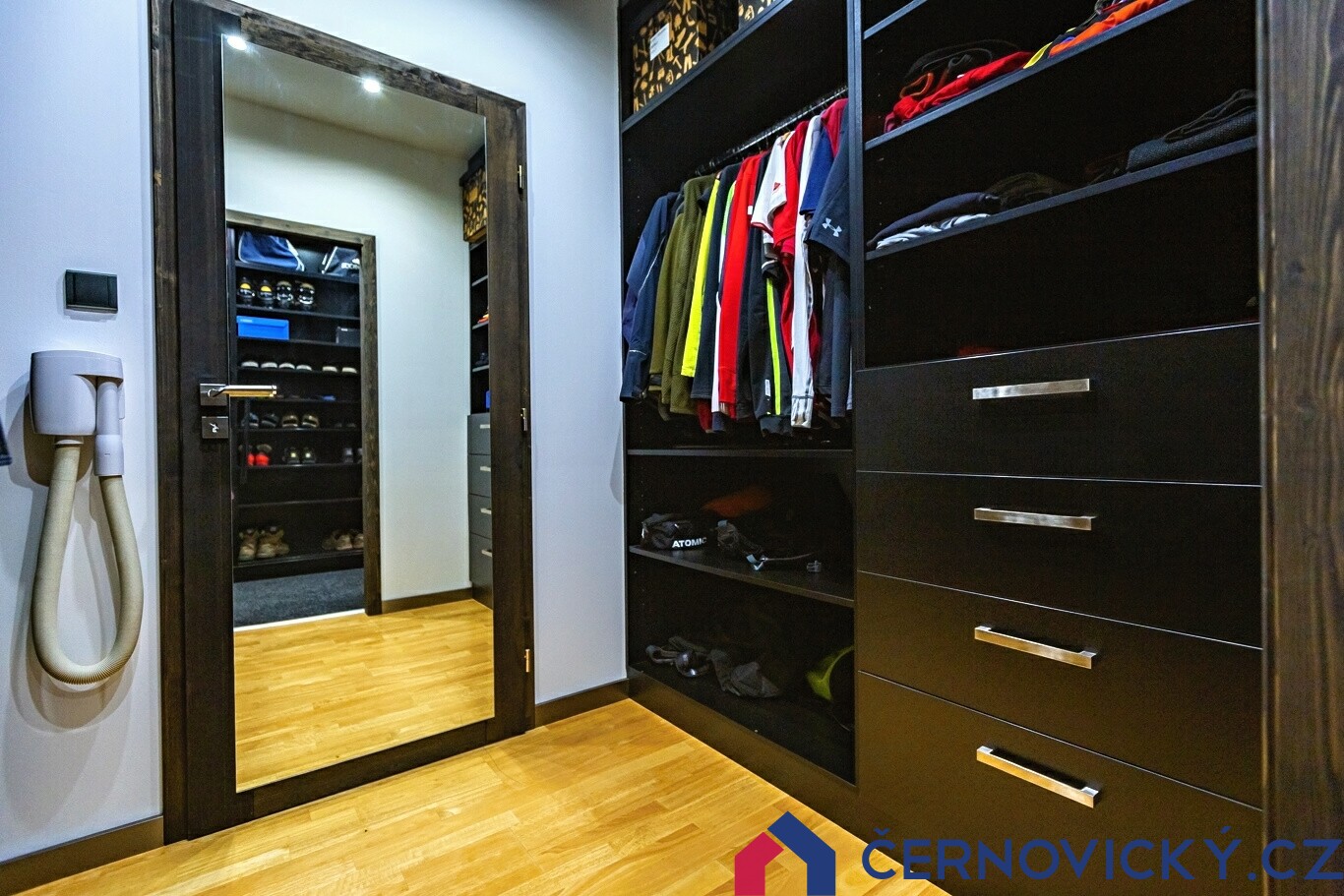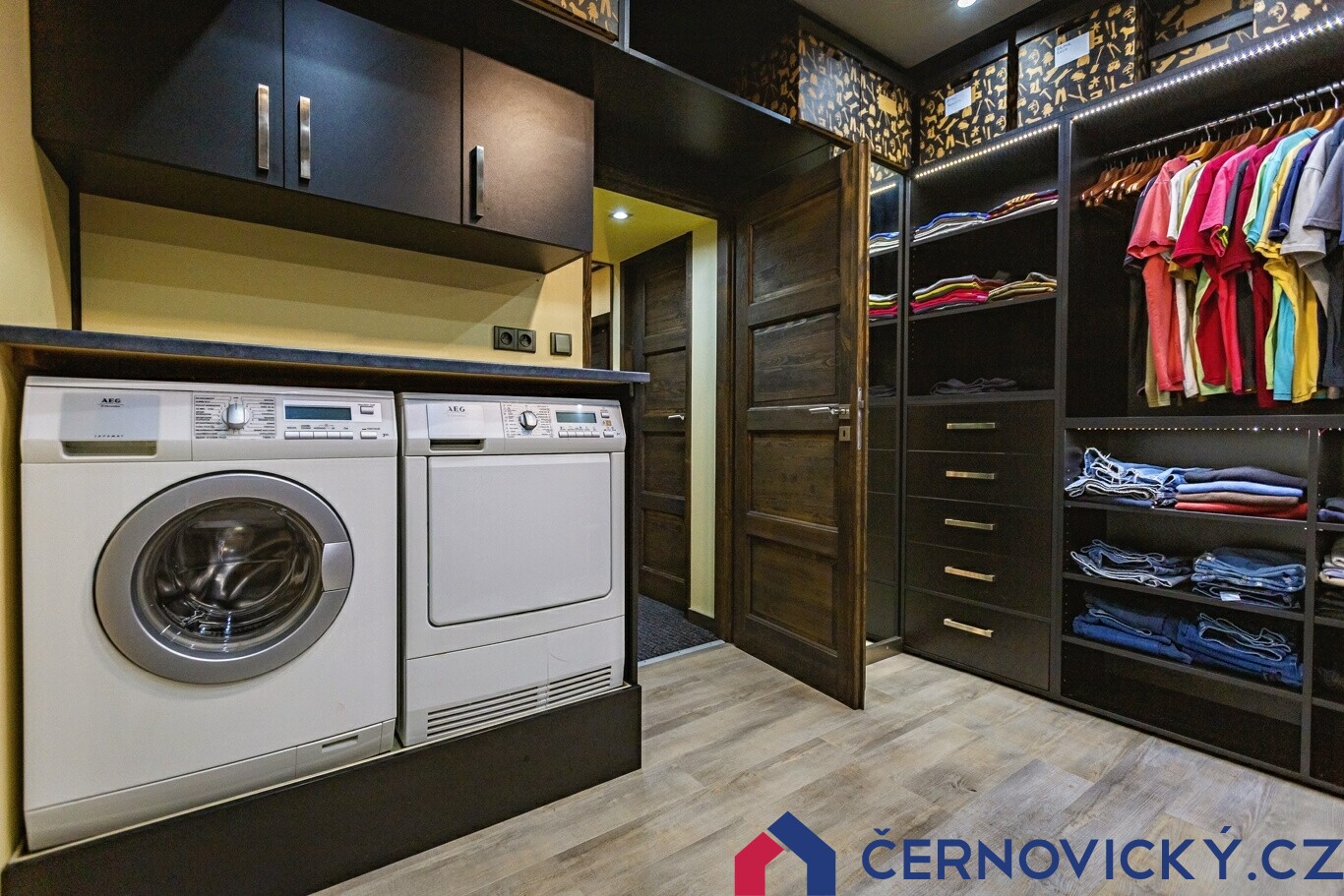 Za rohem u ložnice se nachází i šatna. To nejdůležitější tedy máte hned pěkně po ruce. V místnostech, které k tomu nejsou vyhrazeny, vám nebude strašit žádný nábytek pro skladování vašeho šatníku. Šatny jsou v tomto domě hned dvě, tato je využitá i pro umístění pračky se sušičkou.