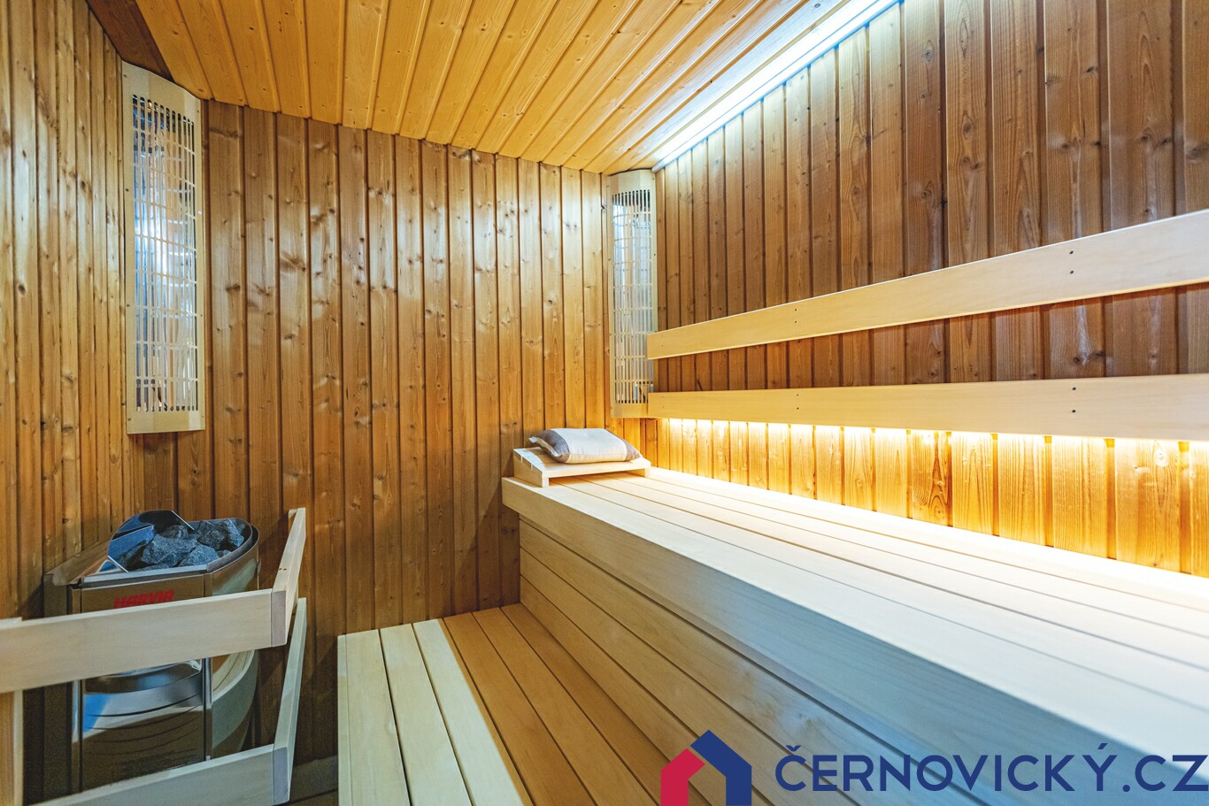 Sauna je hybridní, tedy kombinace finské a infra sauny v jednom. Šířka sauny je 2.1 metru, výška 2 metry a hloubka 1.5 metru. Je vybavena kamny Harvia Vega (8 kW) a pro provoz infra sauny má 5 zářičů Philips VitaE. Spotřeba sauny finským způsobem (80-100°C) na dvě hodiny je 7 kWh, tedy cca 20 Kč.