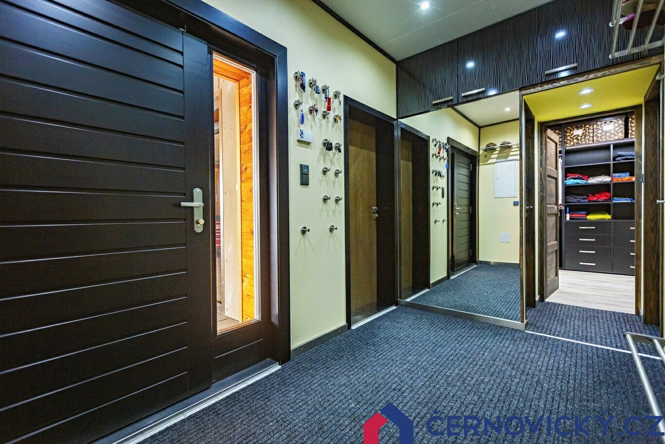 Centrální chodba domu je obložena dřevem a osvětlena bodovým světlem ve dvou úrovních. Dveře přímo naproti vedou do ložnice, vpravo je potom druhá koupelna, do které se přesuneme.