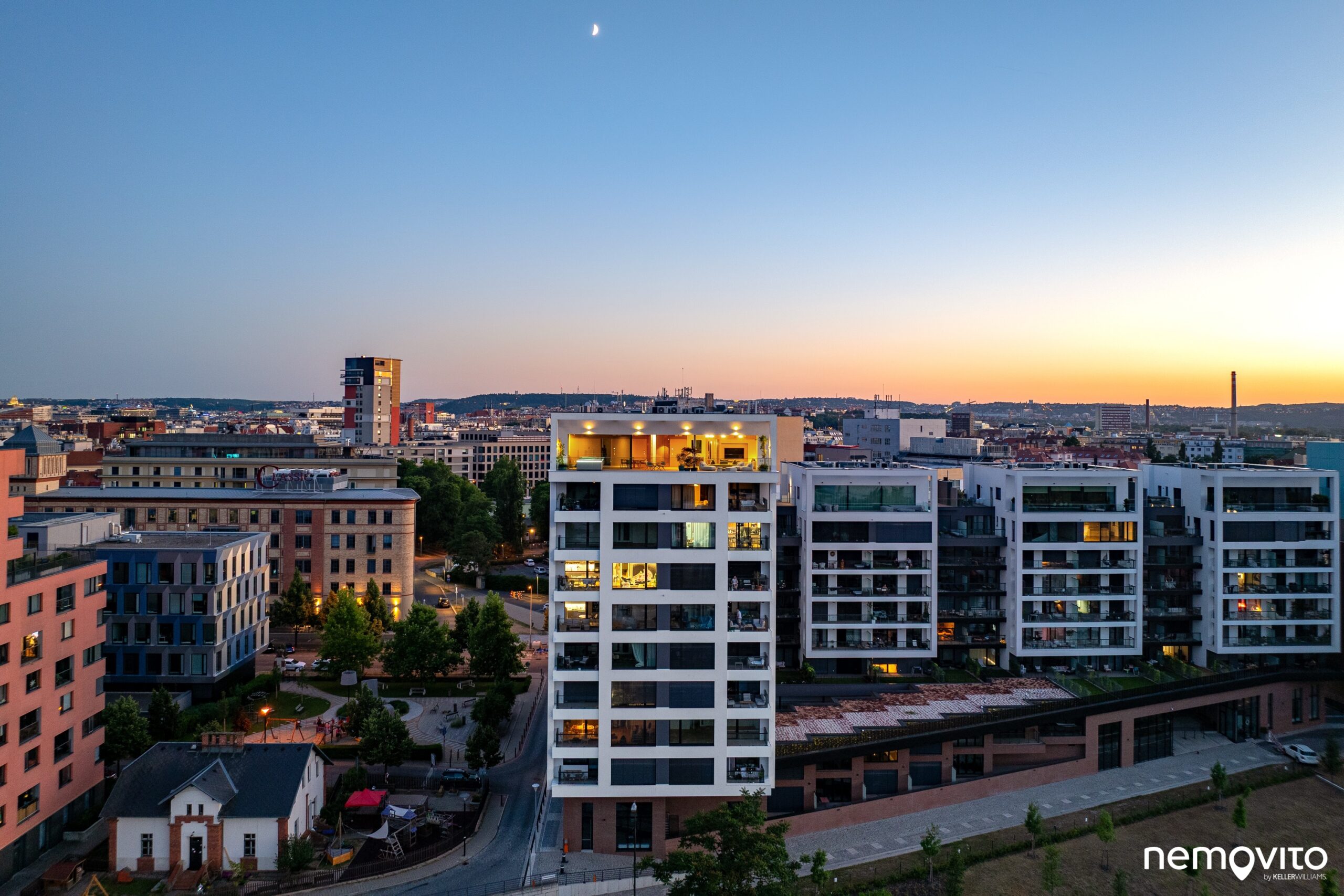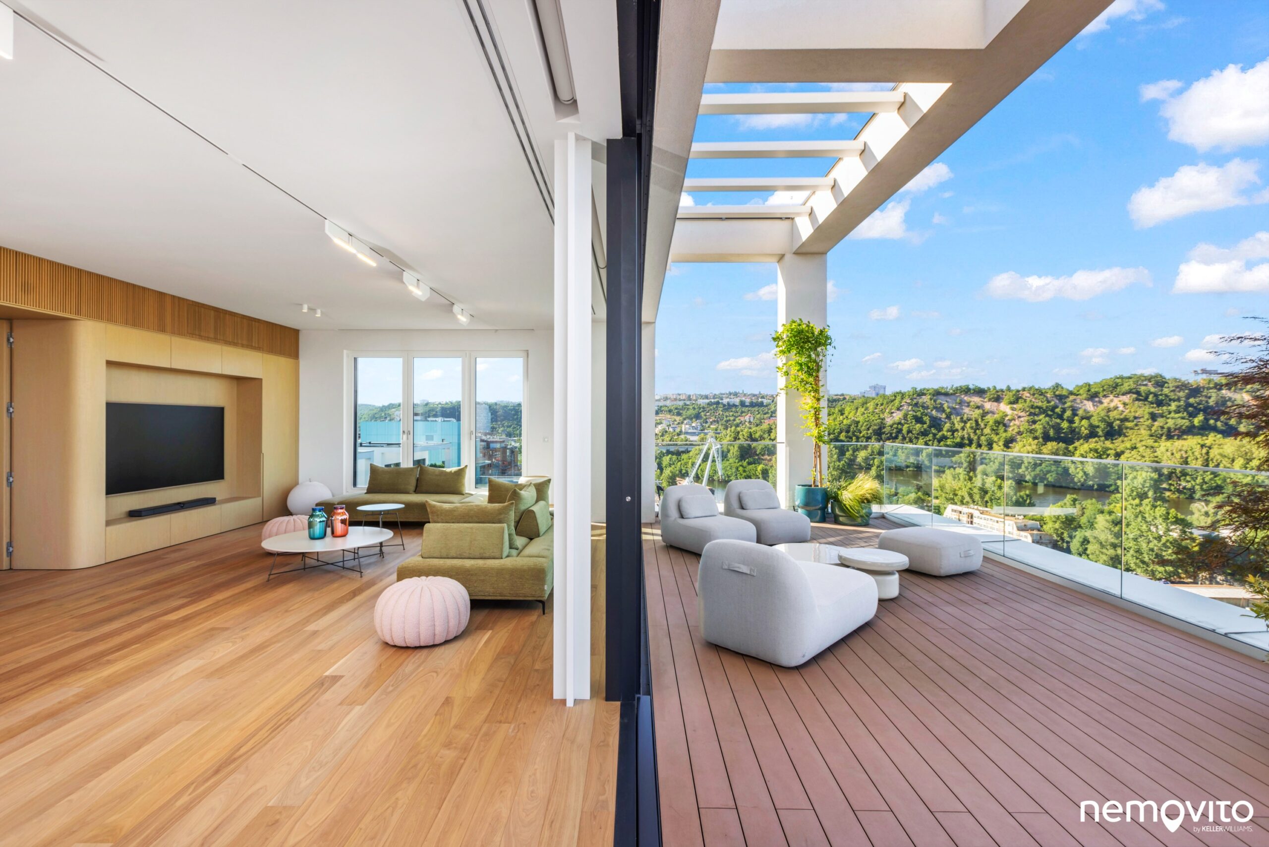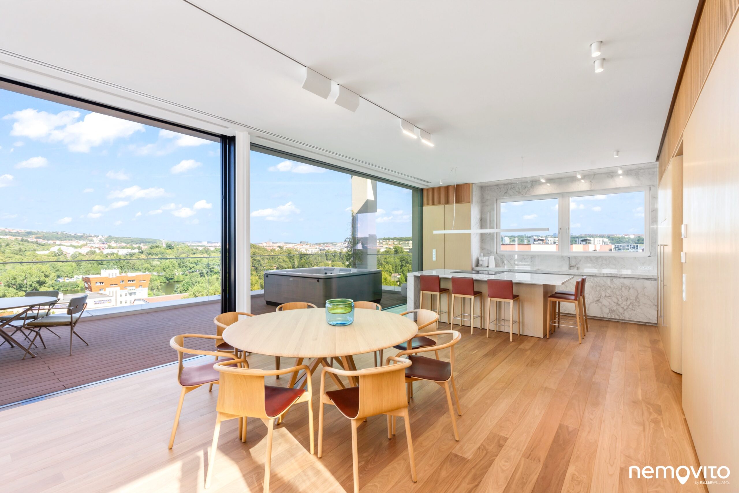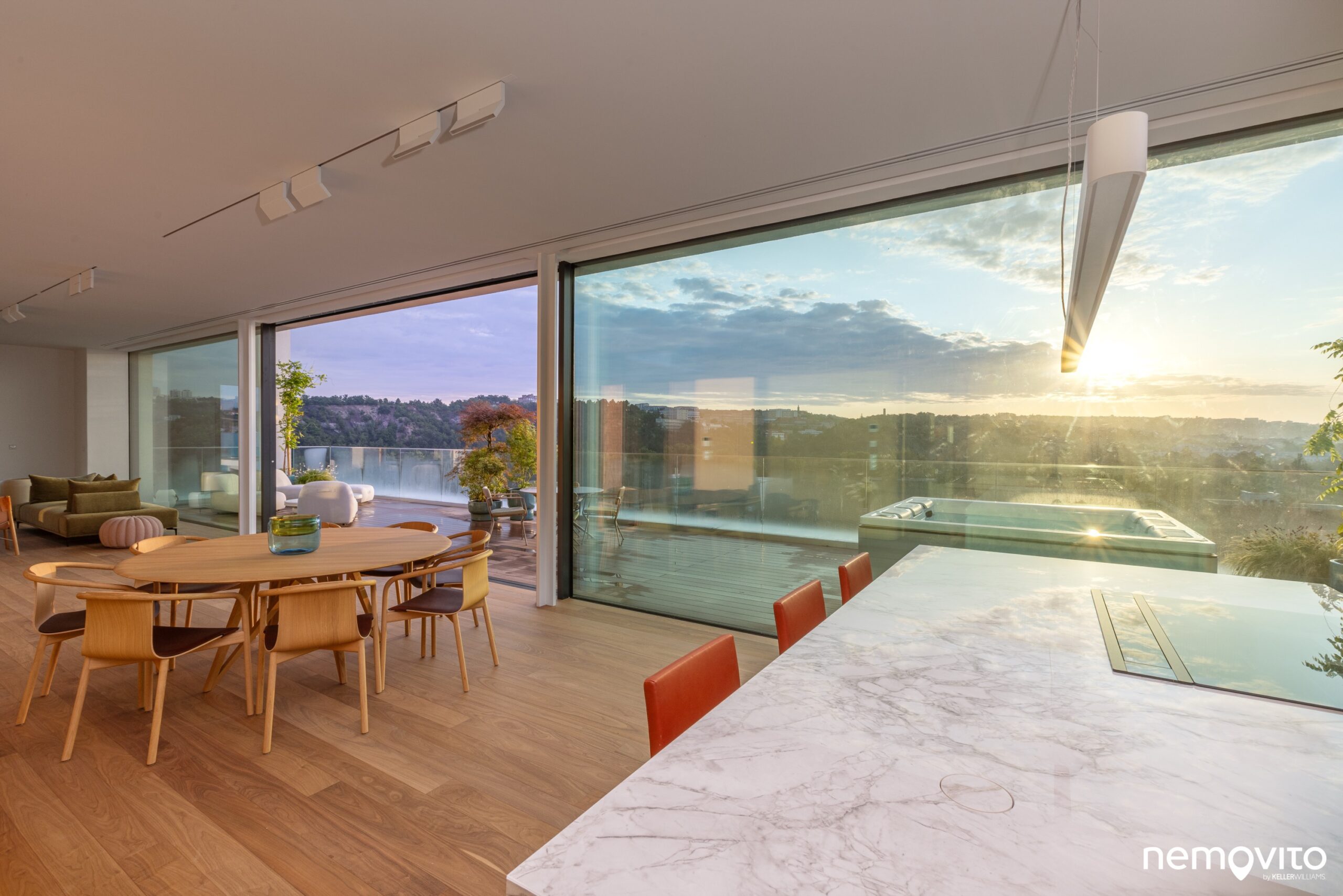 Byt o ploše solidního rodinné domu, ke kterému náleží dvě garáže, dvě garážová stání, dva sklepy, dva balkony a velká terasa, zabírá celé poslední podlaží domu a nabízí panoramatické výhledy do širokého okolí. Na hranici technologických možností bylo realizováno obrovské, 17 metrů dlouhé okno, které tvoří celou východní stěnu bytu, a při jeho otevření dojde k naprostému propojení s exteriérem. Je jedním ze signature prvků tohoto špičkového penthouse, který si jako jeden z mála na penthouse nehraje, ale skutečně jím je. Dechberoucí výhledy, které zažijete především při východu slunce, můžete pozorovat bez ohledu na venkovní podmínky. V bytě nechybí kompletní stínění a klimatizace, prostřednictvím kterých uchováte teplotní komfort na vámi požadovaných parametrech.