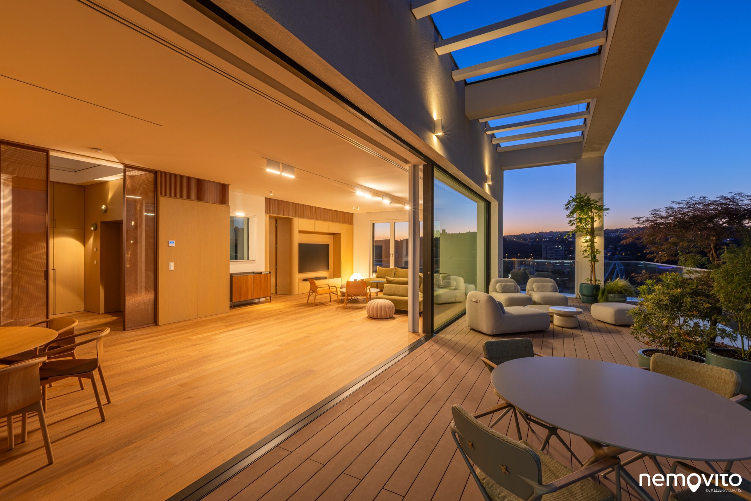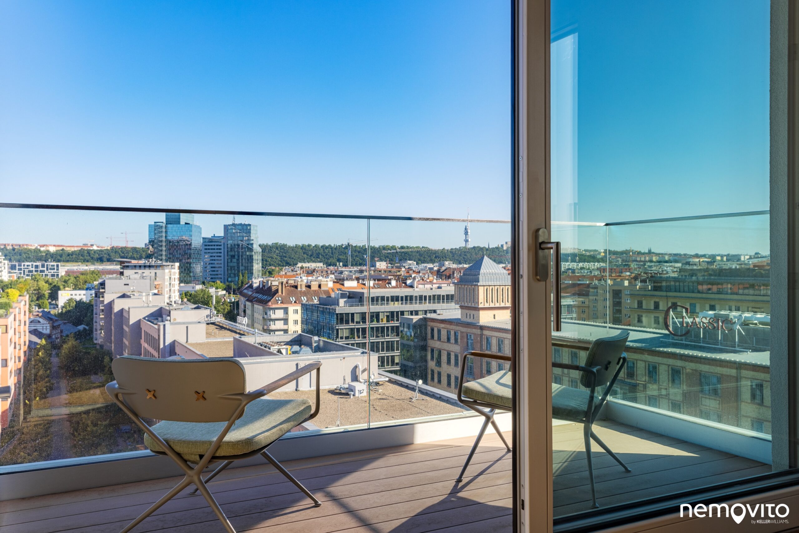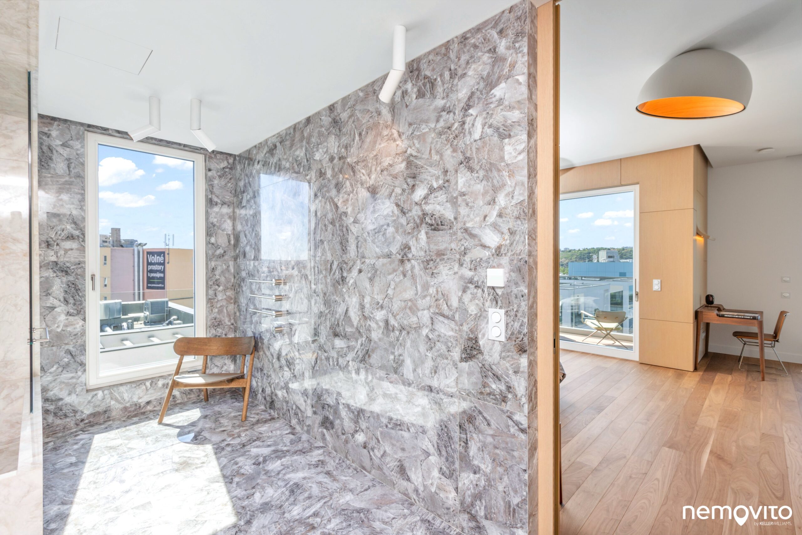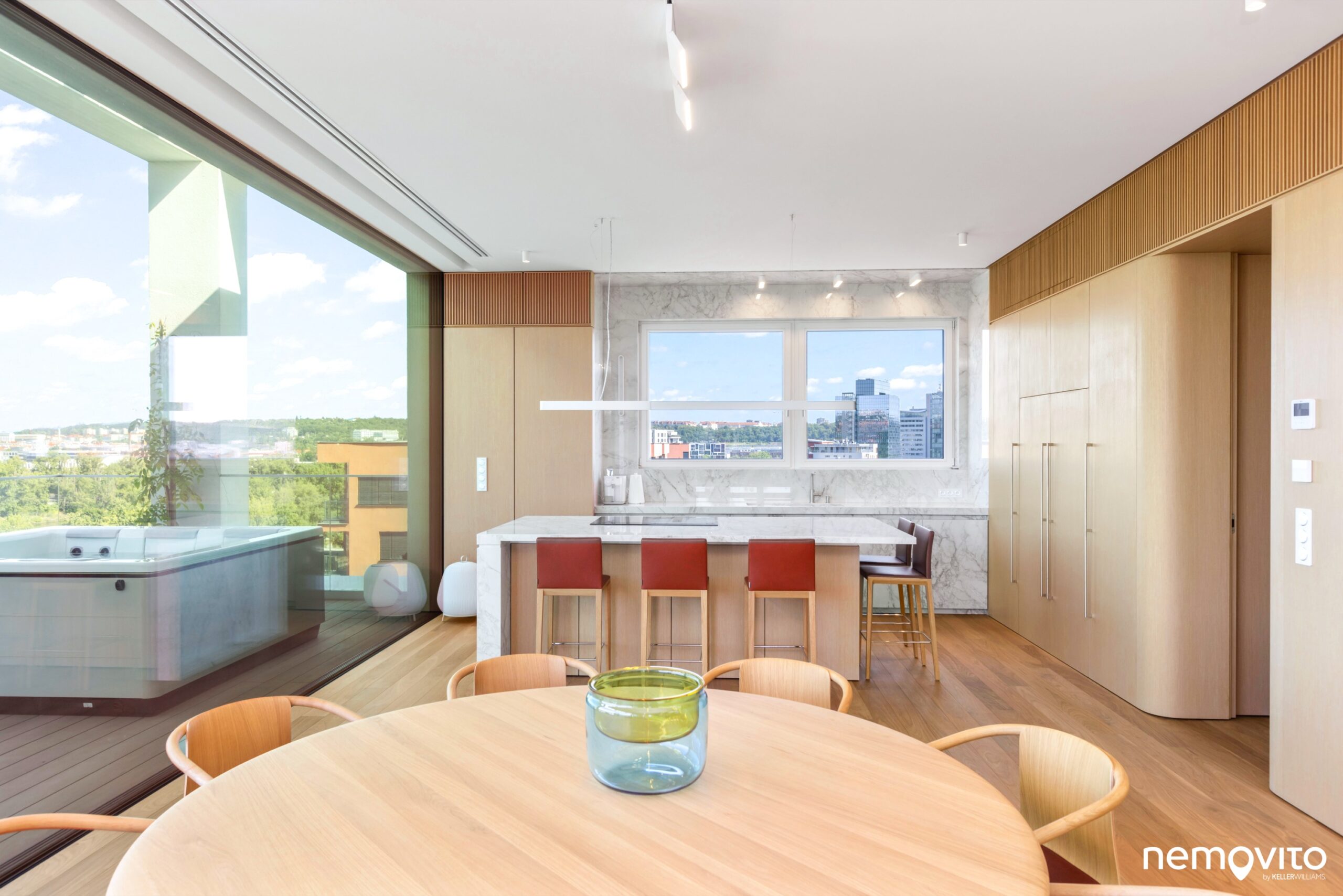 Byt o ploše solidního rodinné domu, ke kterému náleží dvě garáže, dvě garážová stání, dva sklepy, dva balkony a velká terasa, zabírá celé poslední podlaží domu a nabízí panoramatické výhledy do širokého okolí. Na hranici technologických možností bylo realizováno obrovské, 17 metrů dlouhé okno, které tvoří celou východní stěnu bytu, a při jeho otevření dojde k naprostému propojení s exteriérem. Je jedním ze signature prvků tohoto špičkového penthouse, který si jako jeden z mála na penthouse nehraje, ale skutečně jím je. Dechberoucí výhledy, které zažijete především při východu slunce, můžete pozorovat bez ohledu na venkovní podmínky. V bytě nechybí kompletní stínění a klimatizace, prostřednictvím kterých uchováte teplotní komfort na vámi požadovaných parametrech.