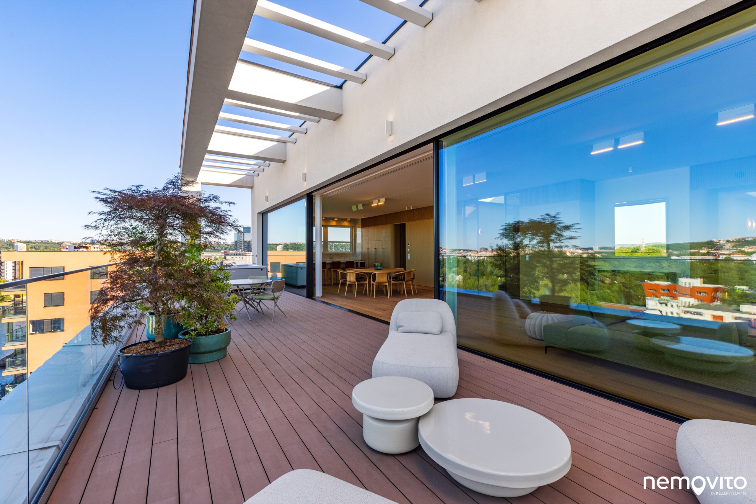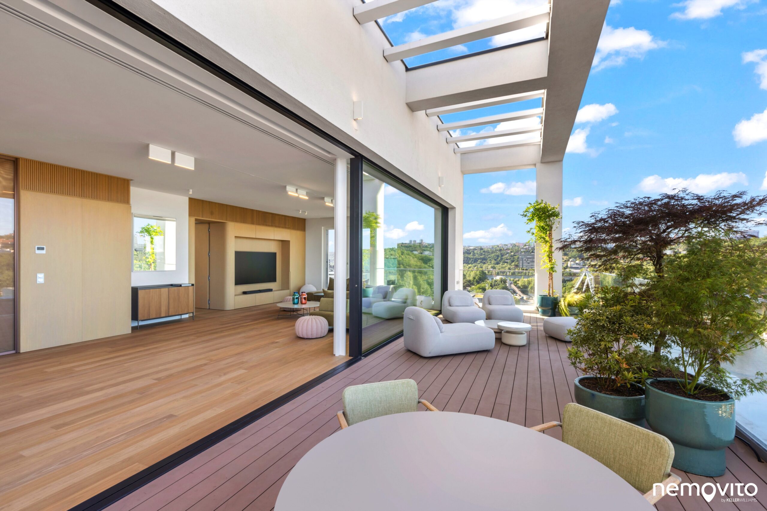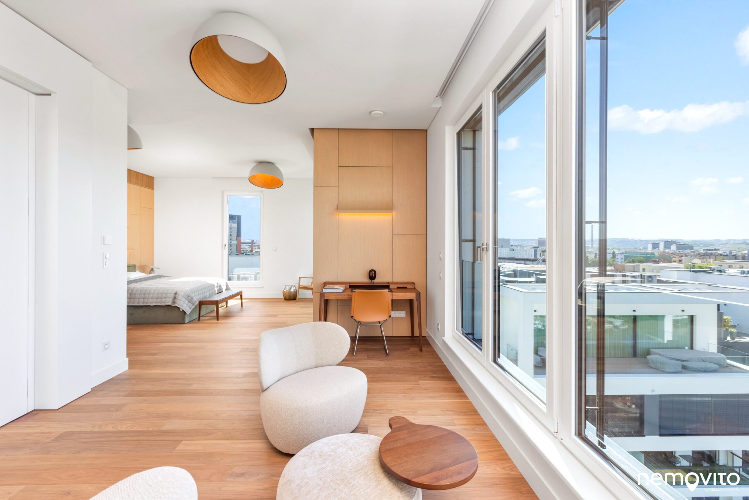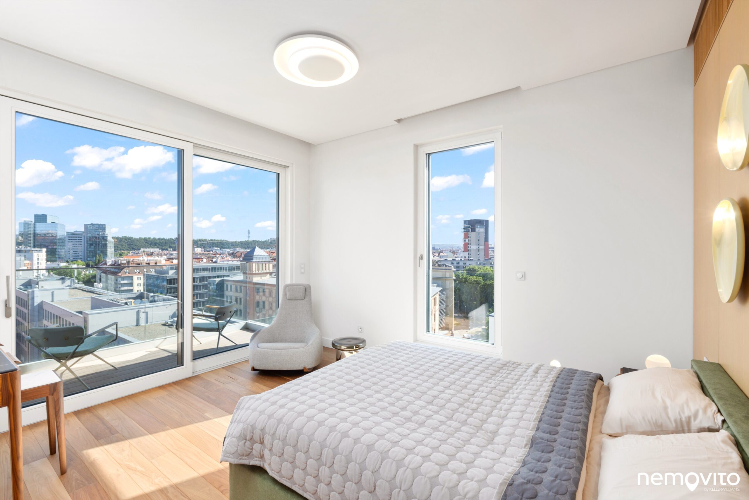 Byt o ploše solidního rodinné domu, ke kterému náleží dvě garáže, dvě garážová stání, dva sklepy, dva balkony a velká terasa, zabírá celé poslední podlaží domu a nabízí panoramatické výhledy do širokého okolí. Na hranici technologických možností bylo realizováno obrovské, 17 metrů dlouhé okno, které tvoří celou východní stěnu bytu, a při jeho otevření dojde k naprostému propojení s exteriérem. Je jedním ze signature prvků tohoto špičkového penthouse, který si jako jeden z mála na penthouse nehraje, ale skutečně jím je. Dechberoucí výhledy, které zažijete především při východu slunce, můžete pozorovat bez ohledu na venkovní podmínky. V bytě nechybí kompletní stínění a klimatizace, prostřednictvím kterých uchováte teplotní komfort na vámi požadovaných parametrech.