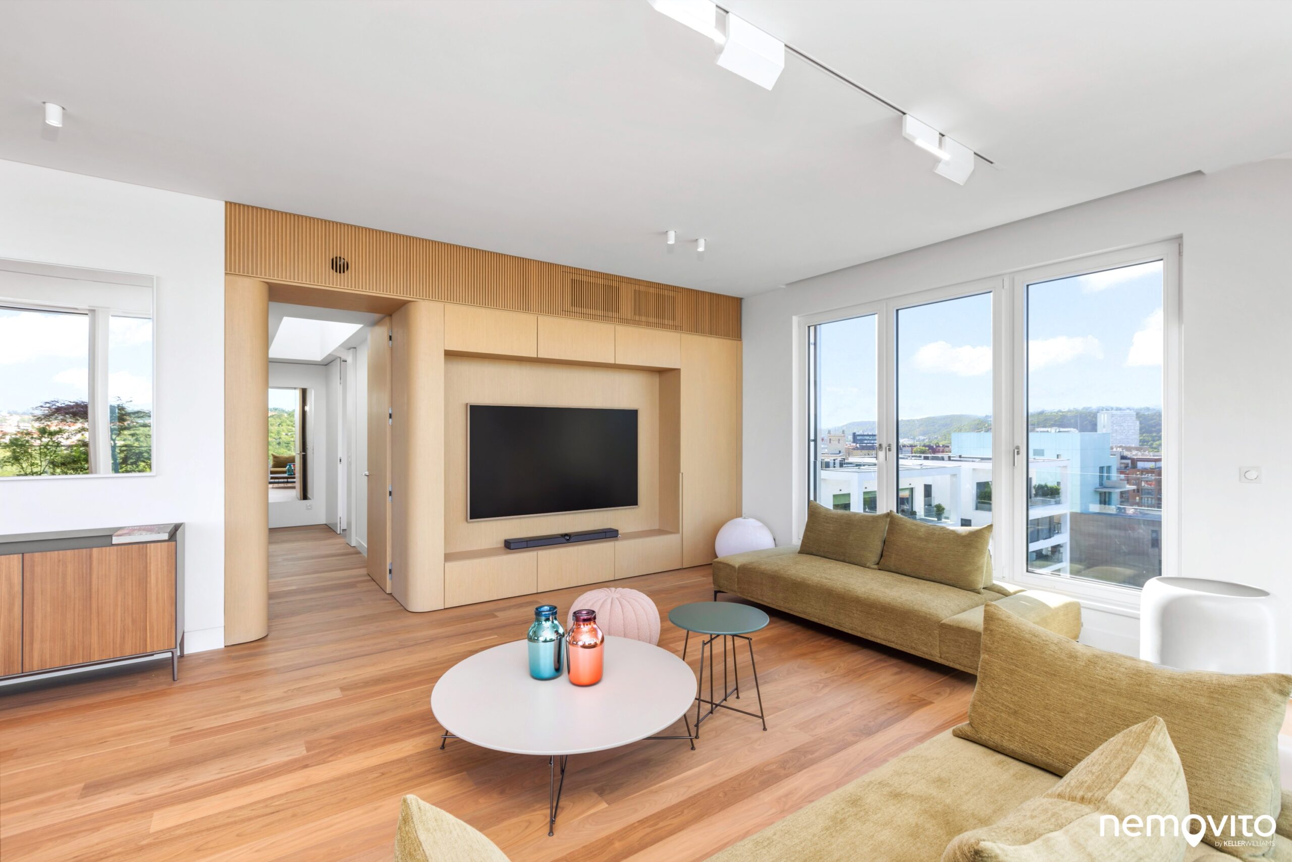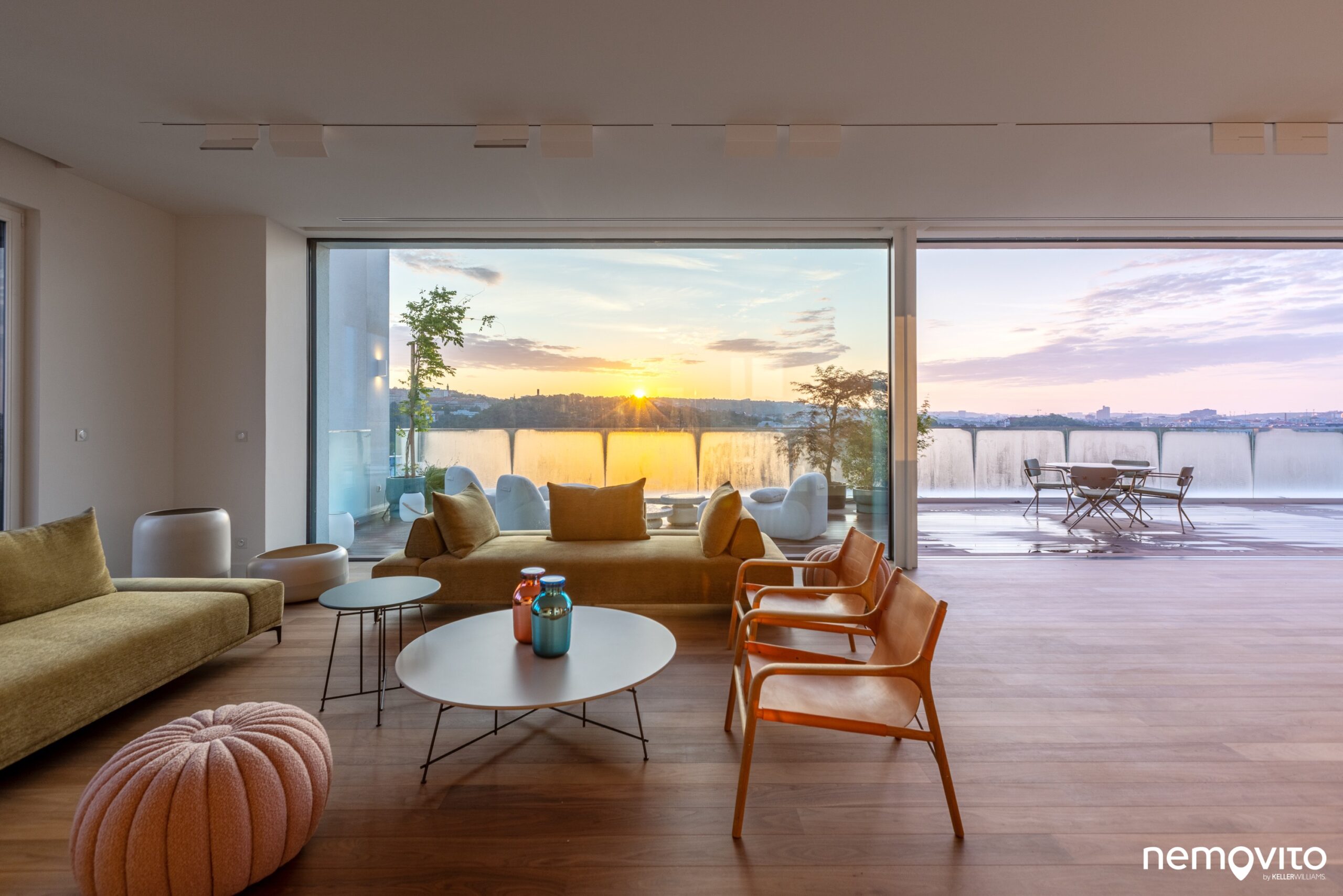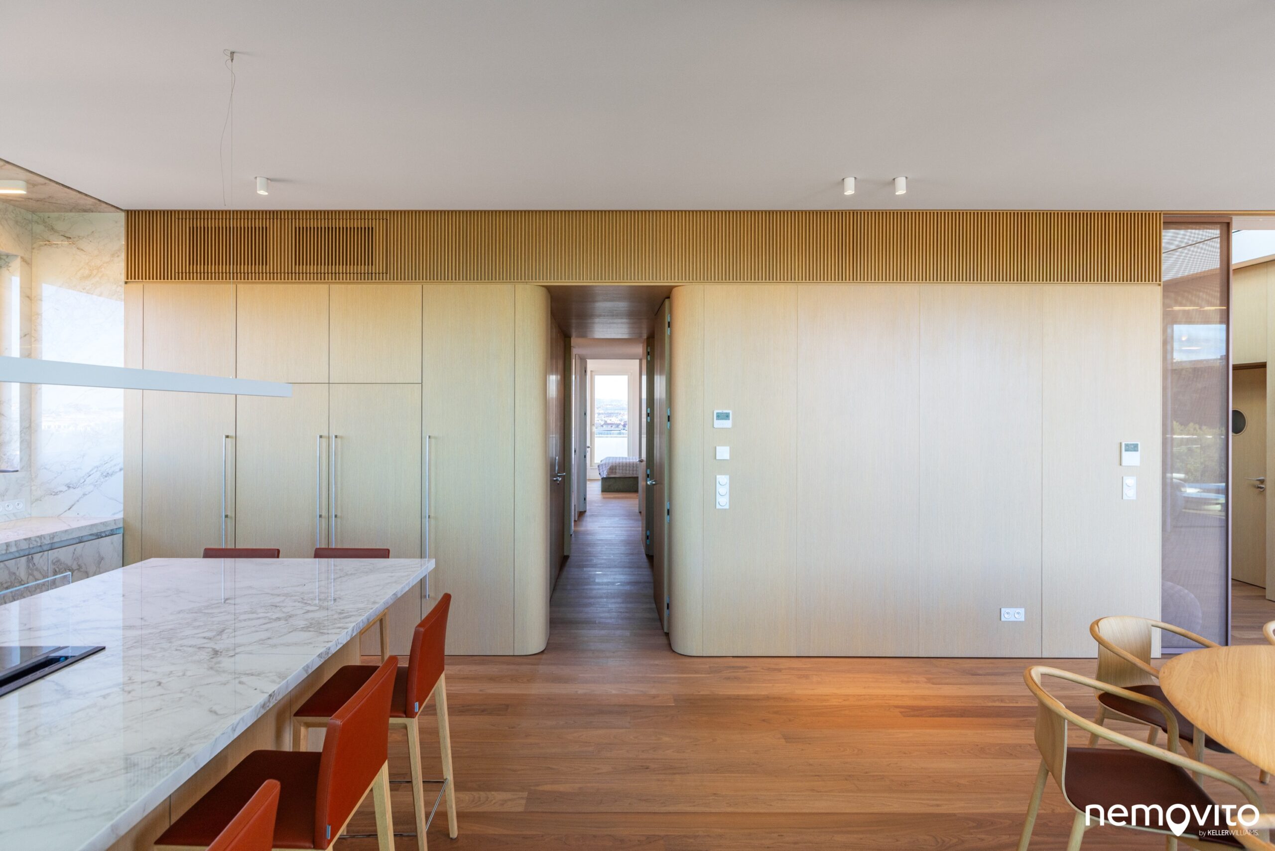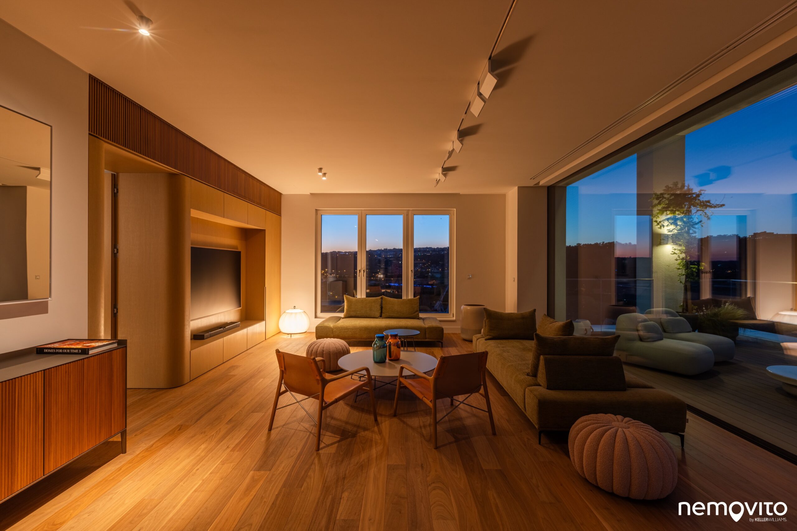 Byt o ploše solidního rodinné domu, ke kterému náleží dvě garáže, dvě garážová stání, dva sklepy, dva balkony a velká terasa, zabírá celé poslední podlaží domu a nabízí panoramatické výhledy do širokého okolí. Na hranici technologických možností bylo realizováno obrovské, 17 metrů dlouhé okno, které tvoří celou východní stěnu bytu, a při jeho otevření dojde k naprostému propojení s exteriérem. Je jedním ze signature prvků tohoto špičkového penthouse, který si jako jeden z mála na penthouse nehraje, ale skutečně jím je. Dechberoucí výhledy, které zažijete především při východu slunce, můžete pozorovat bez ohledu na venkovní podmínky. V bytě nechybí kompletní stínění a klimatizace, prostřednictvím kterých uchováte teplotní komfort na vámi požadovaných parametrech.