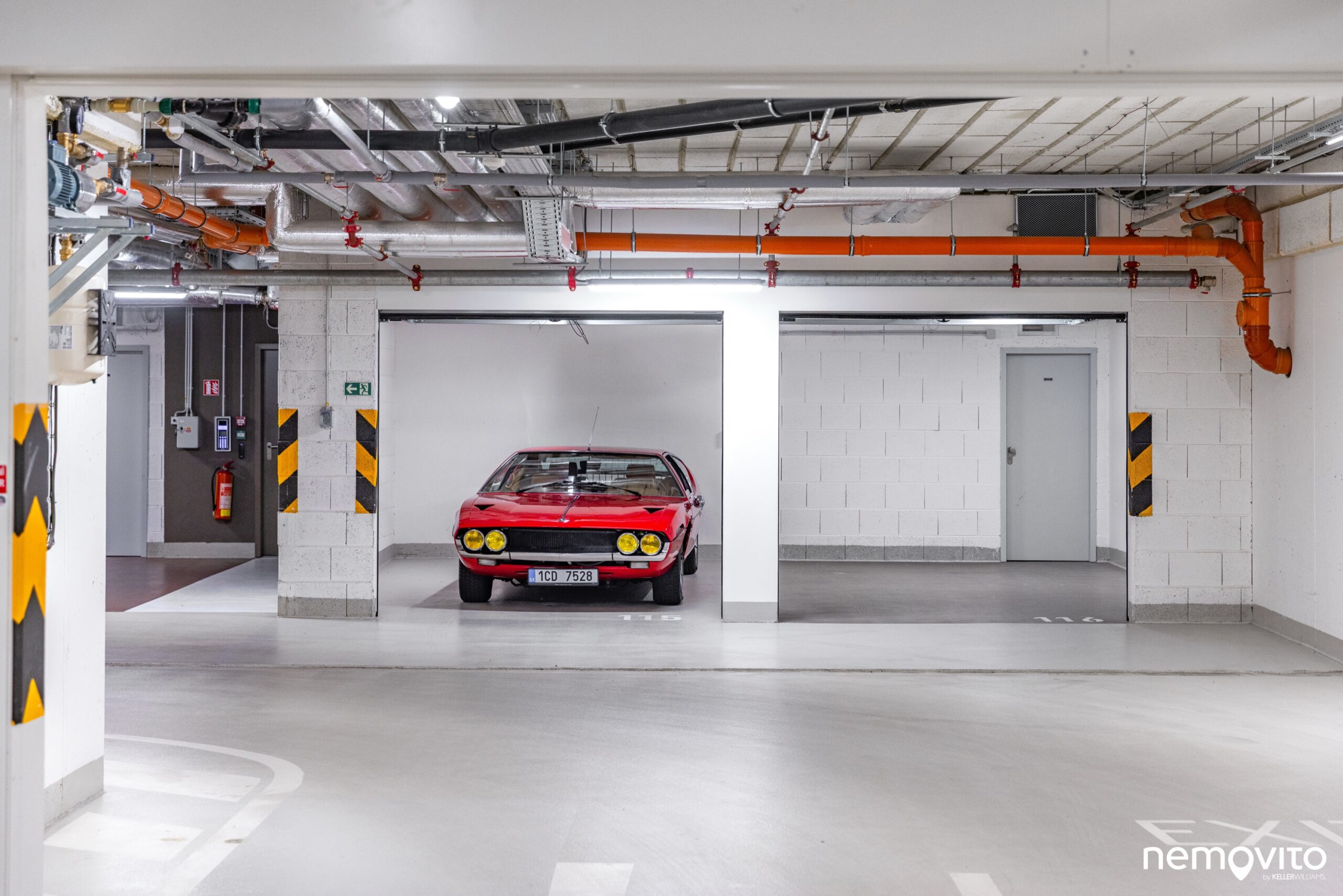 Ostatně vaše mechanické řemeslné výrobky můžete v tomto bytě bez obav skladovat i dole. Dvě samostatné garáže s velkým úložným prostorem za nimi, další dvě stání s druhým sklepem za rohem.
