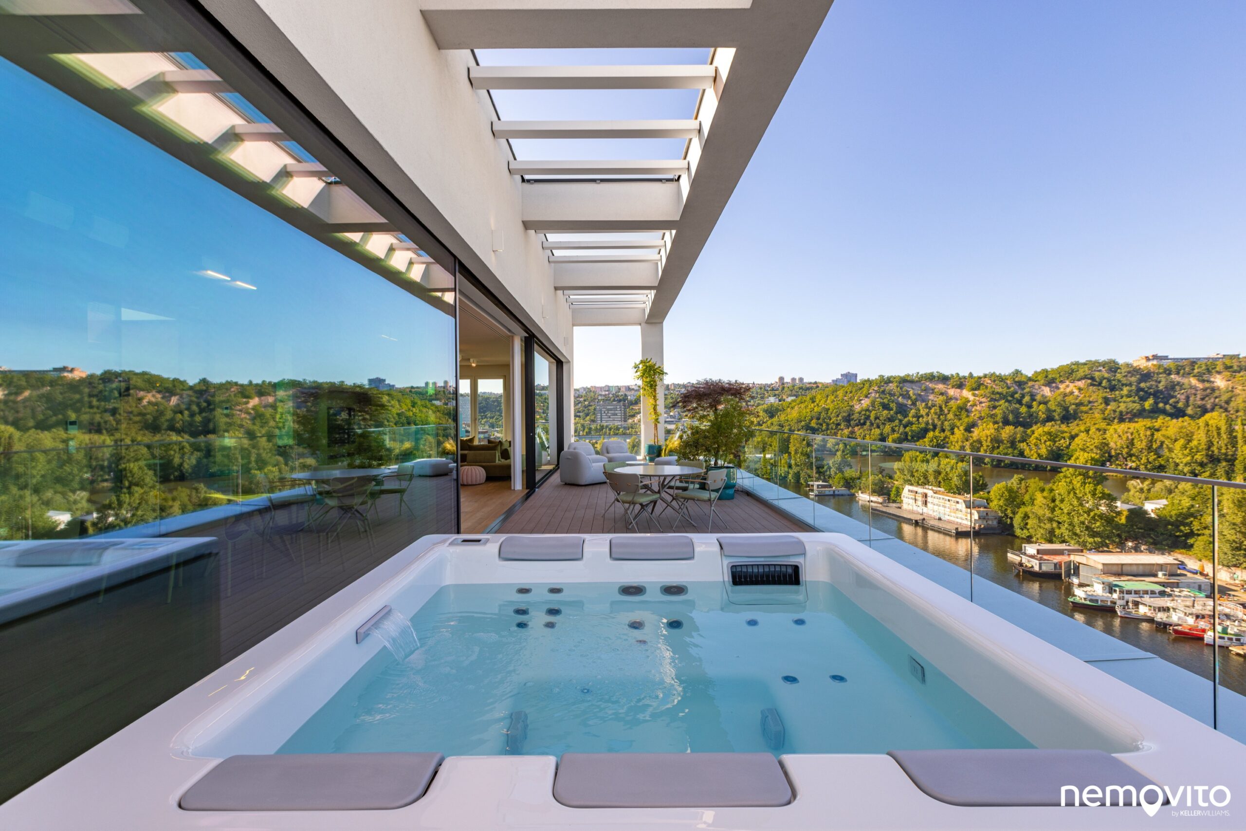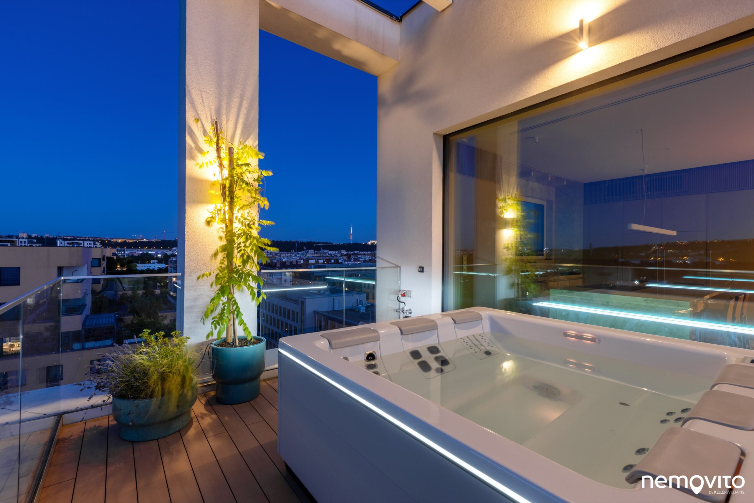 Terasa má vysokou nosnost. Mimo vířivky, která je na ní aktuálně umístěná, může fungovat klidně jako zahrada - tak jako u dalších penthouse ve starší etapě projektu.