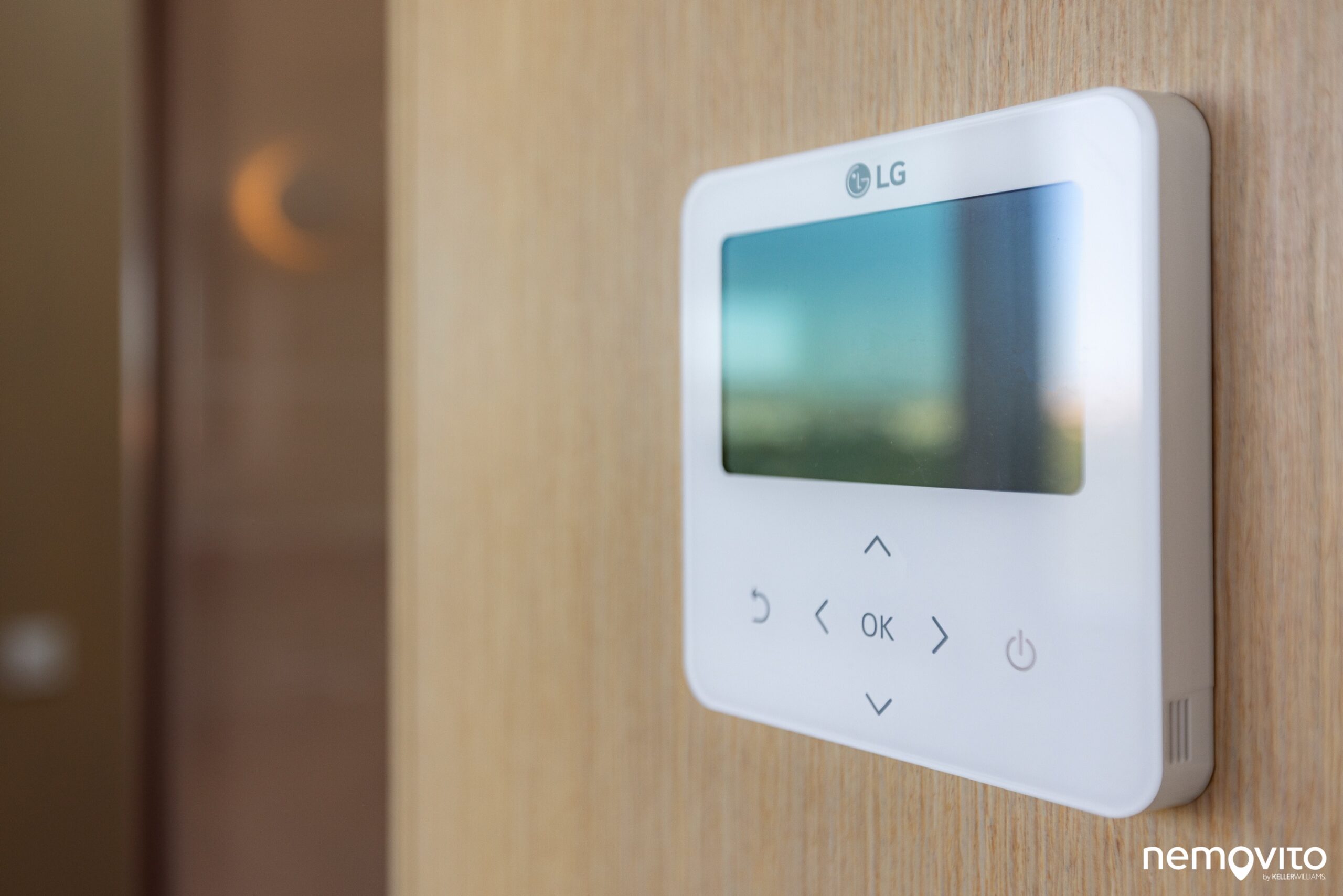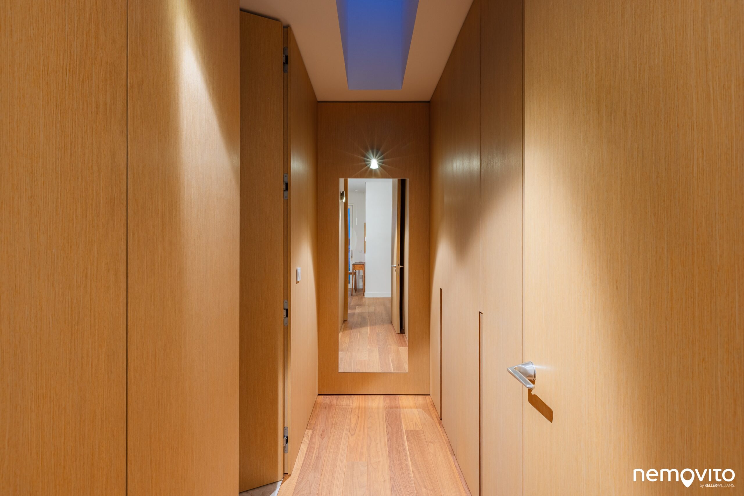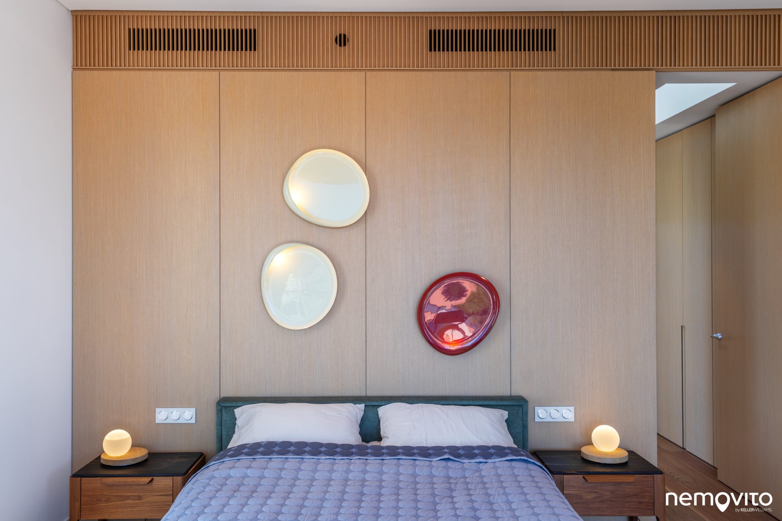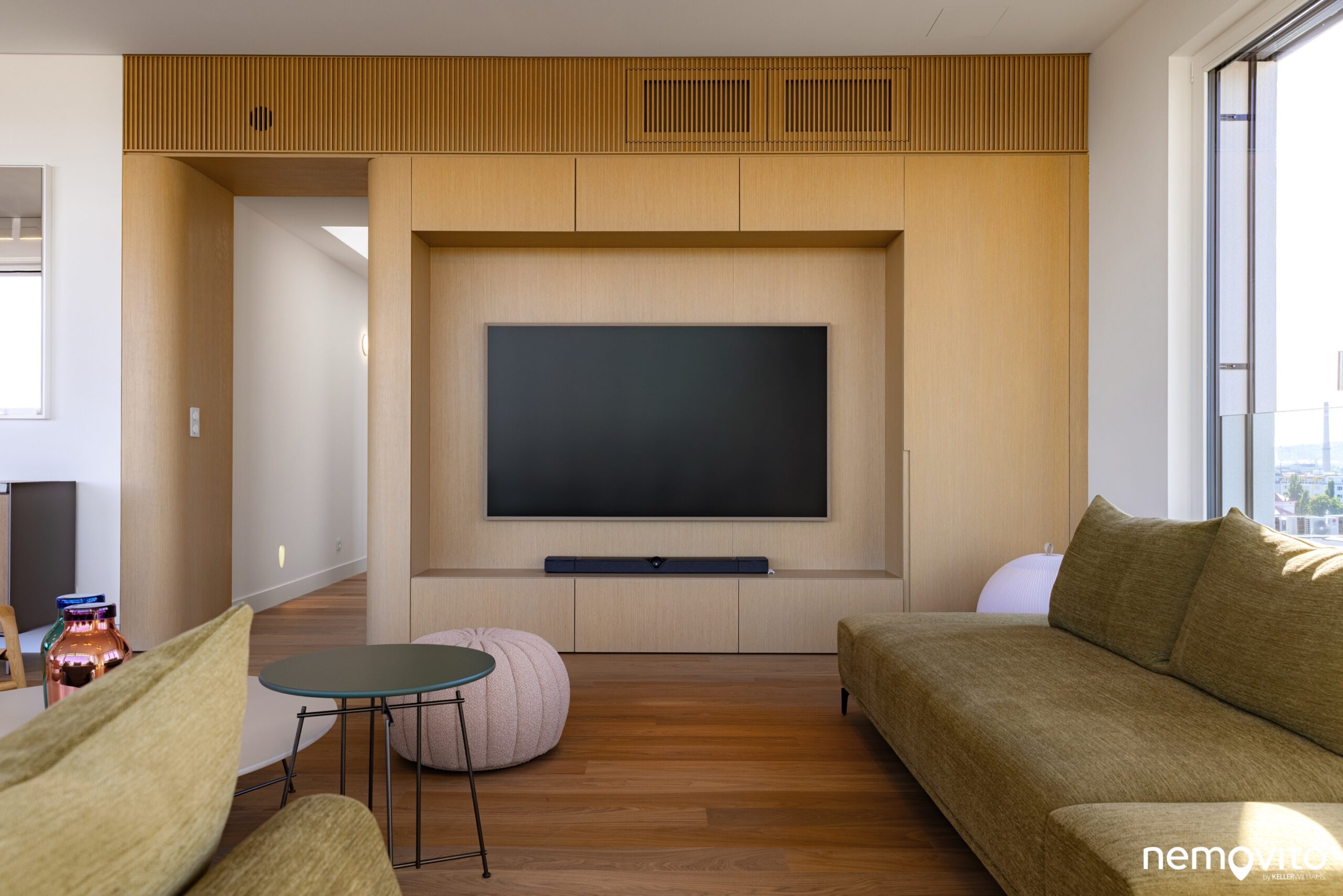 Ačkoliv je v bytě klimatizace, její výdechy na první pohled nespatříte. Jsou ukryté v dřevěném obložení stěn. Zrovna tak spousta skříní a úložného prostoru.