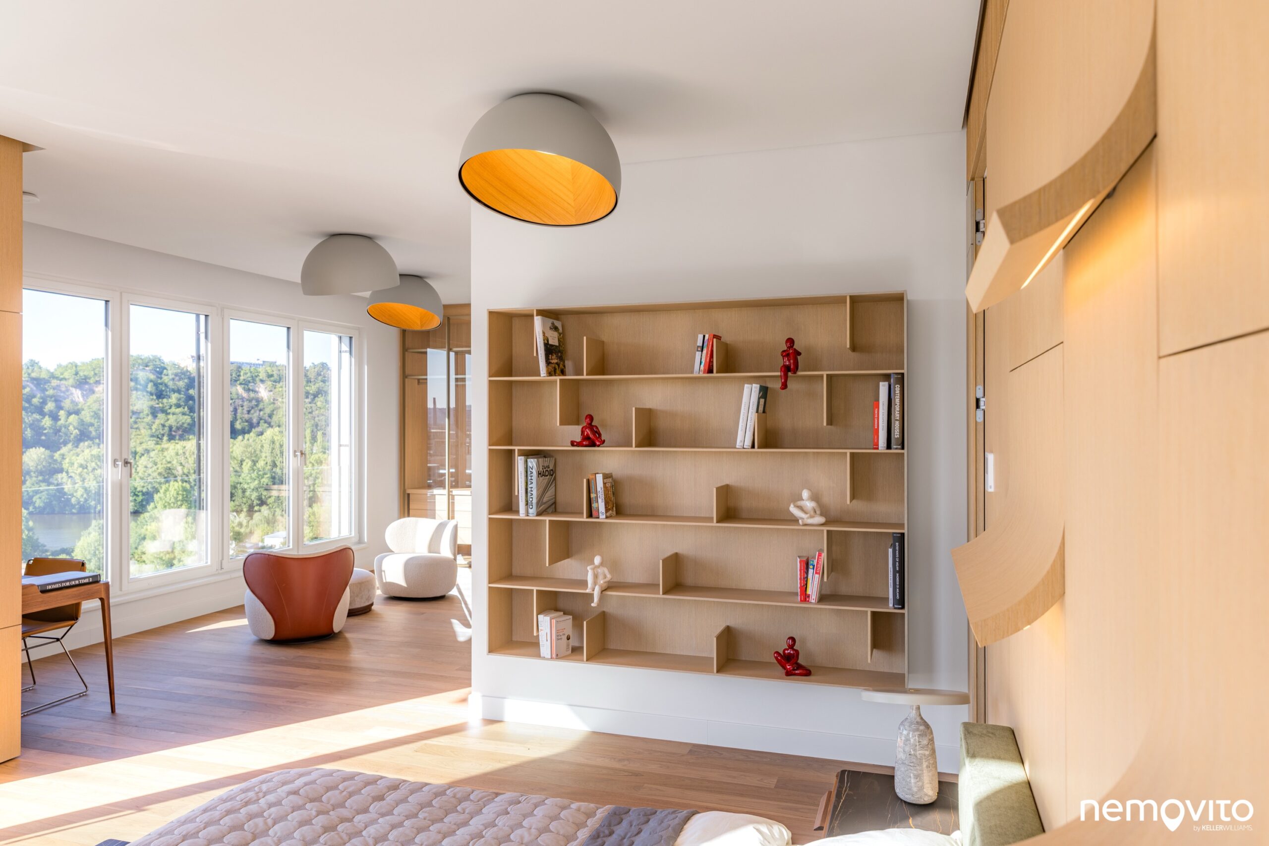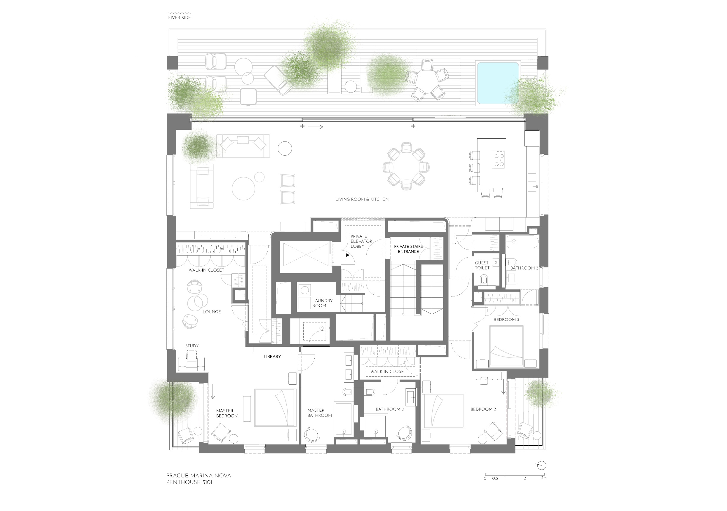 Šatna, pracovna, místo pro posezení s výhledem na řeku, ložnice s knihovnou a vlastní koupelnou. Dohromady 43 m2.
