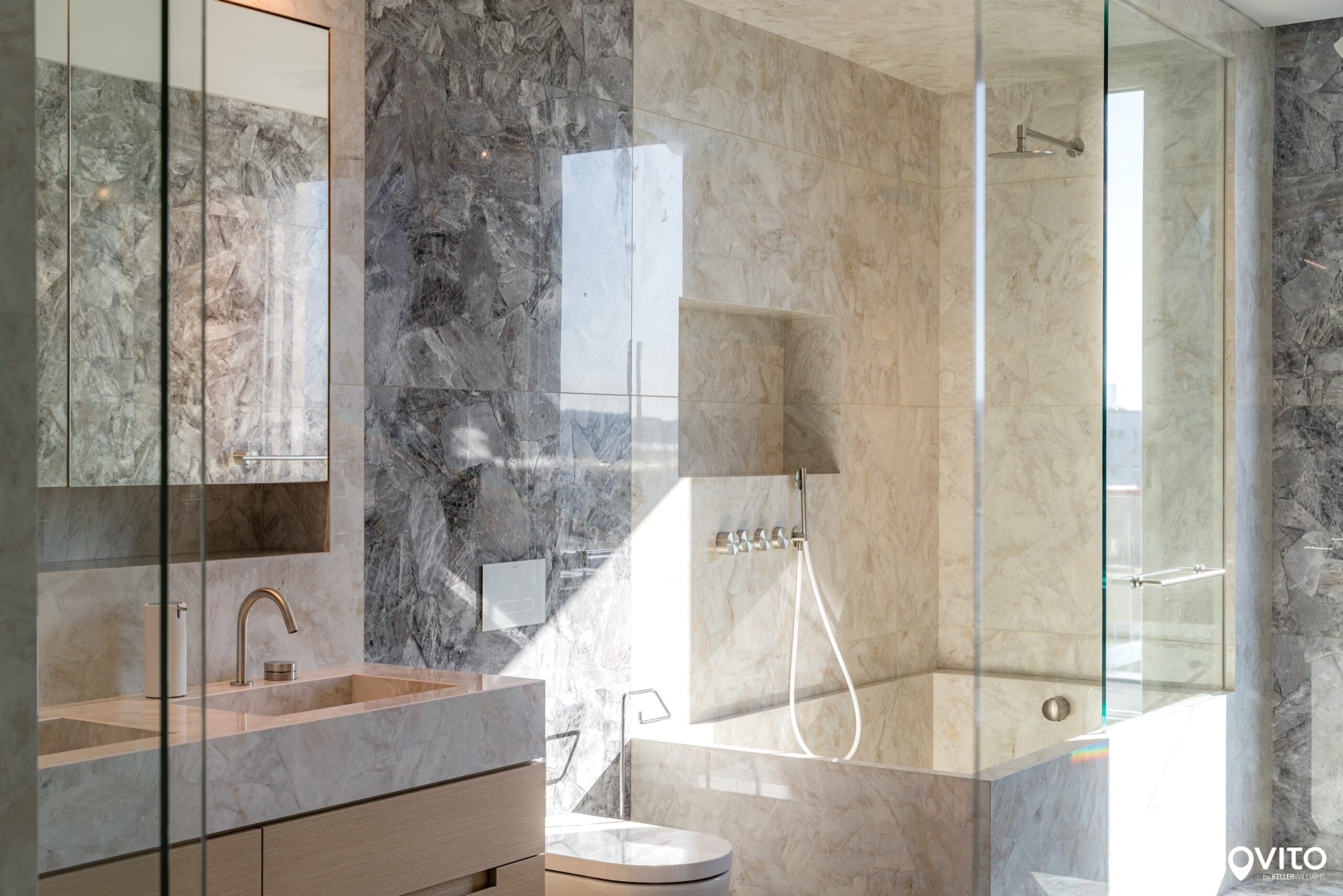 Celý návrh bytu je dílem špičkového architekta a designéra (architektem projektu je Gal Karagula, interiéry má na svědomí Ynon Goren). Zejména pak koupelny svou kvalitu potvrdí až v čase, který prokáže jejich nadčasové řešení.