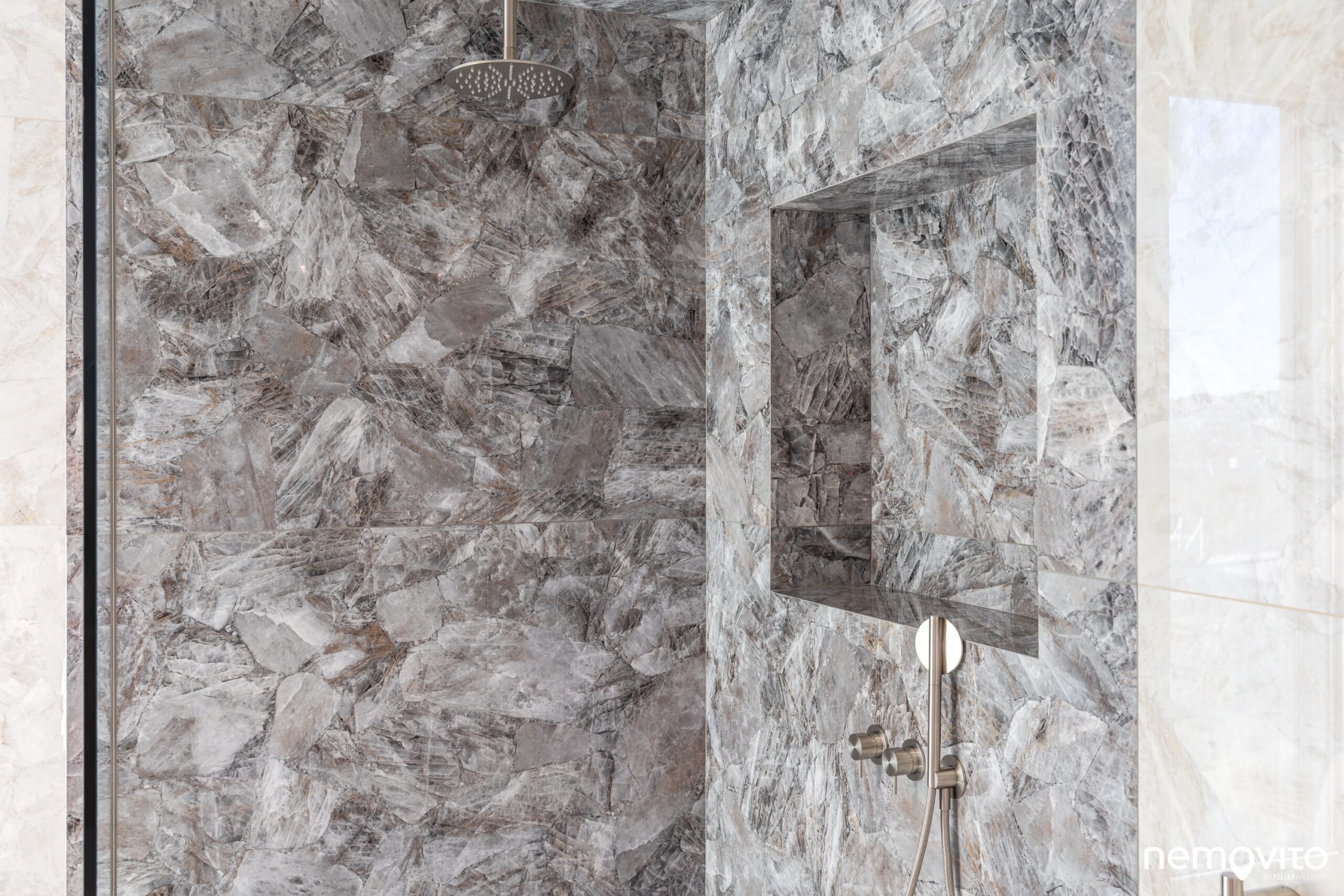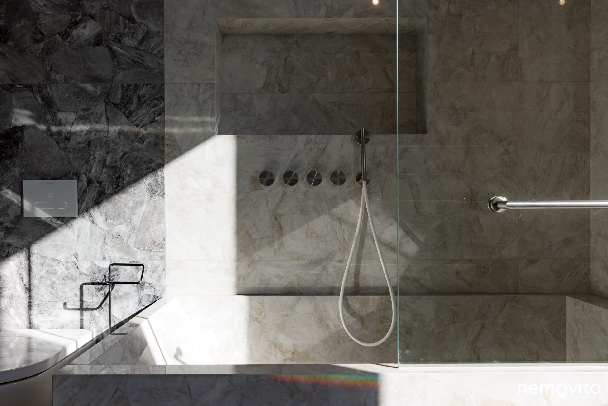 Koupelny mají jednotný ráz a řídí se myšlenkou minimalismu, přesto však tradičního. Kamenný dekor, kamenické rohy, celoplošné obložení a minimum rušivých elementů.