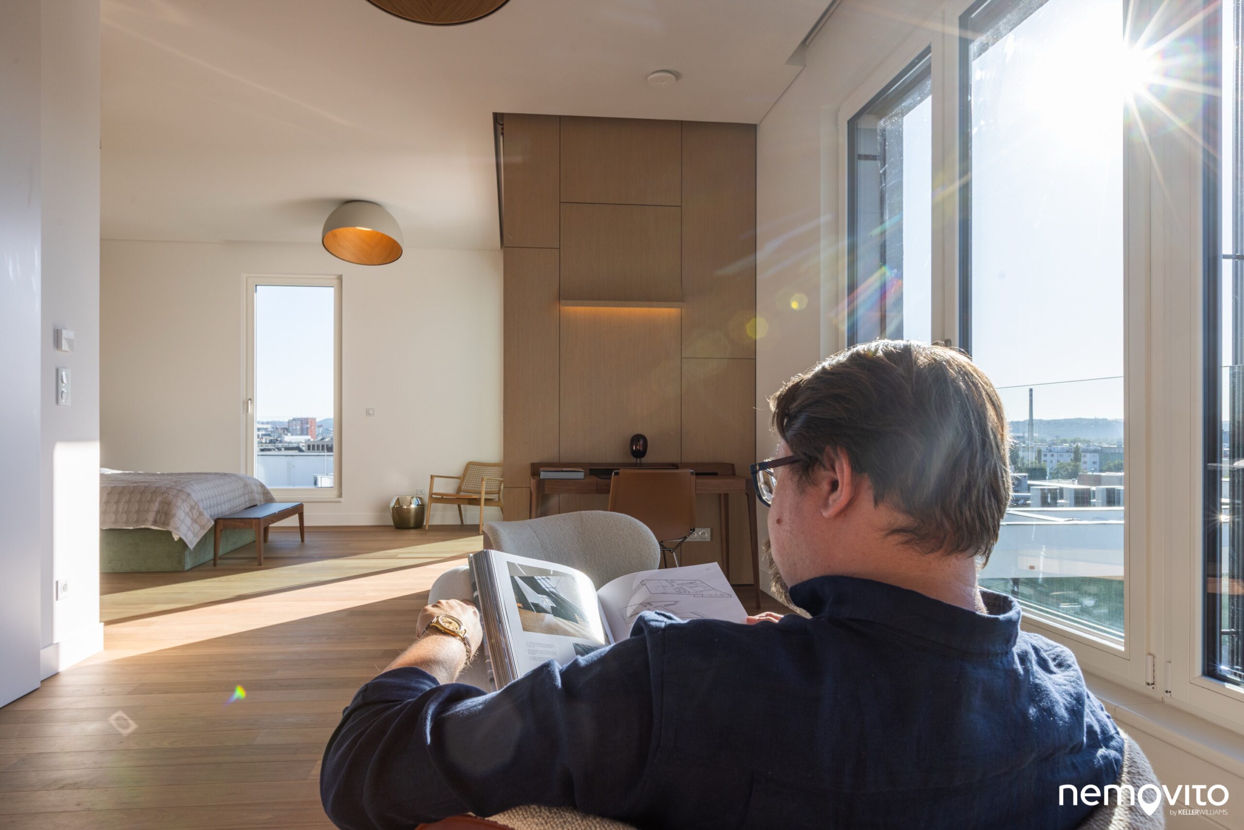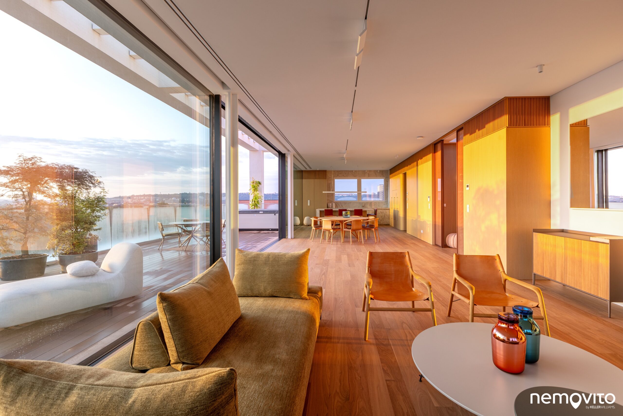 Celé horní podlaží nejvyššího domu projektu. Čelní stěnu bytu tvoří 17 metrů široké okno, které vás propojí s terasou (74 m2) s fantastickým výhledem. Především pak káva u východu slunce, kterou jsem měl to štěstí osobně otestovat, dostává skutečně nový rozměr. Tady jste doslova na vrcholu.