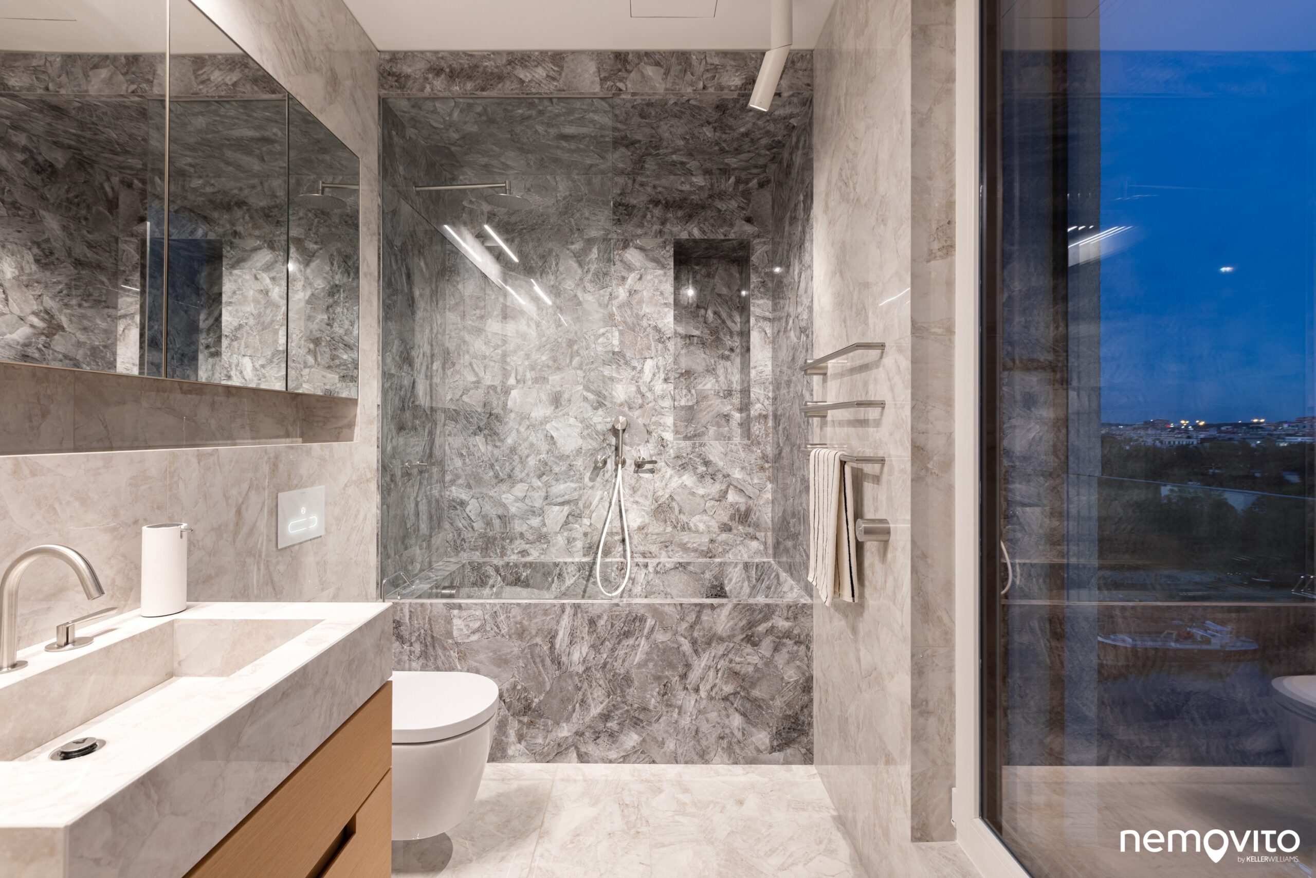 Velké okno vás čeká i v koupelně nejmenšího pokoje, kde si při večerní sprše užijete pořádný výhled. Ostatně jakmile padne tma, je na co koukat v celém bytě.