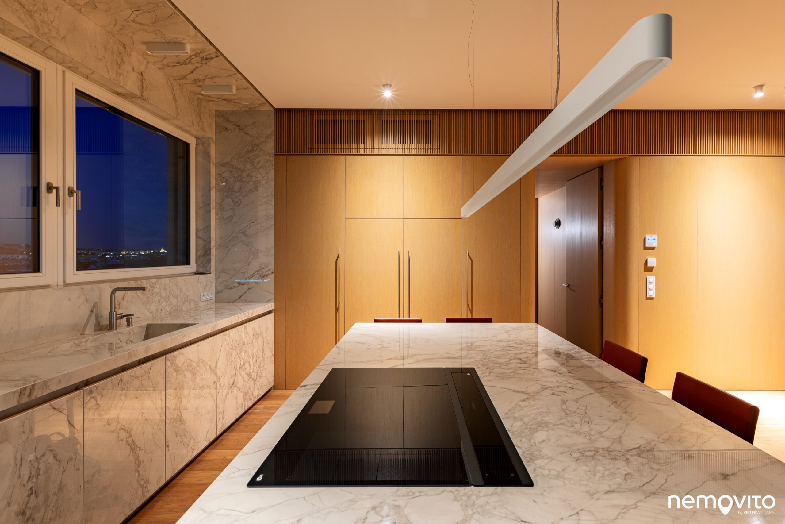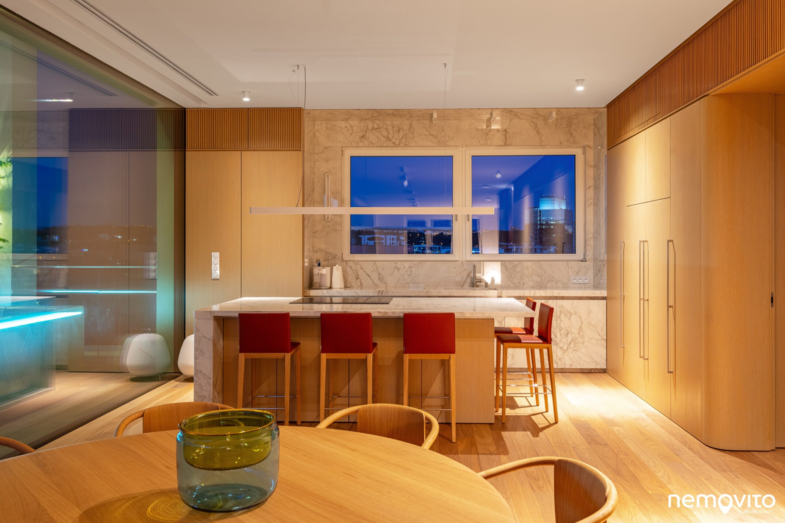 Zvolené materiály v sobě kombinují dřevo a dekor kamene. Tato kombinace byla použita i v kuchyni, kde je dřez součástí kamenné pracovní desky. Spotřebiče jsou pochopitelně high-tech nejvyšší řady. Veškeré truhlářské prvky má na svědomí česká firma. V bytě je truhlařiny za více než 6 milionů korun.