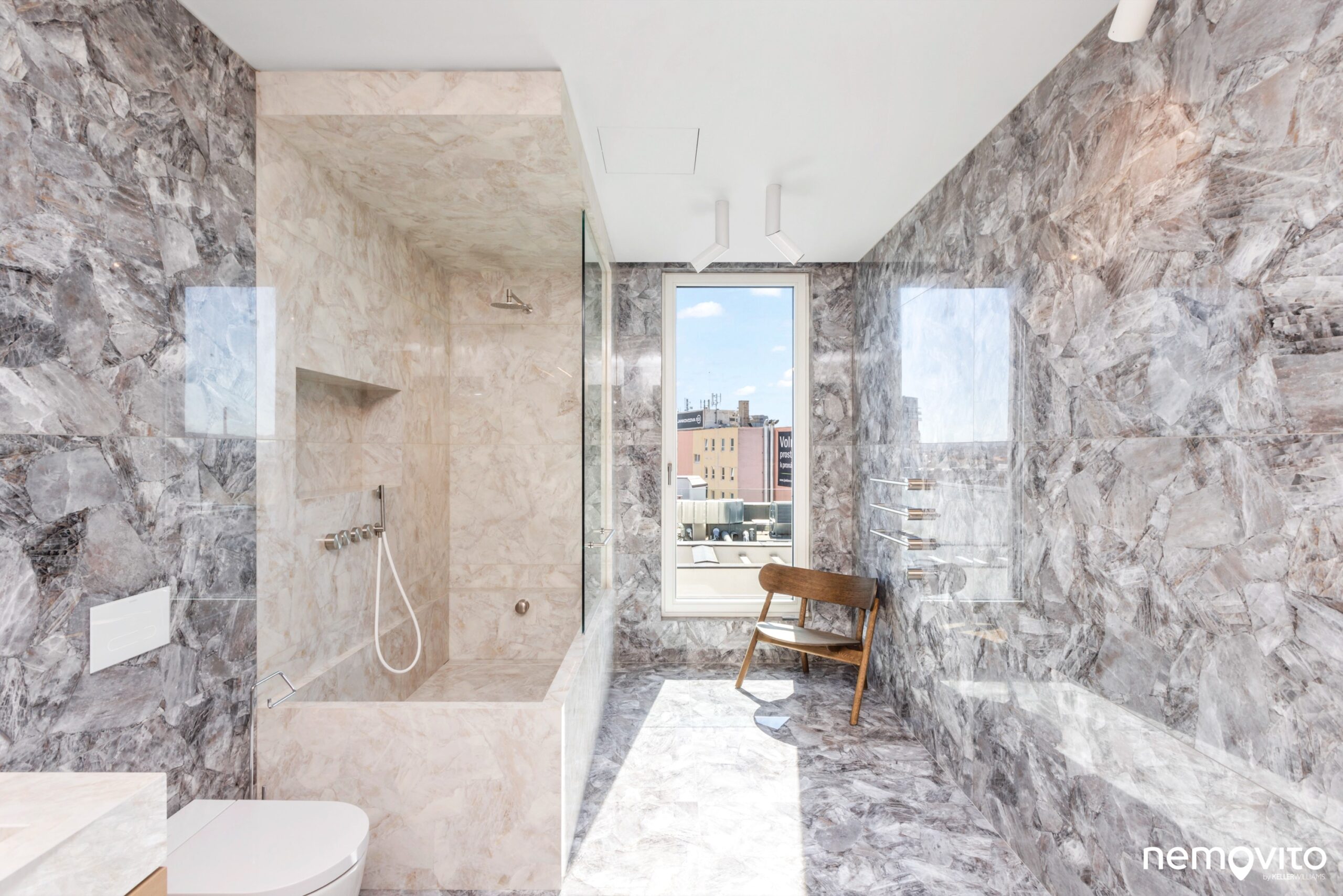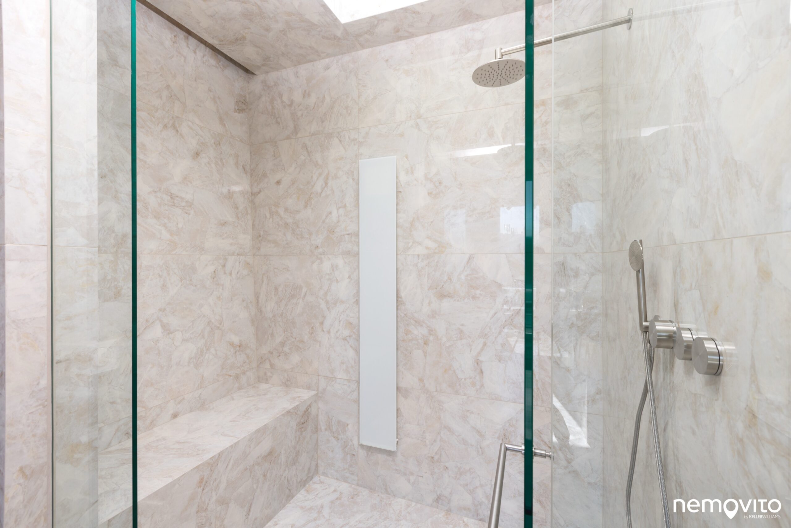 Velké okno, velký walk-in sprchový kout a čistý design vás čeká i v této koupelně.