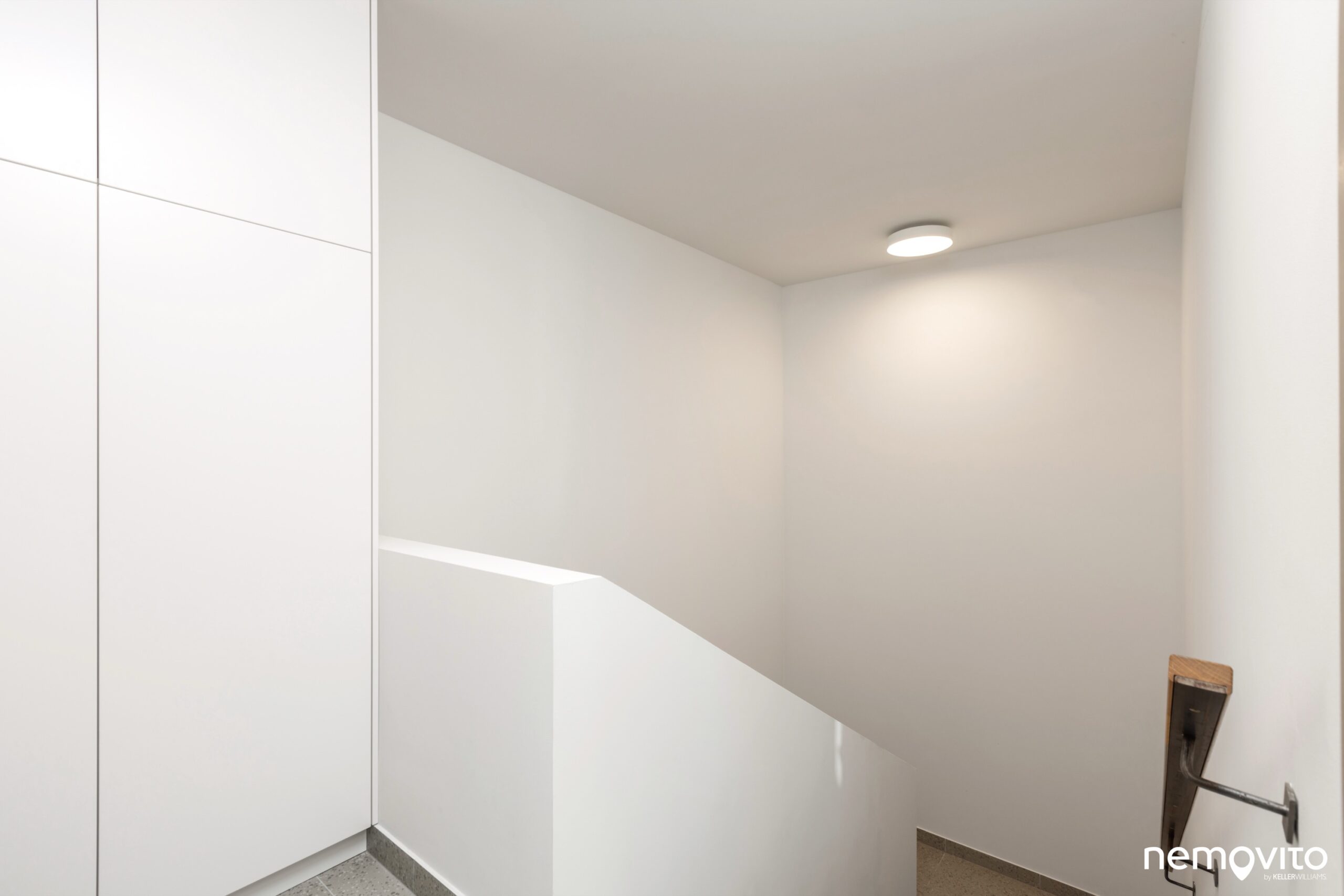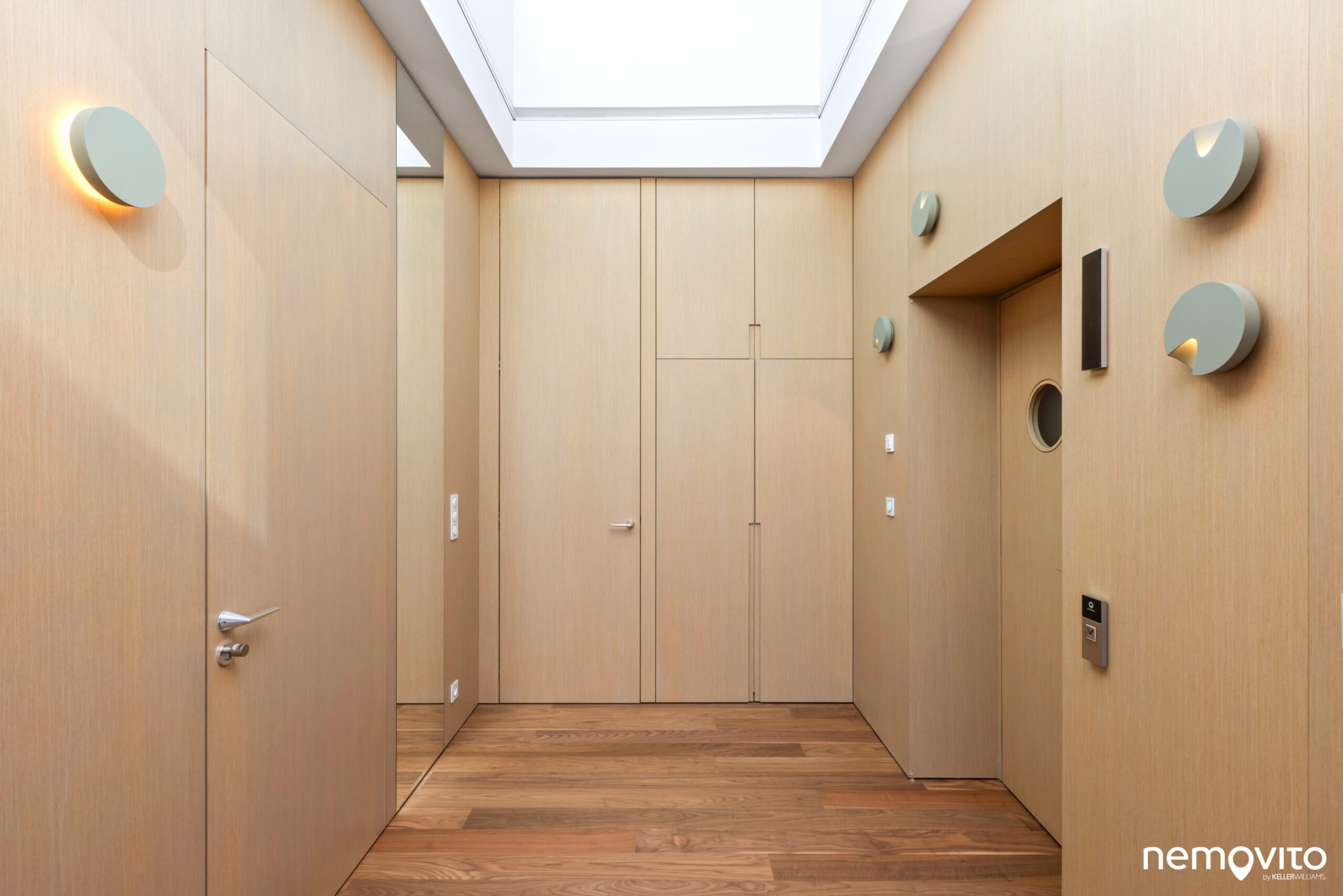 Výtah je hned u garáží a jede až do bytu, pochopitelně se sem dostanete jedině přes čip. Součástí bytu je také poslední část schodiště, která je soukromá a nikdo jiný na ni přístup nemá.