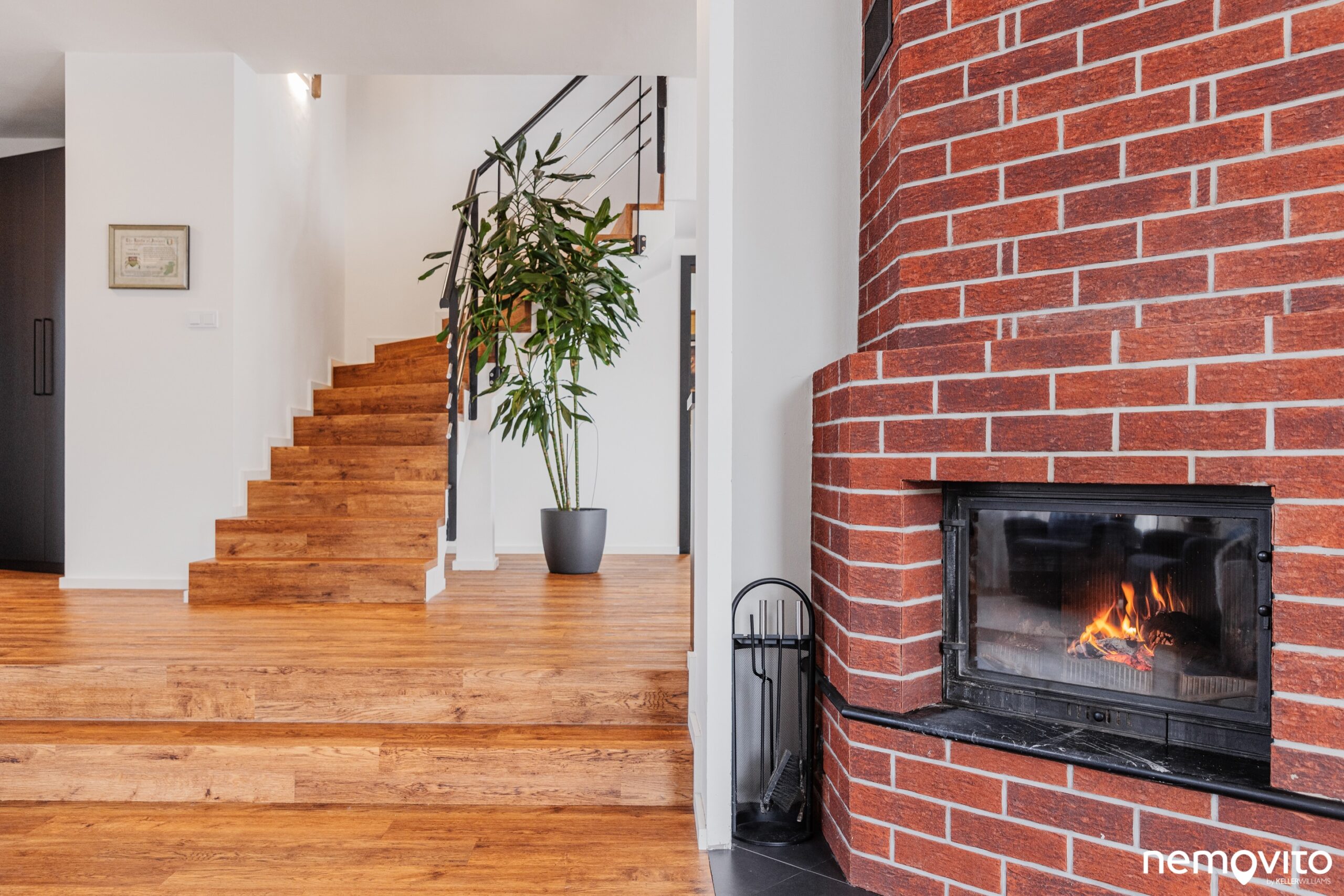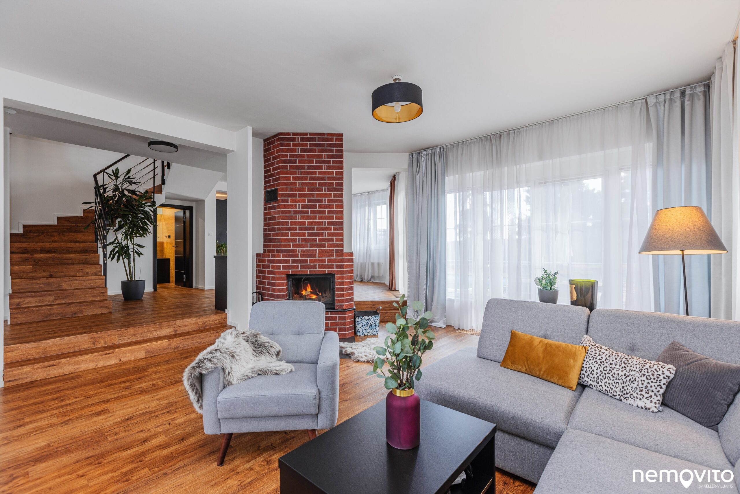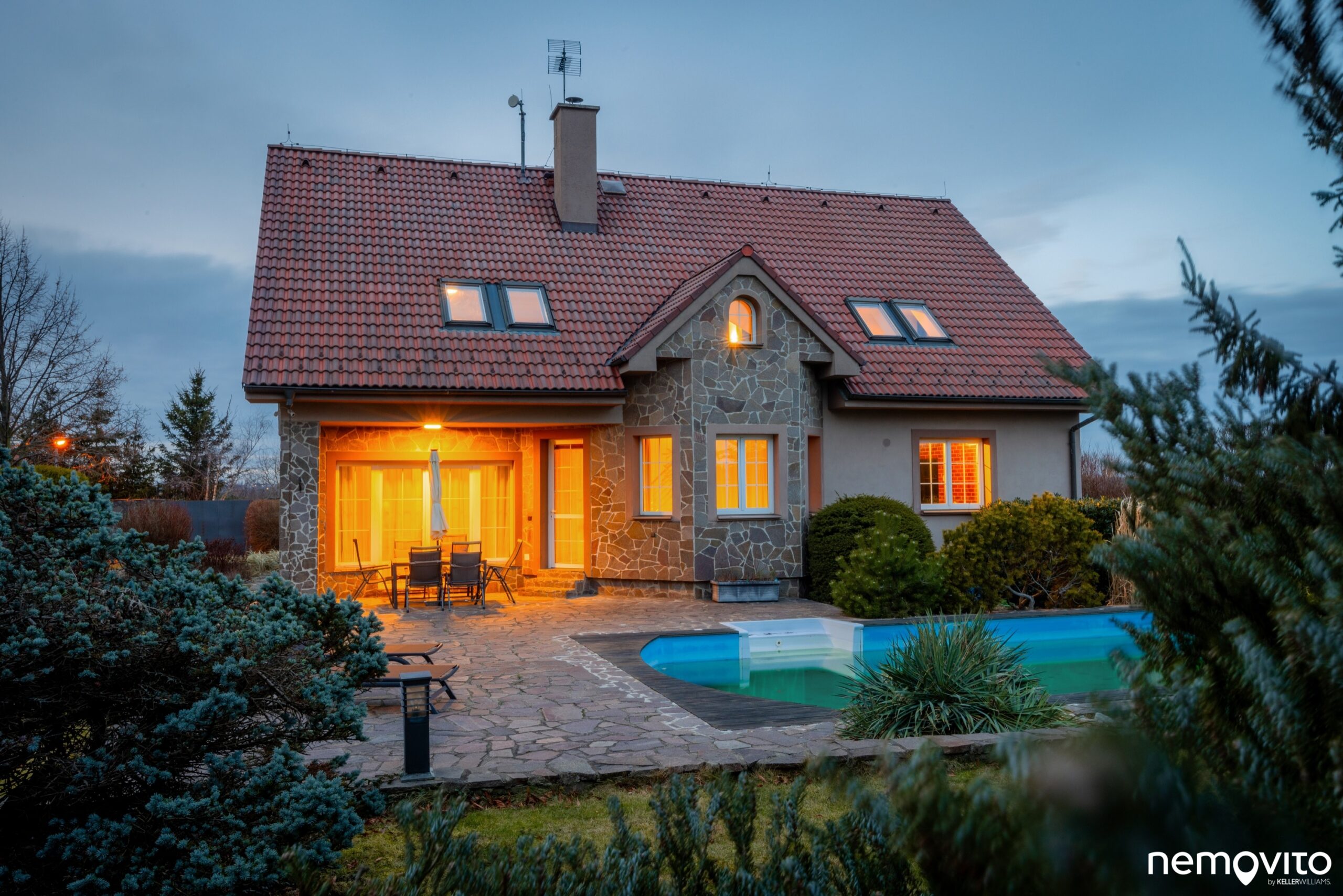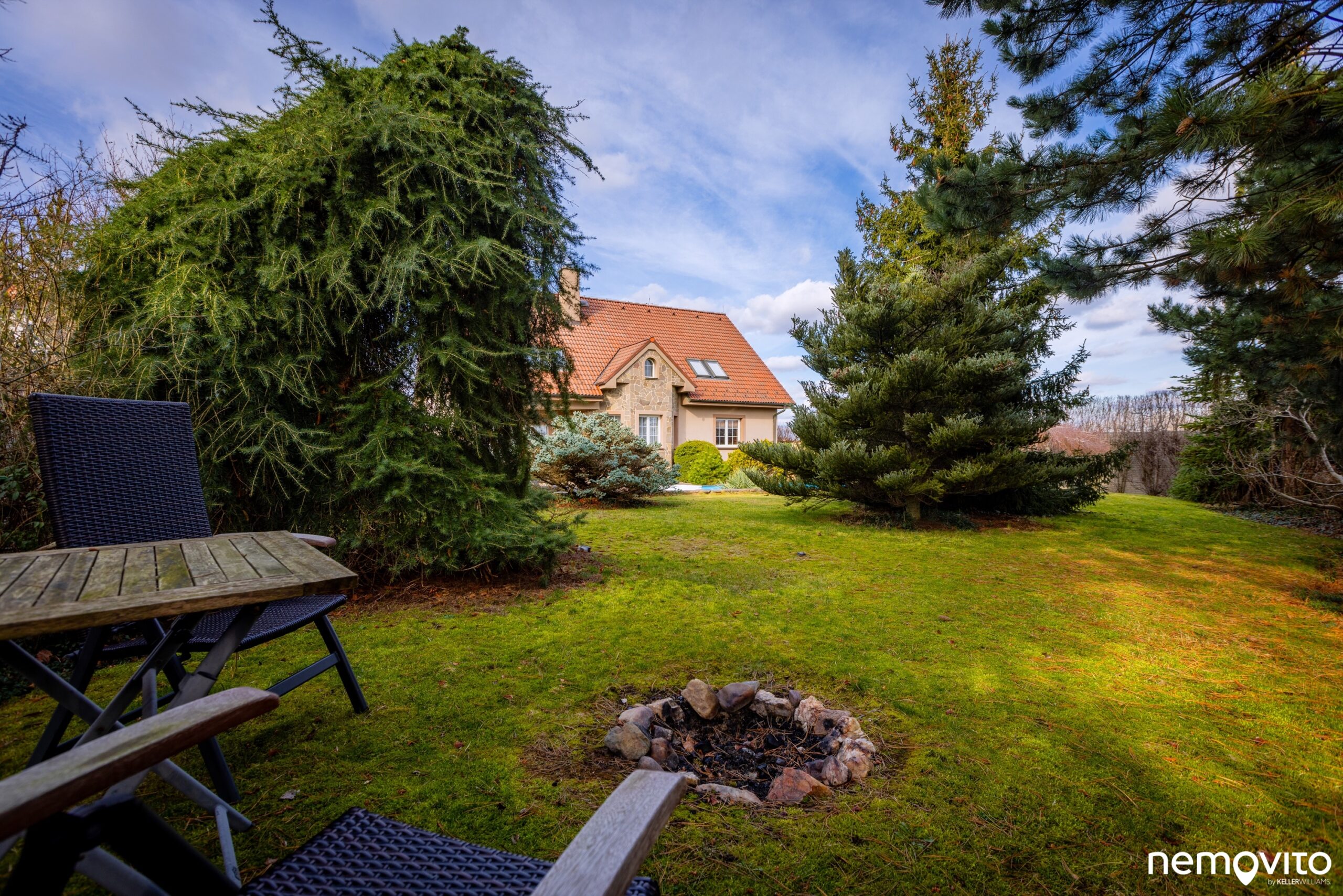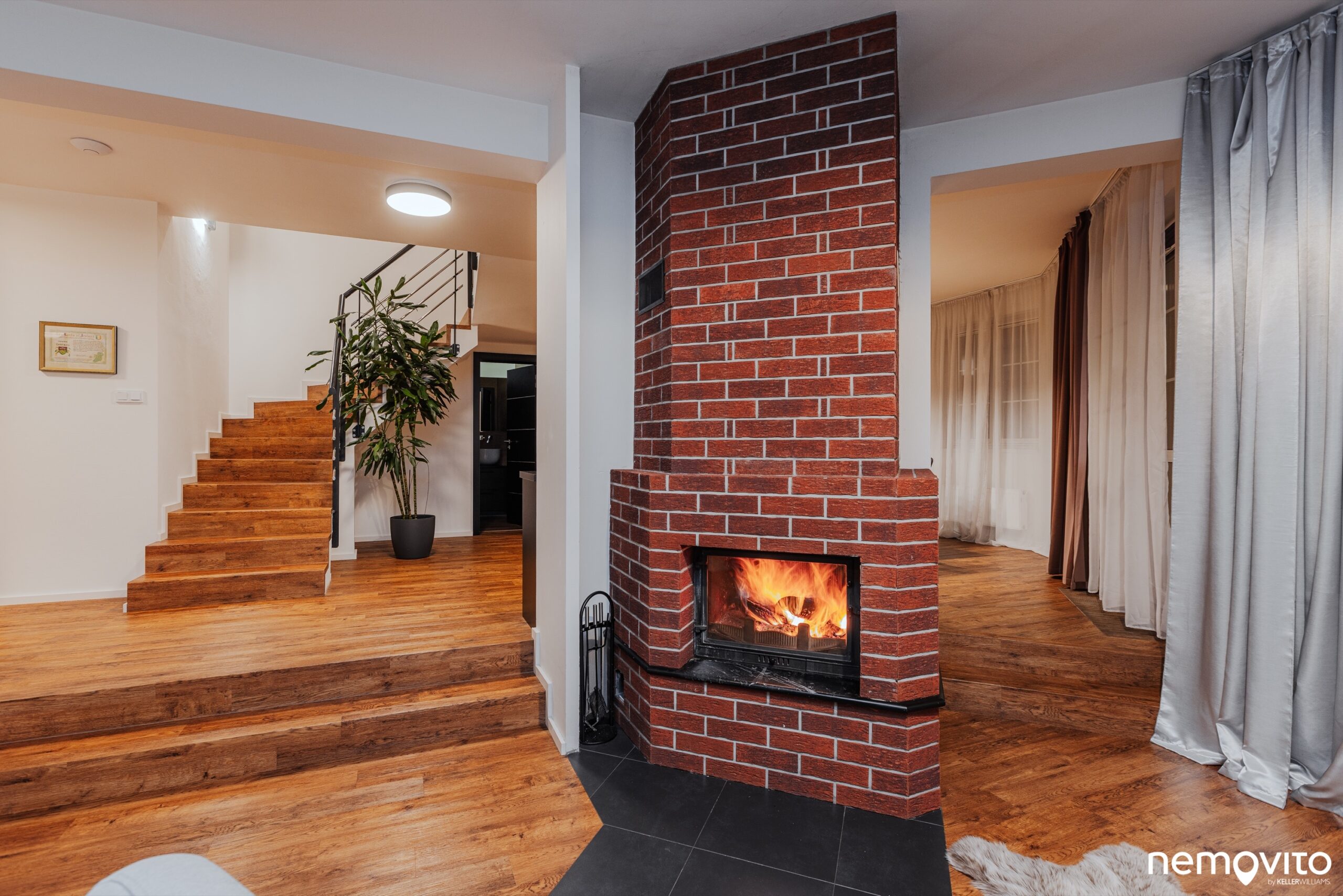 4+1, bezmála 300 m2, garáž na dvě auta a opravdu velké pokoje. Žádné miniaturní kamrlíky. Tohle je dům z doby, kdy se ještě stavělo velkoryse. Pořádné ložnice a žádné třicetimetrové obýváčky. Největší ložnice tady má dokonce obřích 48 m2 a vznikla spojením dvou pokojů. Znamená to tedy, že z domu klidně uděláte o místnost větší. Tou největší silou domů z této éry je právě jejich prostorové pojetí, ve kterém vás nesvazují stěny blízko sebe. Tak nějak lépe se tu dýchá. Typický důvod pro koupi prověřené stavby z přelomu milénia jsme tedy již probrali. Není ale jediný. Pro ty z vás, kdo chtějí místo holého plácku skutečnou zahradu, ve které už je na co koukat, tu existuje ještě jeden. A tím je právě pozemek, na kterém není mrtvo, ale přesně naopak. Vzrostlé stromy, keře a pro vaše ratolesti nezbytný bazén. Od věhlasného průhonického parku vás sice dělí rovný jeden kilometr, ale mít na svém pozemku zelená zákoutí a klídek, to se při náročném dni rozhodně hodí. Svou kávu si tedy v létě vychutnáte mezi stromy, zatímco v zimních plískanicích oceníte praskající oheň a vůni dřeva. Co by to bylo za dům, kdyby v něm chyběl krb.