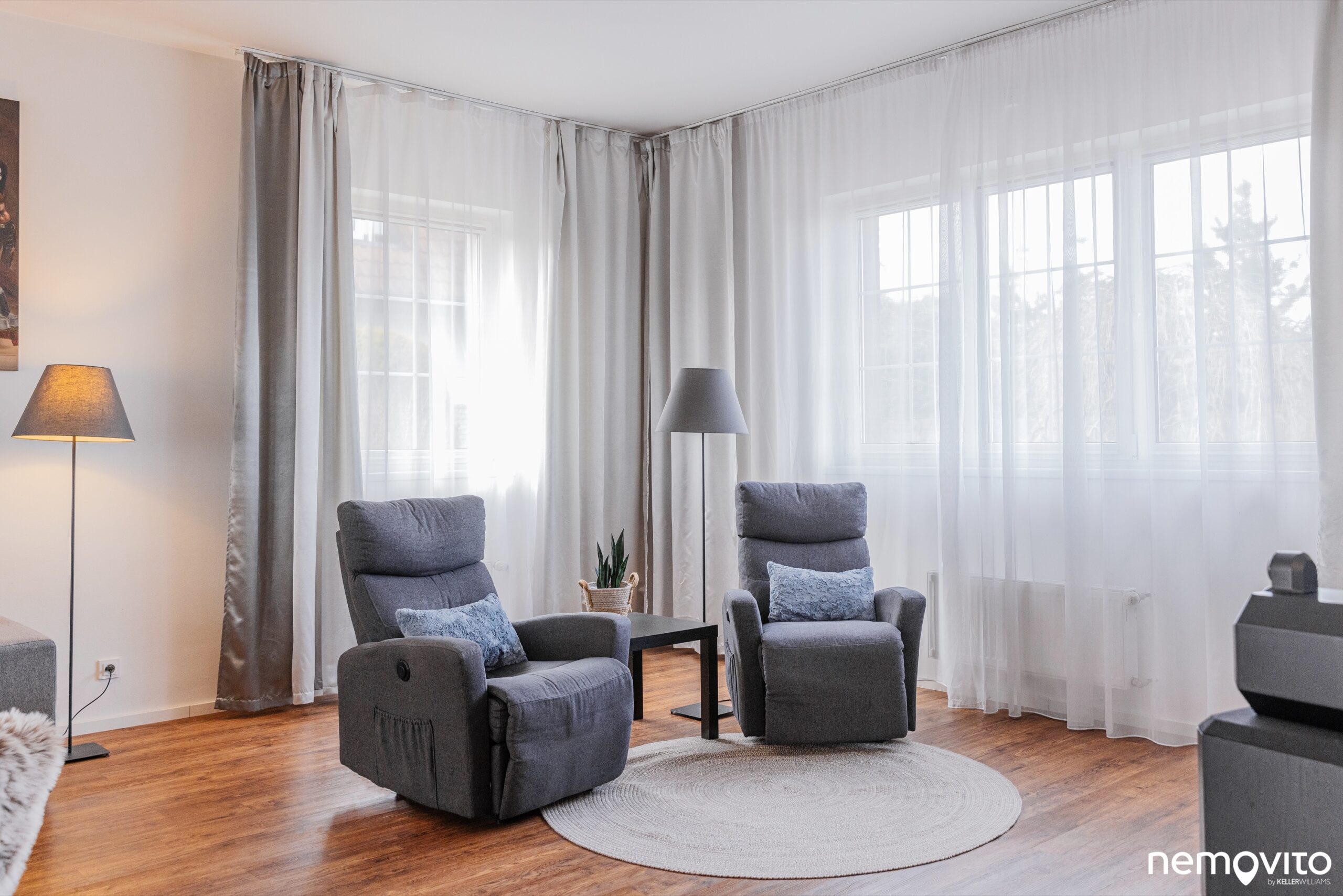 V obýváku je díky množství oken světlo po celý den. Od jihovýchodu po severozápad. Navíc vám do oken nikdo koukat nebude, soused je tu jenom jeden.