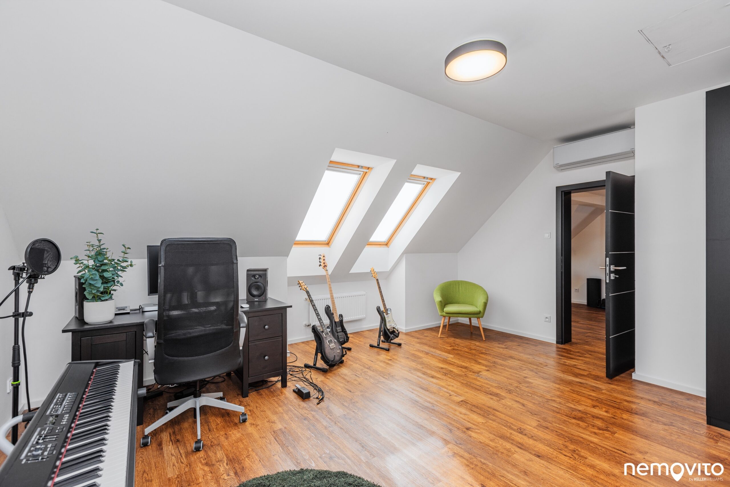 Přes koupelnu pokračujeme do další ložnice, která nyní funguje jako pracovna. Ve stropě si můžete všimnout poklopu pro vstup na půdu, na které je ještě hromada úložného prostoru.. Plocha místnosti je 21 m2. V tomto domě se sice jedná o nejmenší pokoj, ale rozhodně bývá tím, ze kterého se linou nejhlasitější tóny 🙂