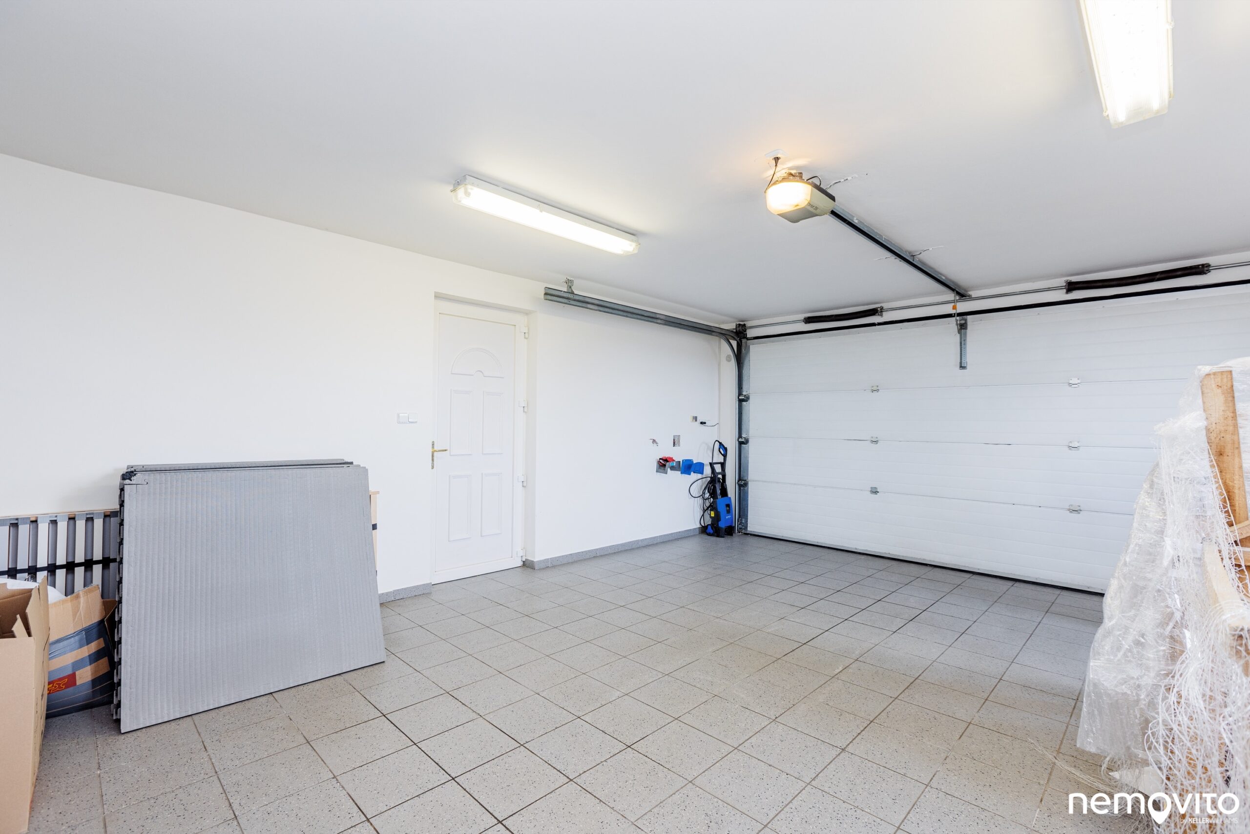 Slíbil jsem i garáž, takže tady ji máme. 36 m2 bohatě stačí na dvě auta. Vstup do garáže je nejen přes technickou místnost, ale také z boku od hlavních dveří. Dvě auta se vám vejdou také před vrata na pozemek a klidně můžete čouhat ven. Ulice je totiž slepá a nikdo sem nejezdí.