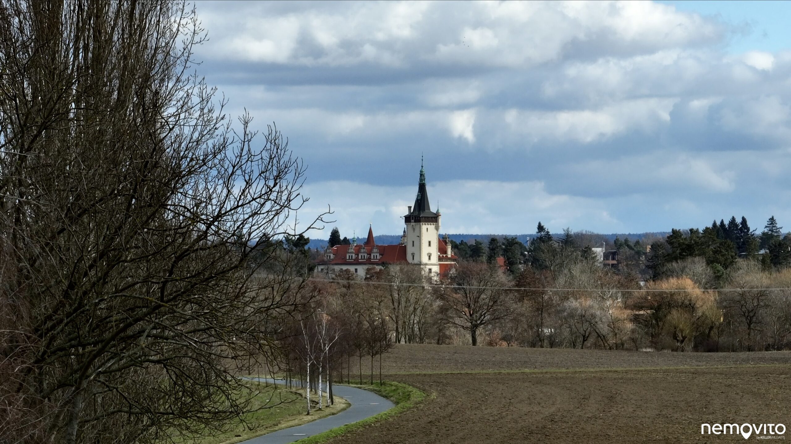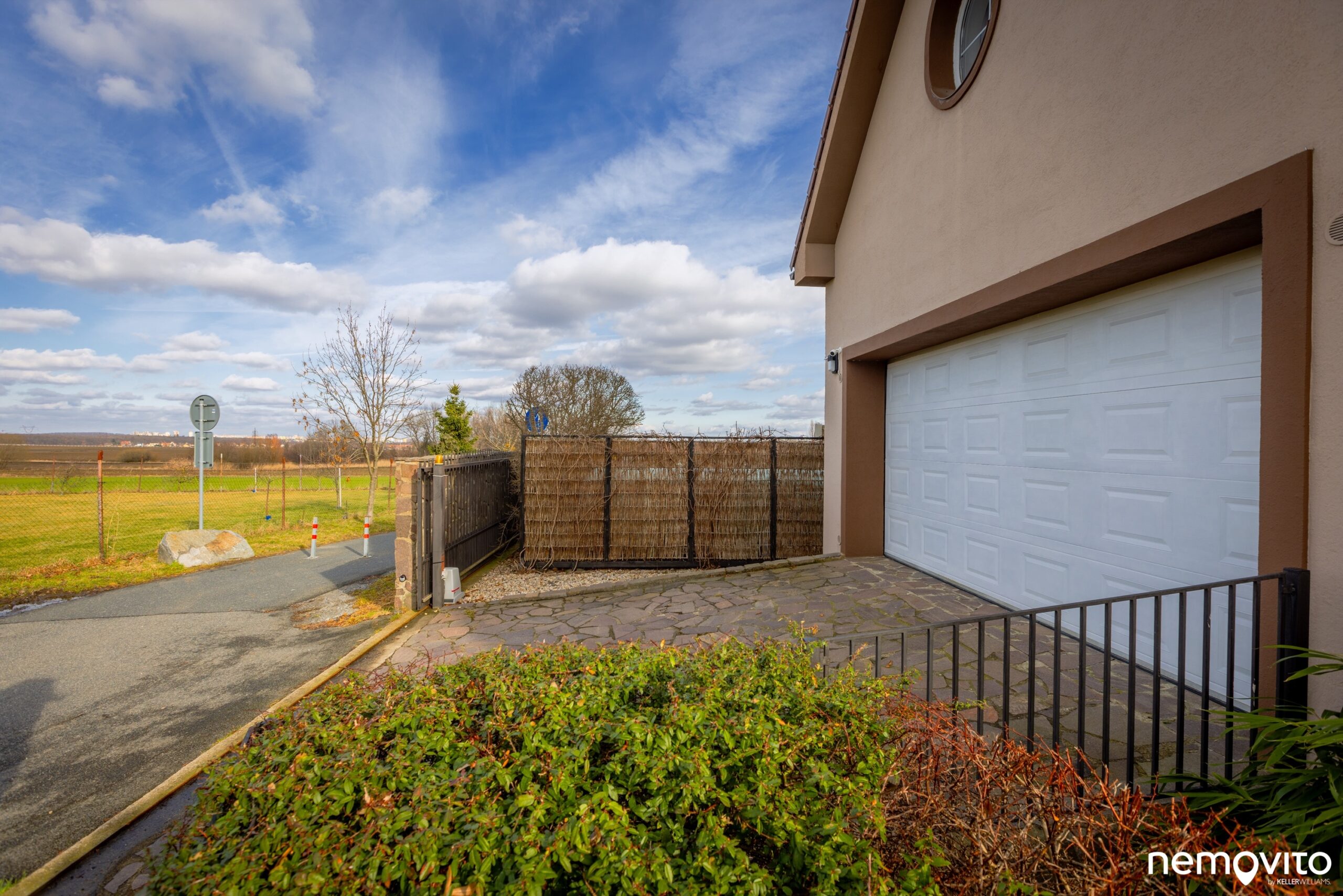 Jedním z největších benefitů tohoto domu je bezesporu ten fakt, že je umístěný na rohovém pozemku v místě, kde se už stavět nebude. Ulice je slepá a navazuje na cyklostezku. Z té na vás vykukuje váš nový soused - věž průhonického zámku.