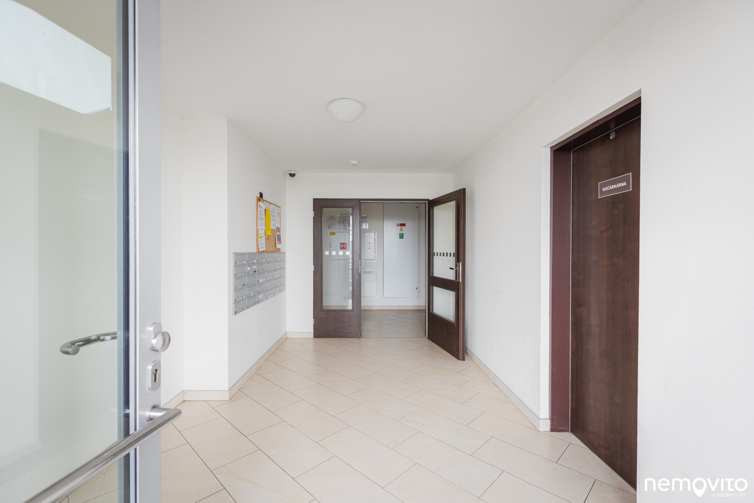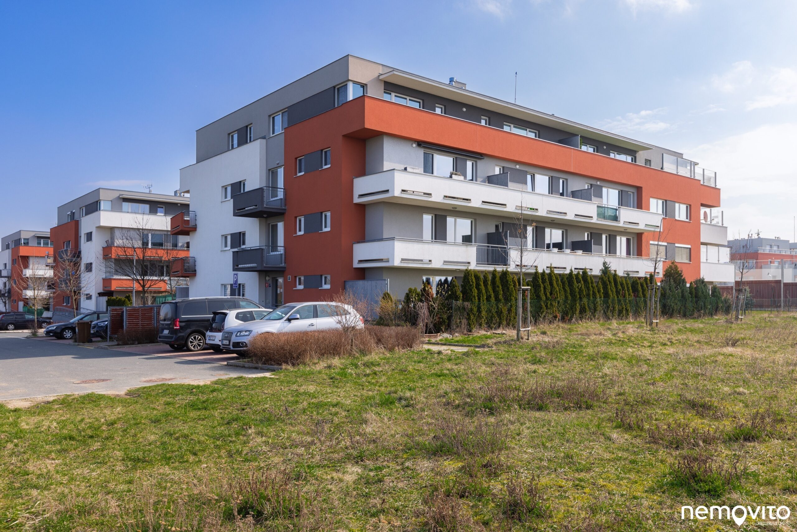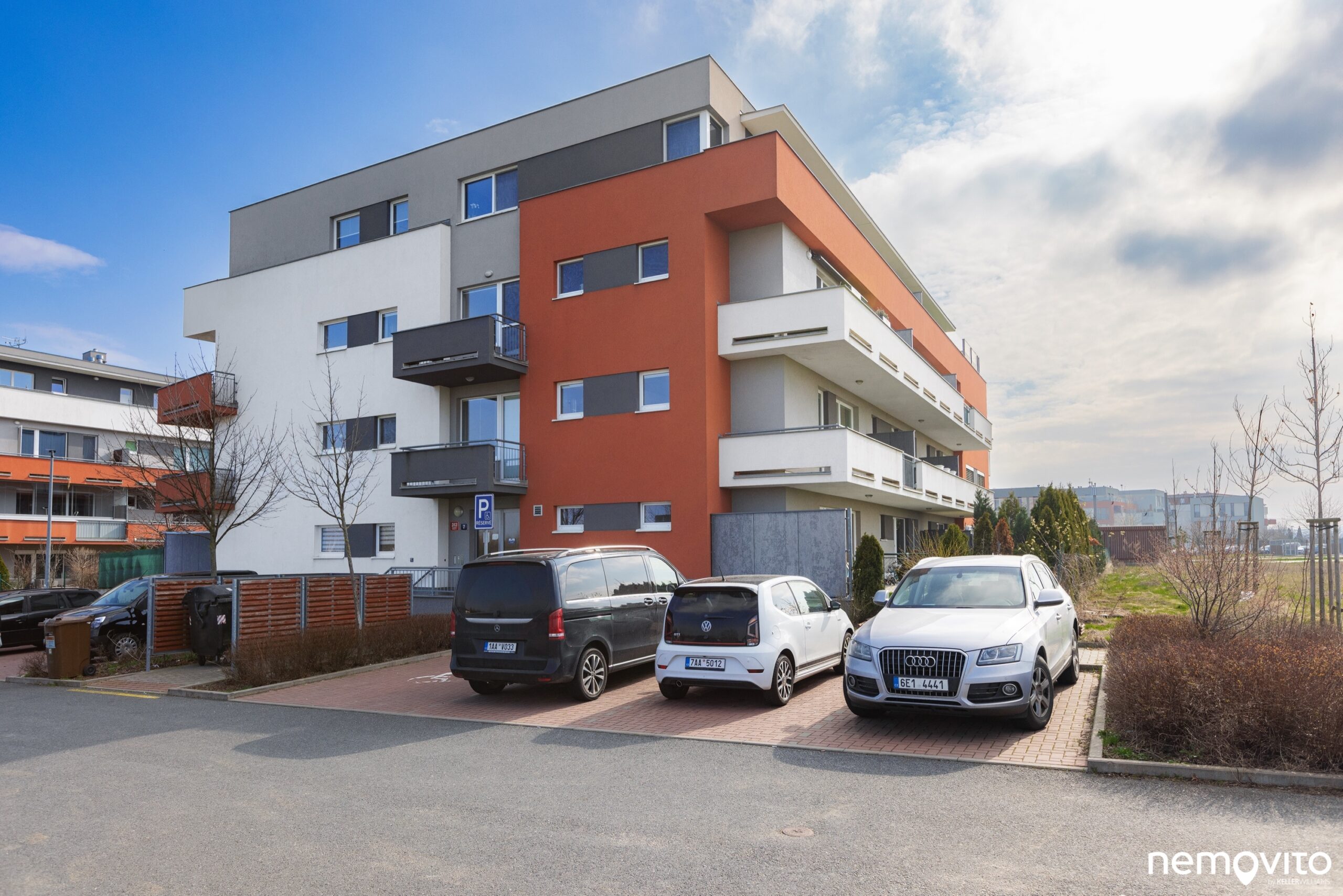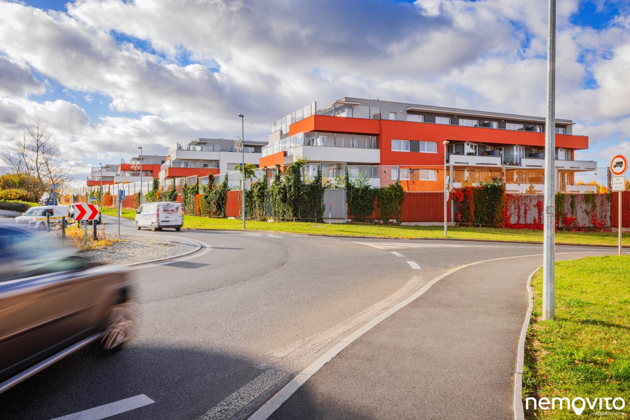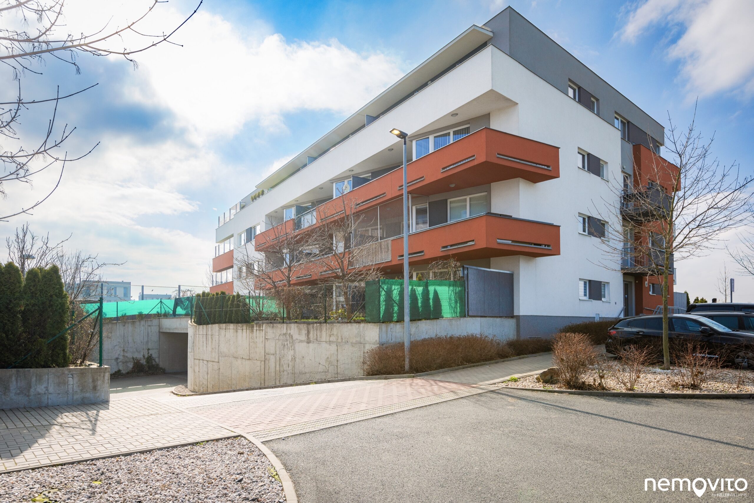 Budova je umístěná na konci slepé ulice. Vjezd do garáží je umístěn mezi domy, využívat ho zcela jistě budete také. Jedno ze stání totiž náleží k bytu.