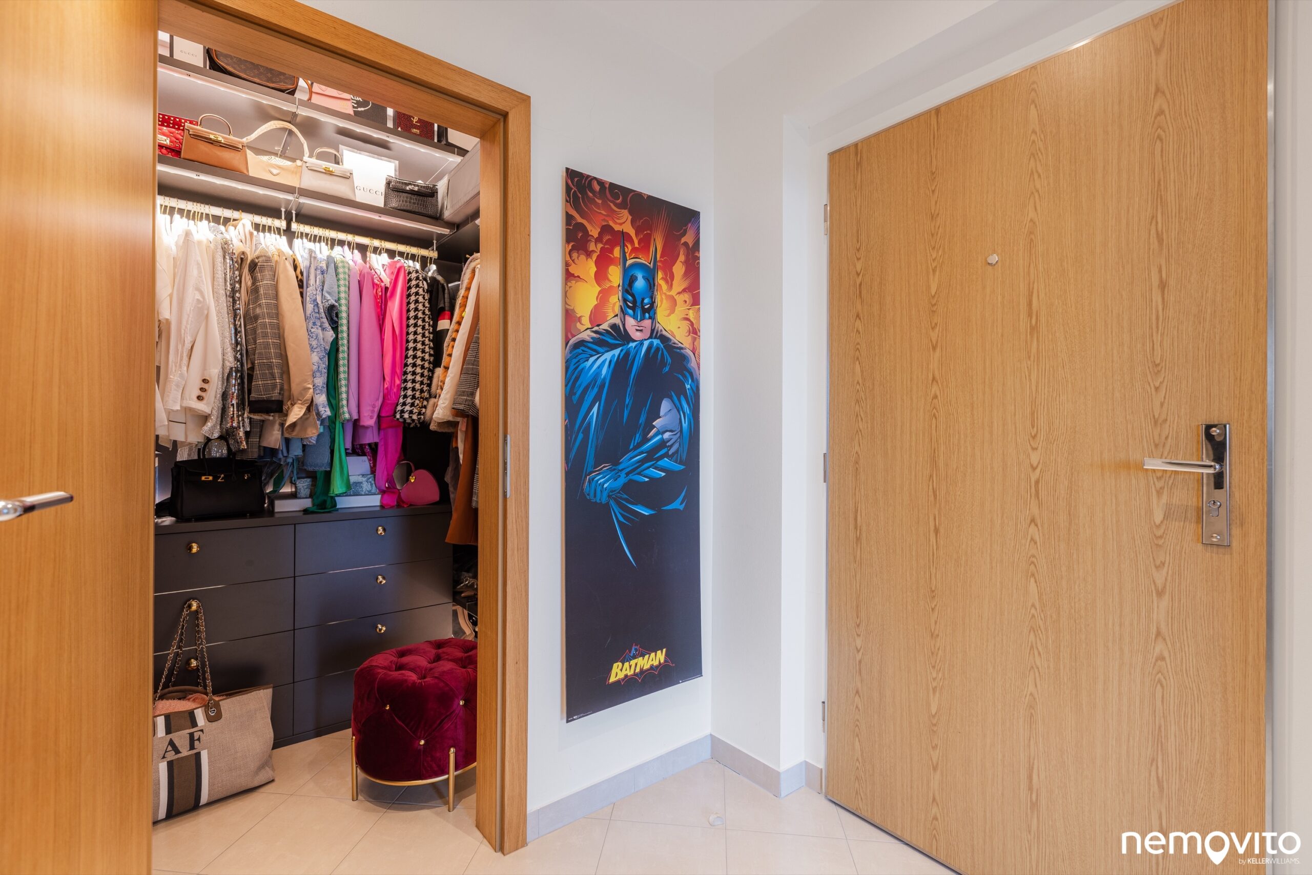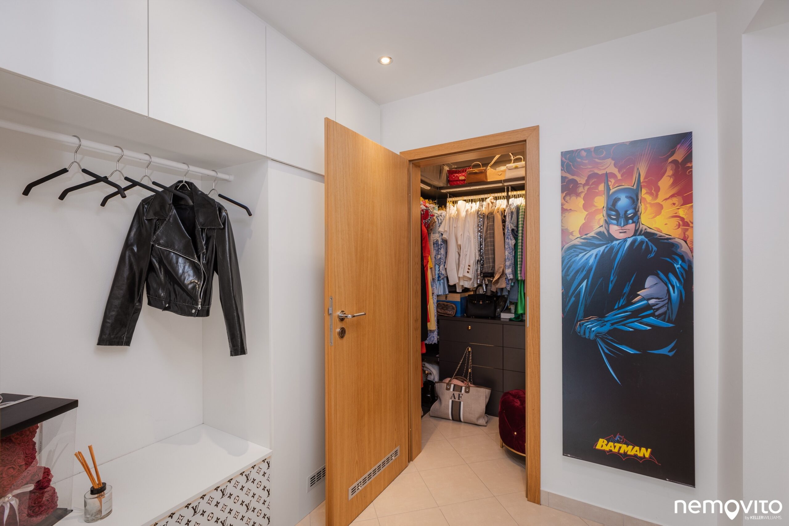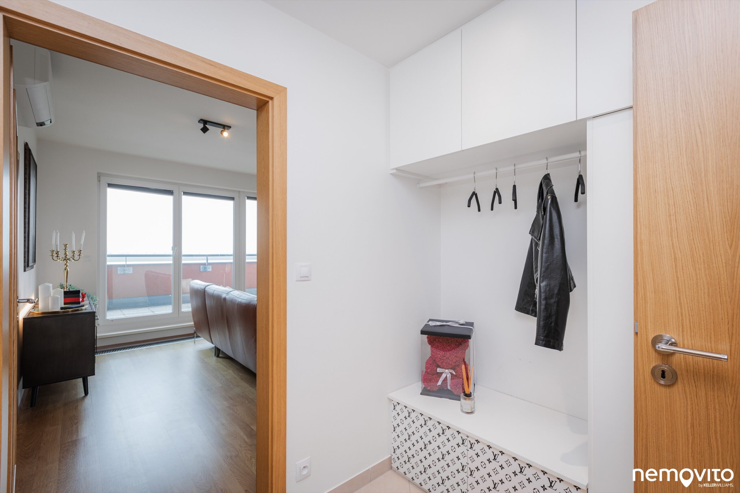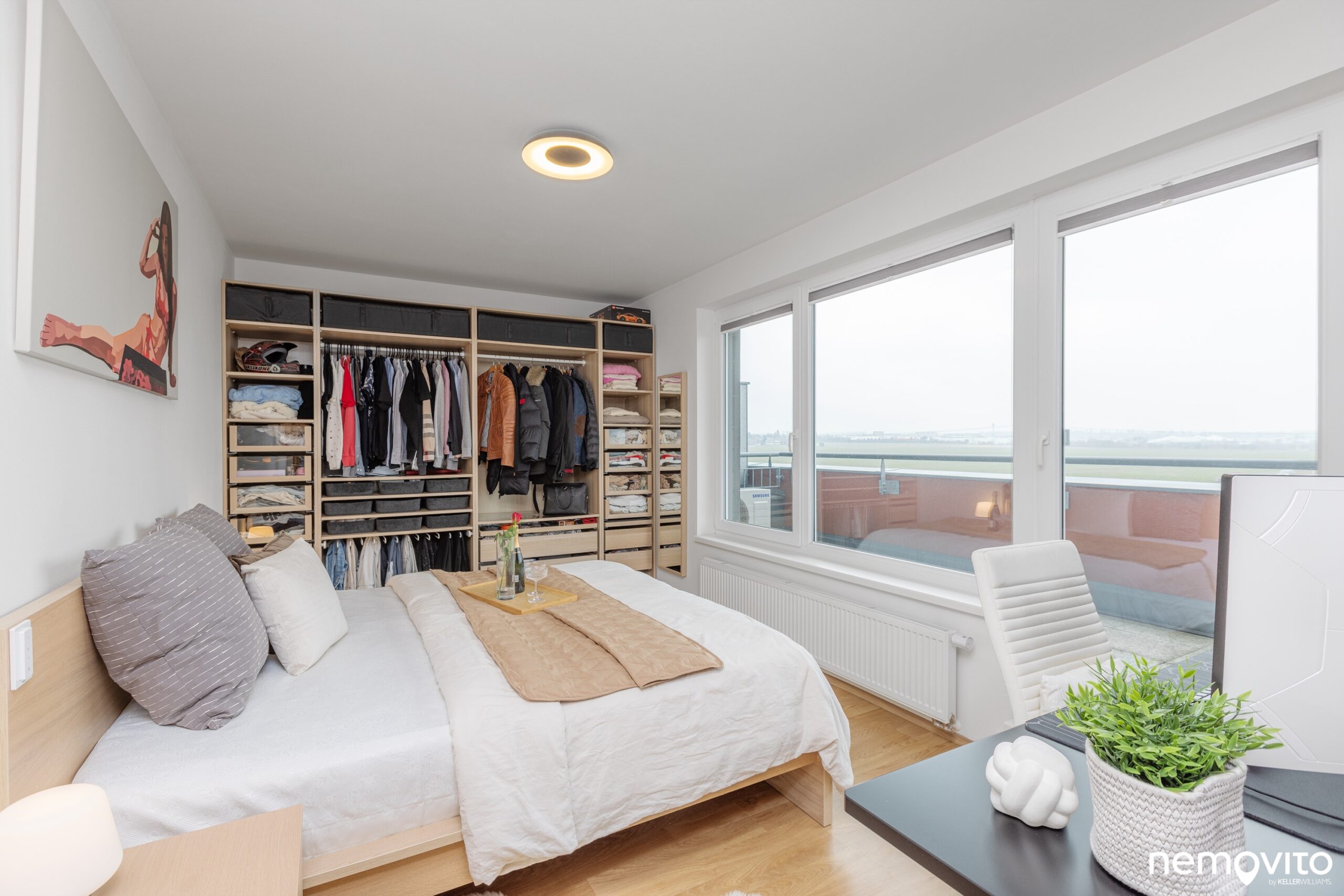 A kam se ta lednice dala...? Velmi jednoduše - výklenek je umístěný za otevřenými dveřmi do šatny. Jednoduché, praktické. Při návrhu bytu se přemýšlelo. Šatna je navíc opravdu velká a vybavena kvalitním vestavěným nábytkem, který je pochopitelně součástí kupní ceny. Nedostatek úložných prostor u tohoto bytu řešit nebudete.