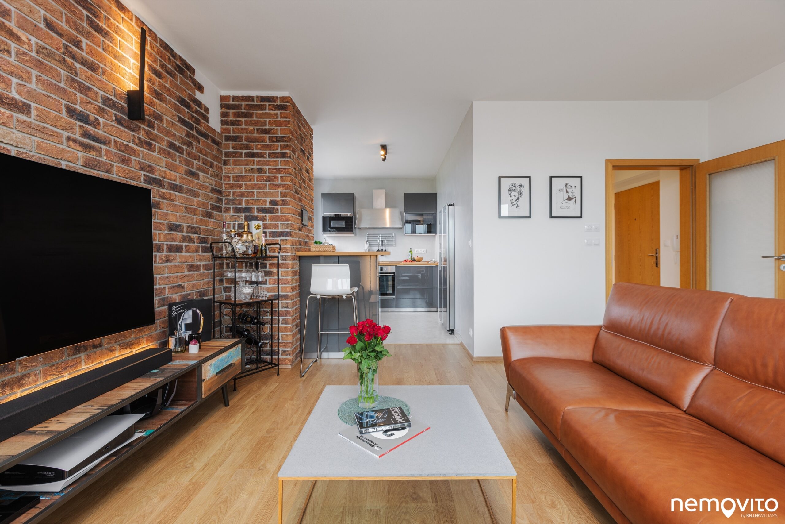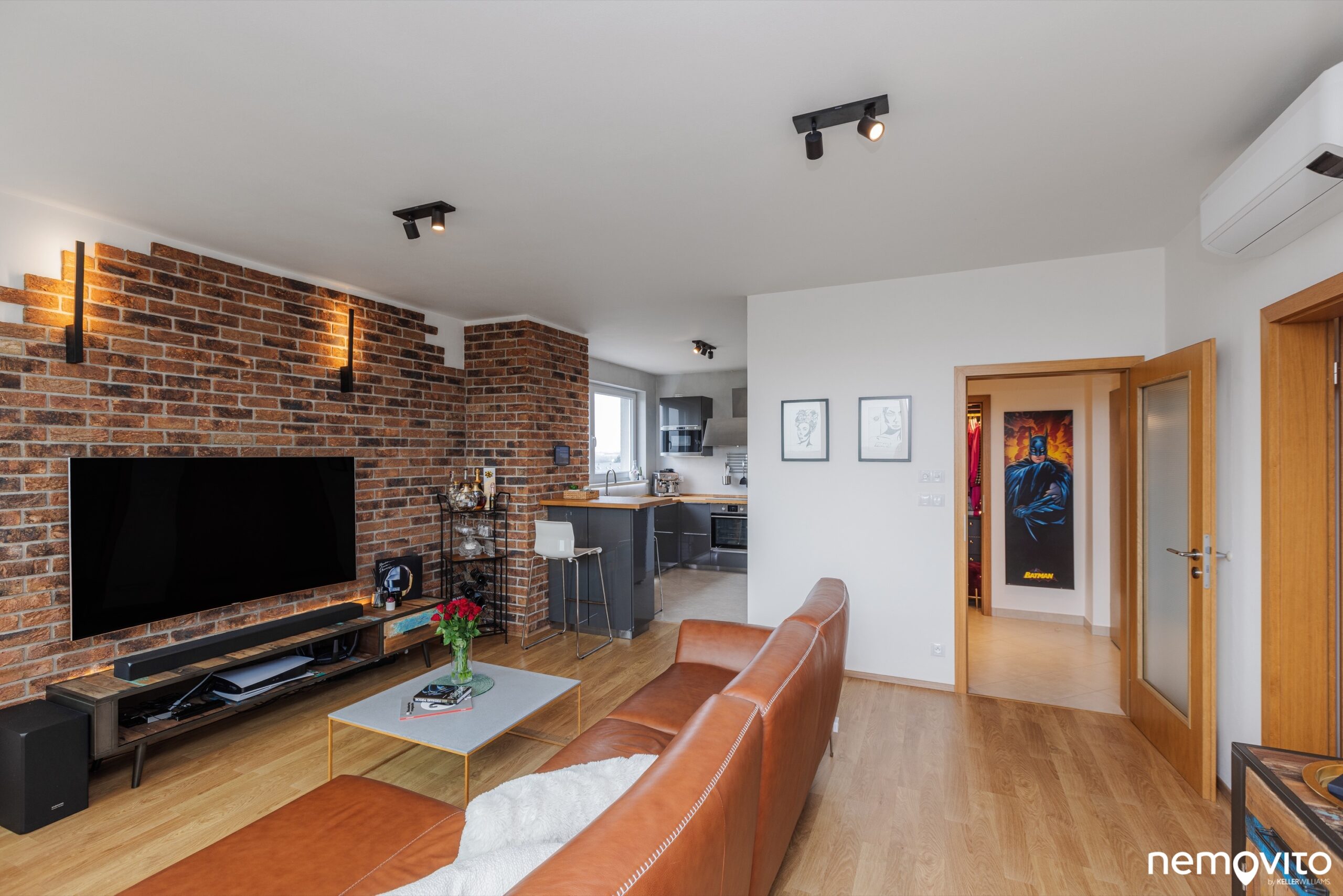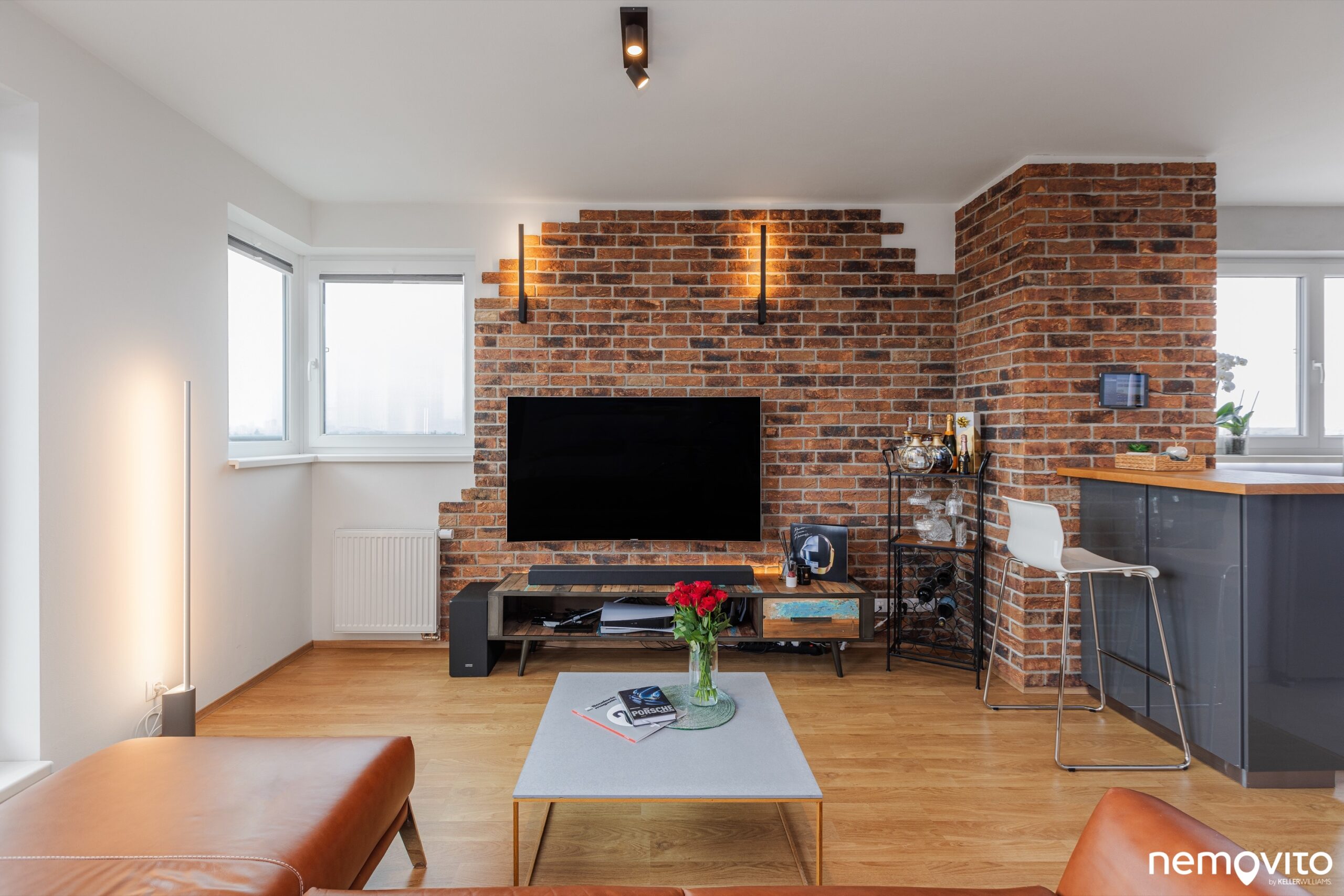 Zajímavým prvkem, který oživuje interiér bytu, je obložení stěny cihlami. Pokud by vám nevyhovoval tento rustikálnější styl, který skvěle sedí ke zvolené kožené sedačce, obložení lze samozřejmě jednoduše odstranit.