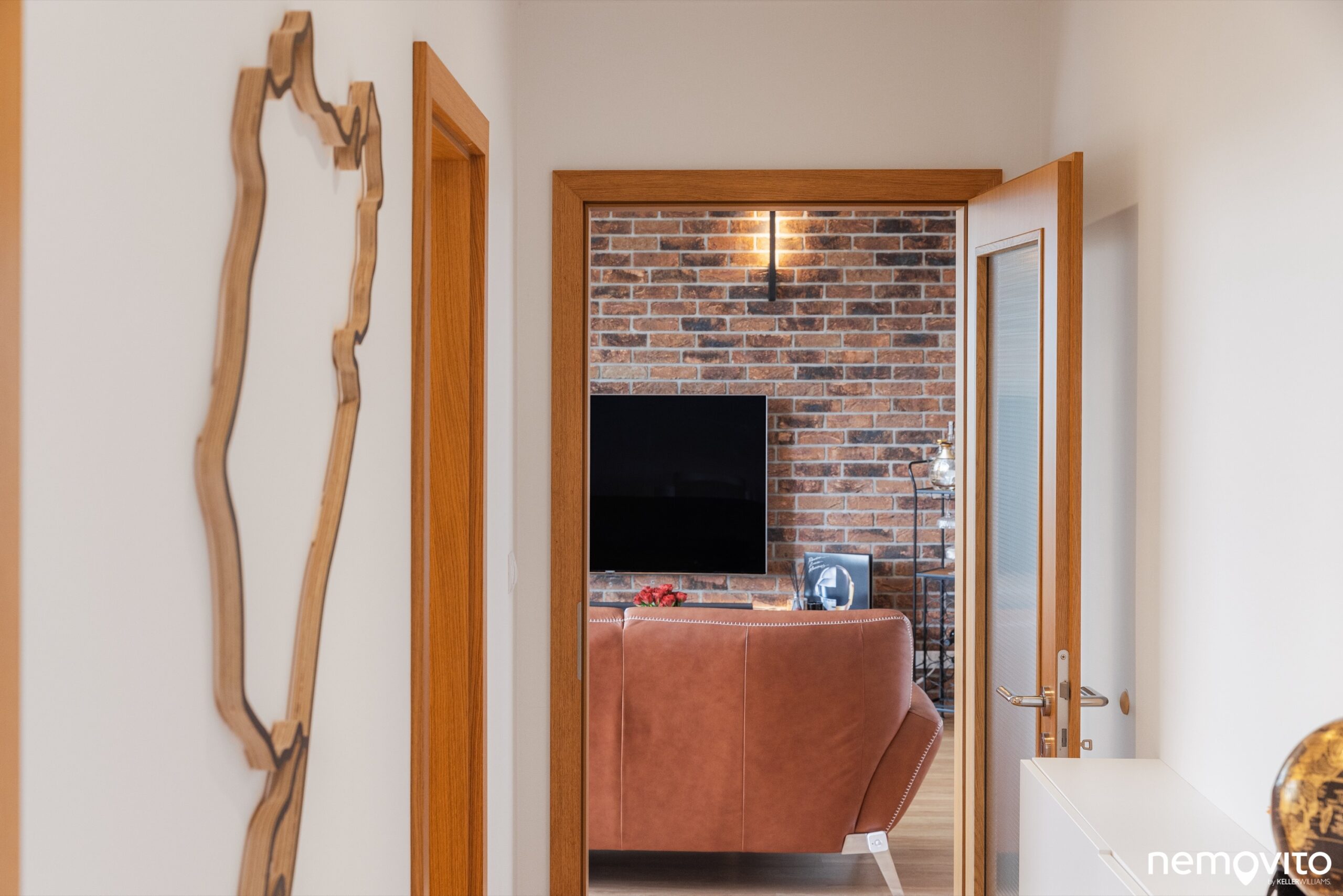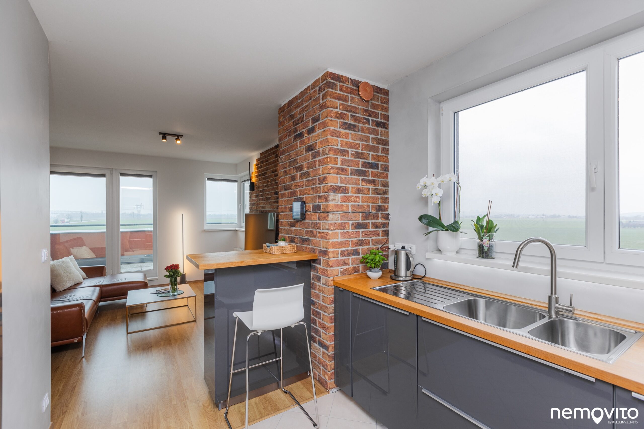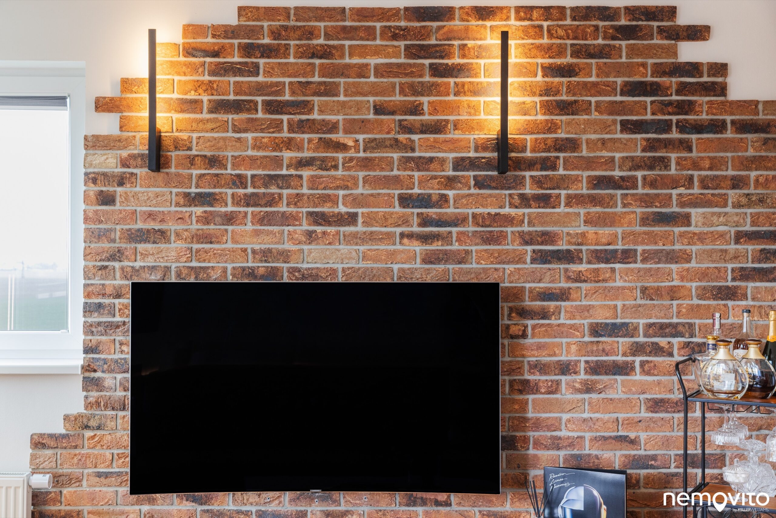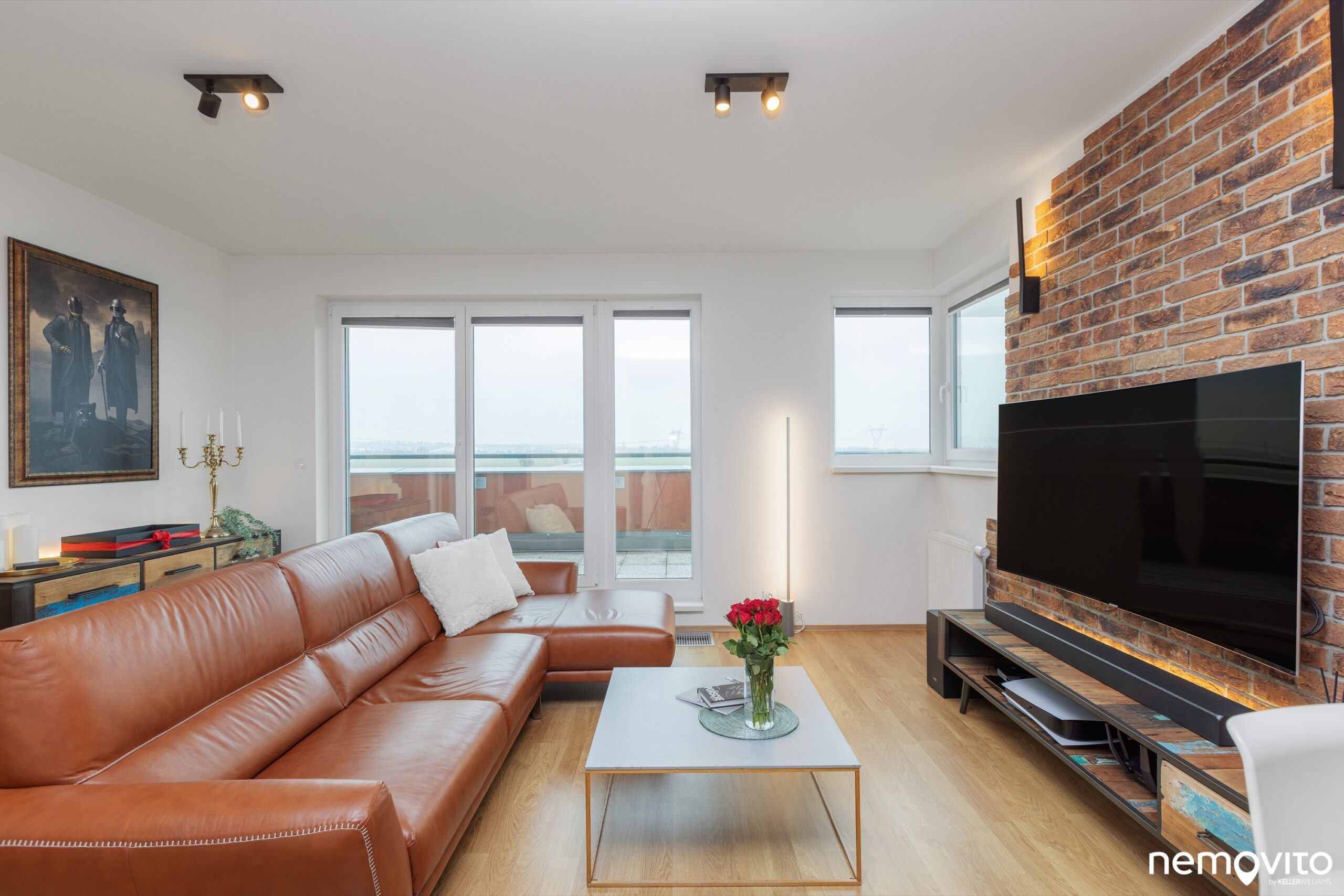 Zajímavým prvkem, který oživuje interiér bytu, je obložení stěny cihlami. Pokud by vám nevyhovoval tento rustikálnější styl, který skvěle sedí ke zvolené kožené sedačce, obložení lze samozřejmě jednoduše odstranit.