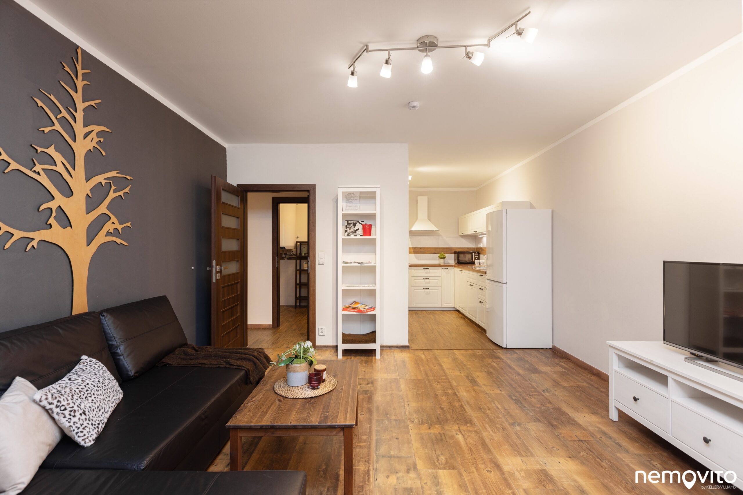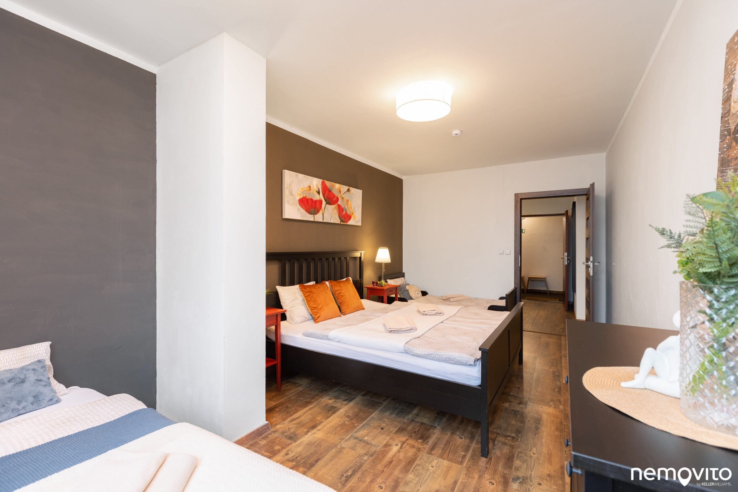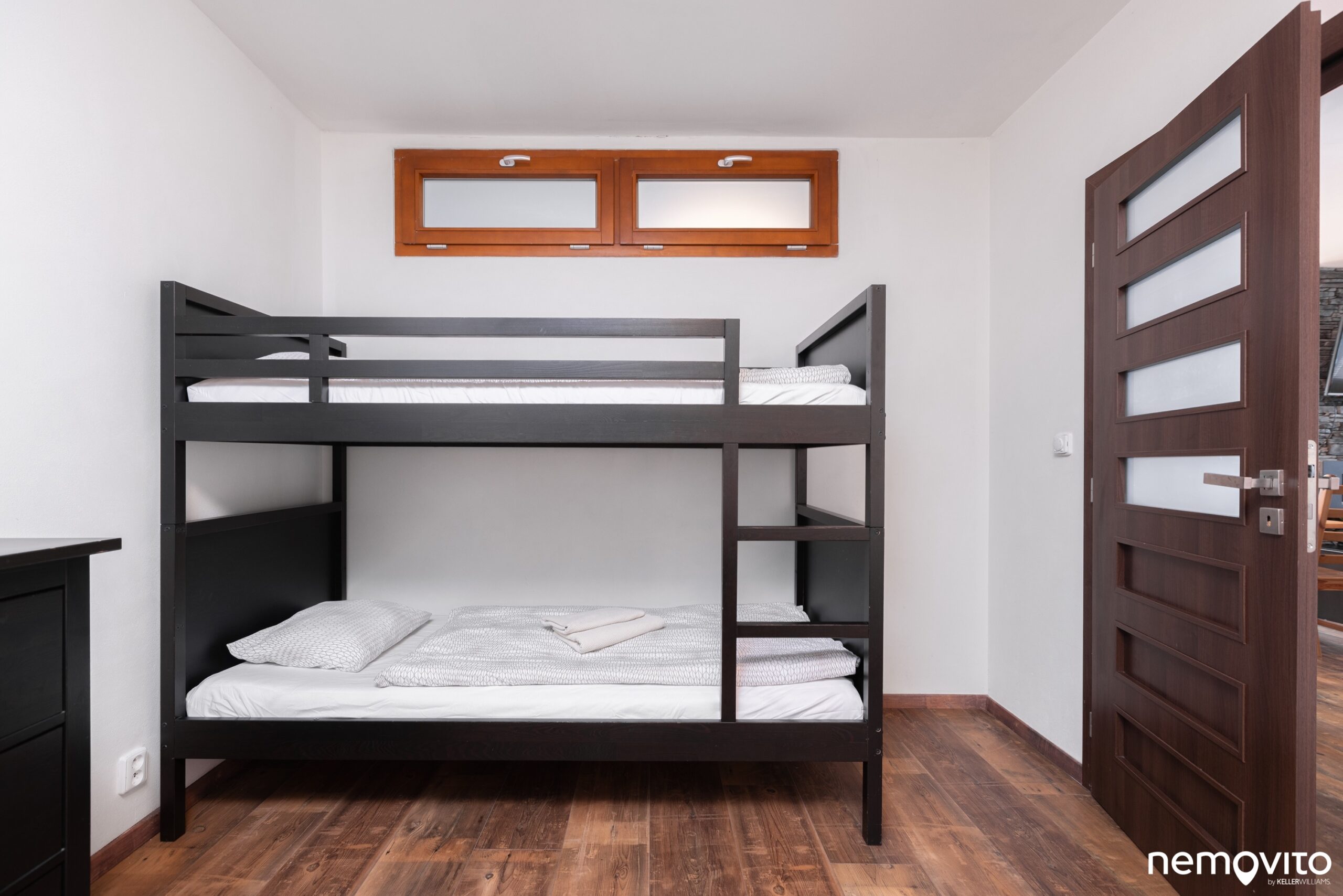 Ložnice má 18 m2 a umožňuje tak umístění 4 lůžek. Ačkoliv se jedná o 2kk, bez potíží a v pohodlí se vyspí i rodina se 2 dětmi. Na roztahovacím gauči v obýváku navíc zvládnete ubytovat i dvoučlennou návštěvu.