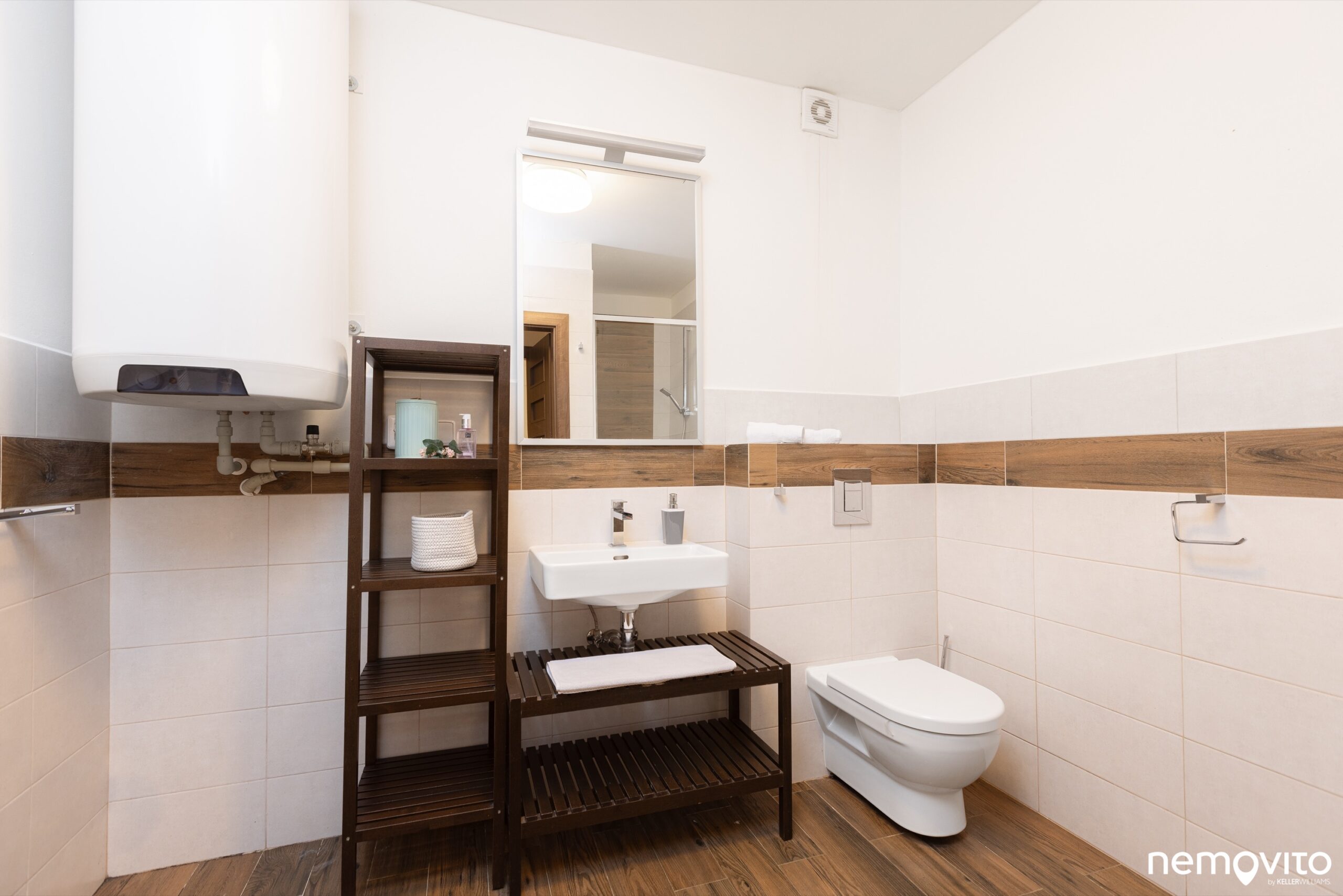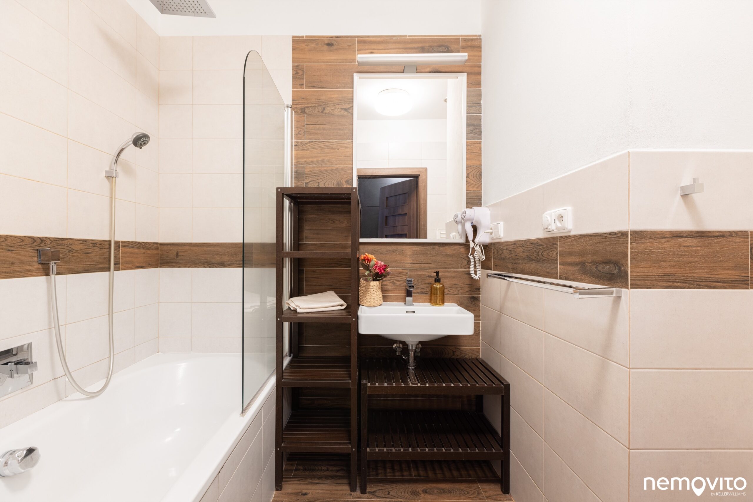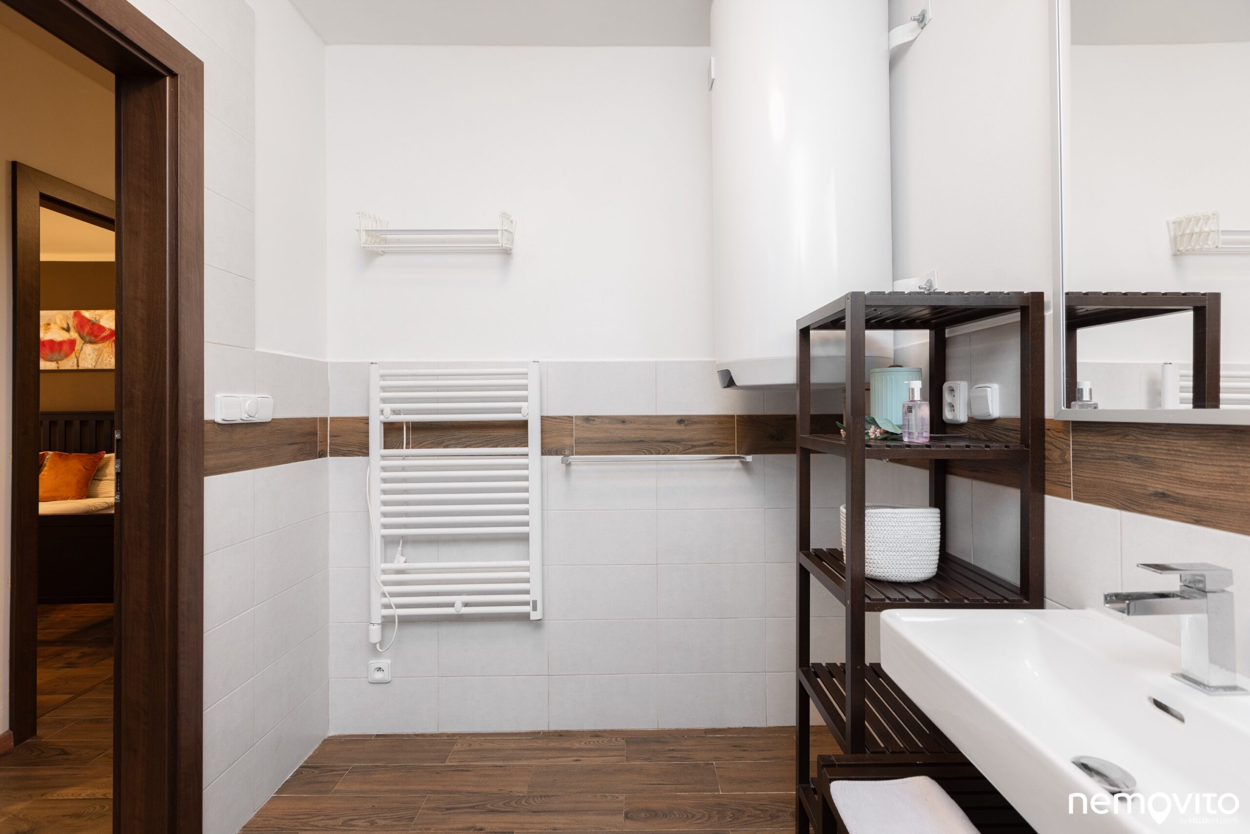 Na chodbě jsou umístěné vestavěné skříně. V koupelně většího apartmánu je k dispozici vana, plocha je 5,3 m2. Koupelny jsou obložené obklady ve tlumených barvách, tedy žádné divoké výstřelky, které za pár let zestárnou.