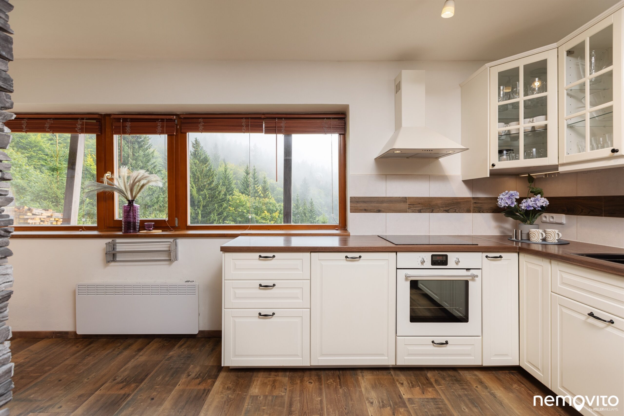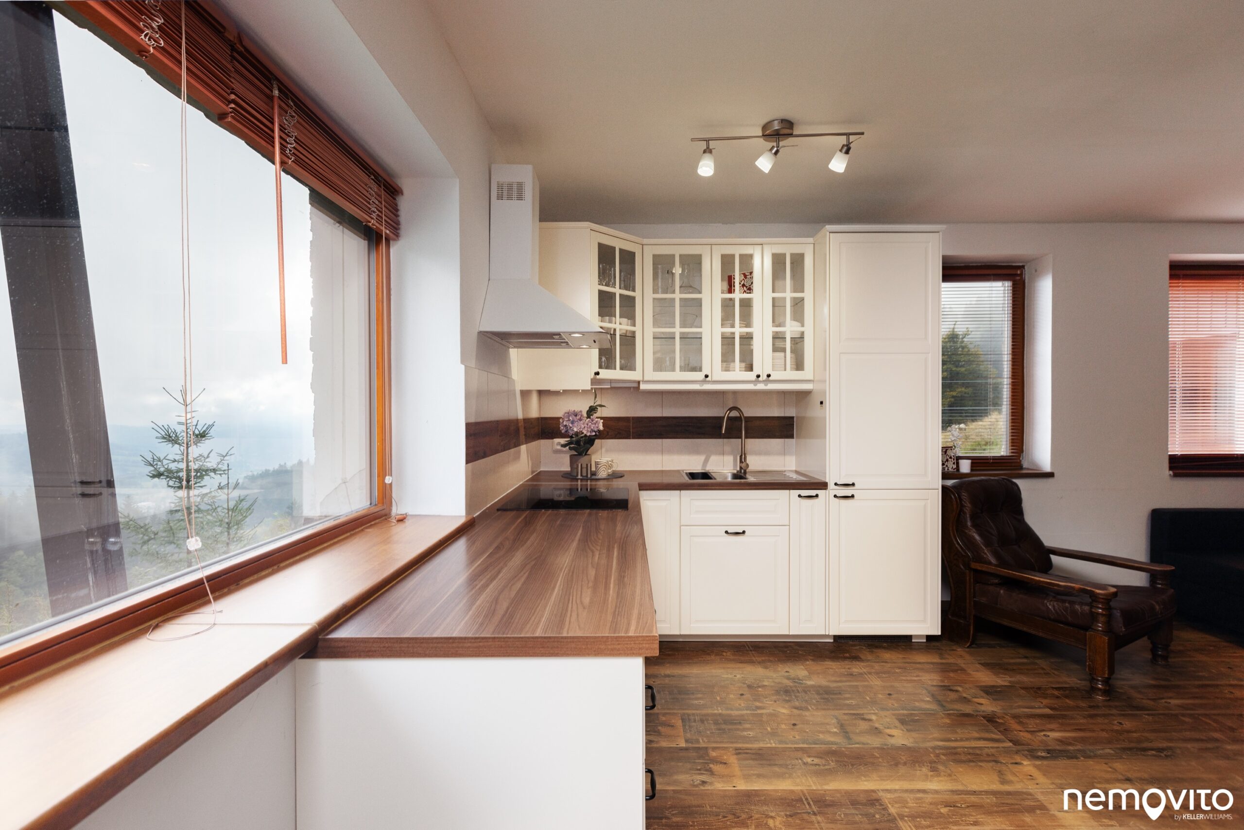Prostor však logicky rozděluje na část jídelny, kuchyně a obýváku. Mimo velkého okna na jižní straně jsou v obýváku ještě dvě menší západně orientované.