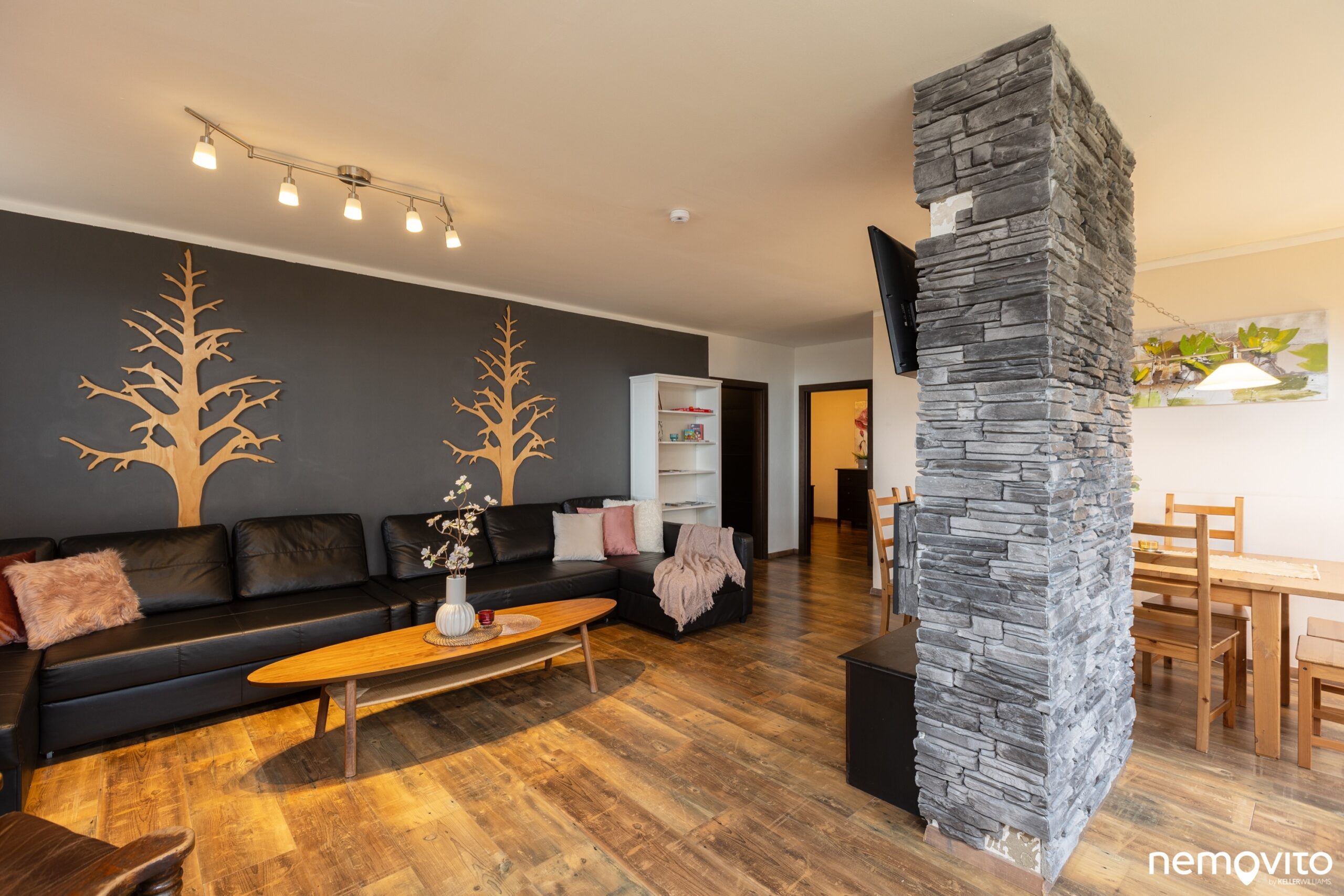 S prohlídkou velkého apartmánu začneme v obývacím pokoji, jehož plocha je celkem 37 m2. Sloup obložený kamenem, na kterém je TV a krb na biolíh, je nosným prvkem budovy a odstranit ho nelze.