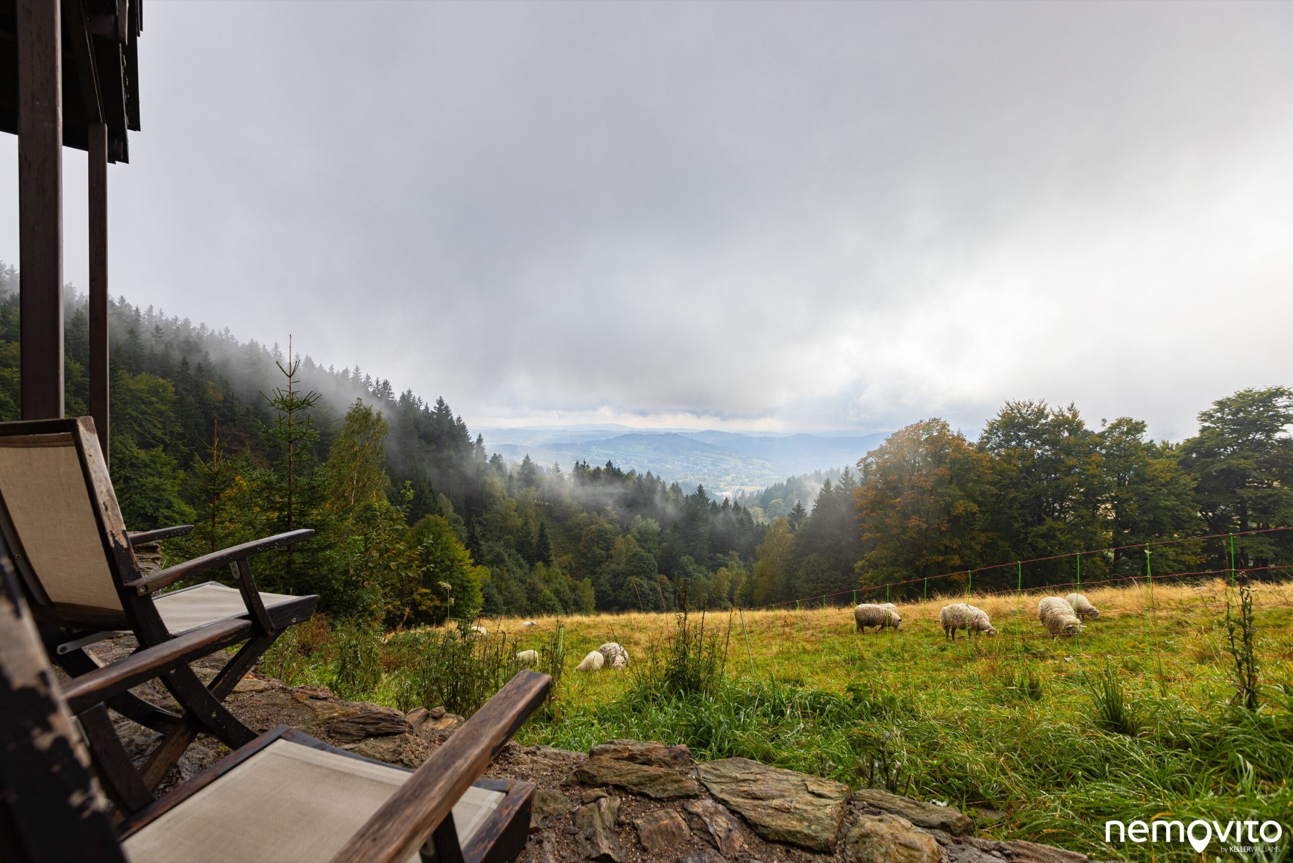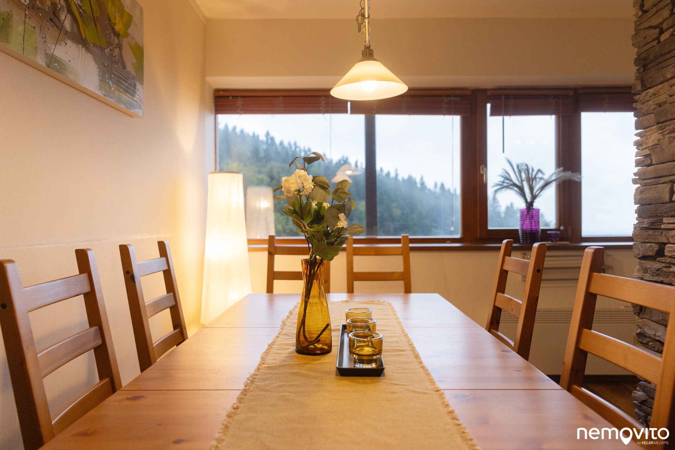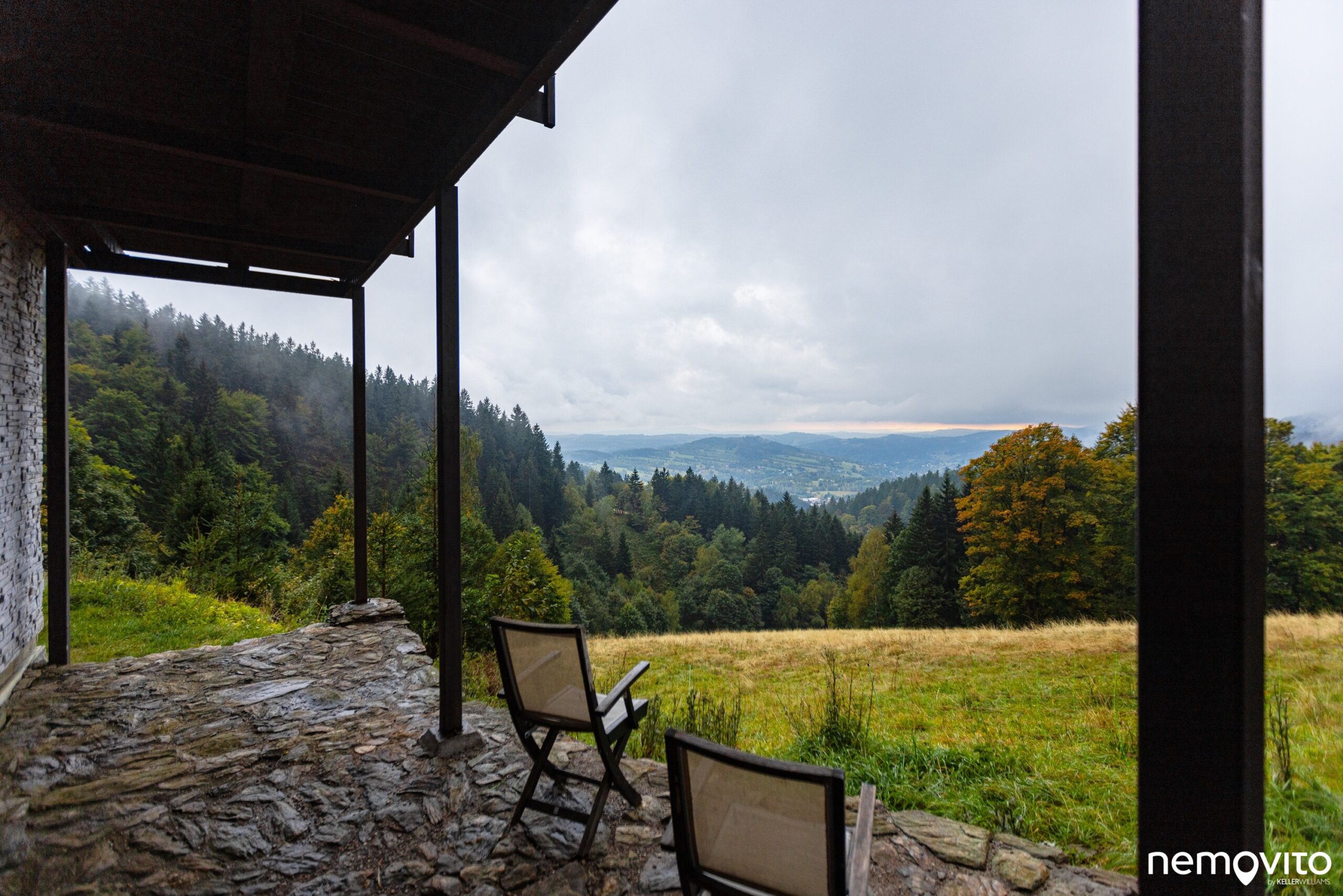 Výhled je skutečně příjemný - jenom stromy, kopce a údolí. Žádná další stavba se vám do výhledu nepostaví. Pozemek před okny patří k apartmánu. Nabízí se možnost vytvoření francouzského okna s výstupem přímo ven.