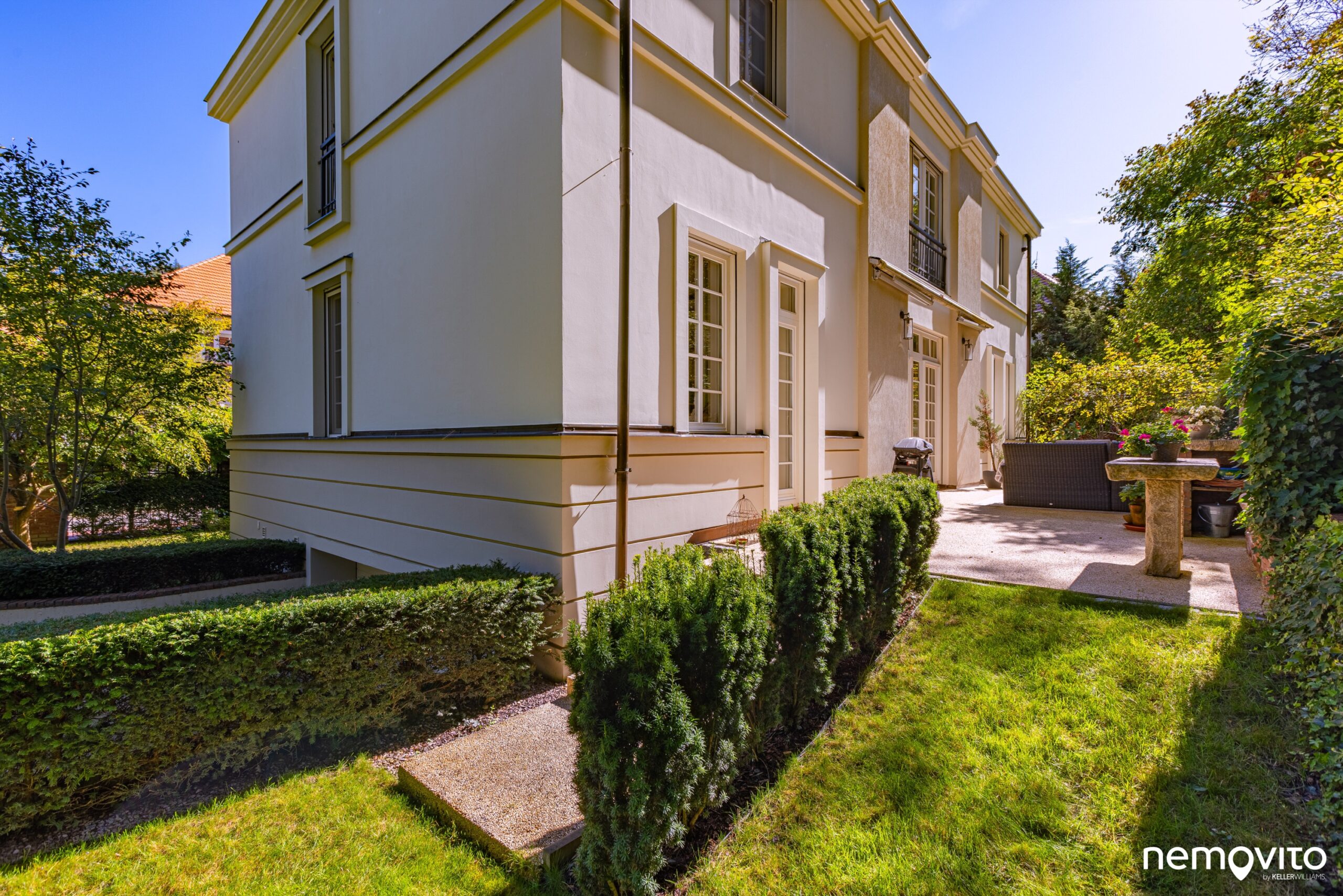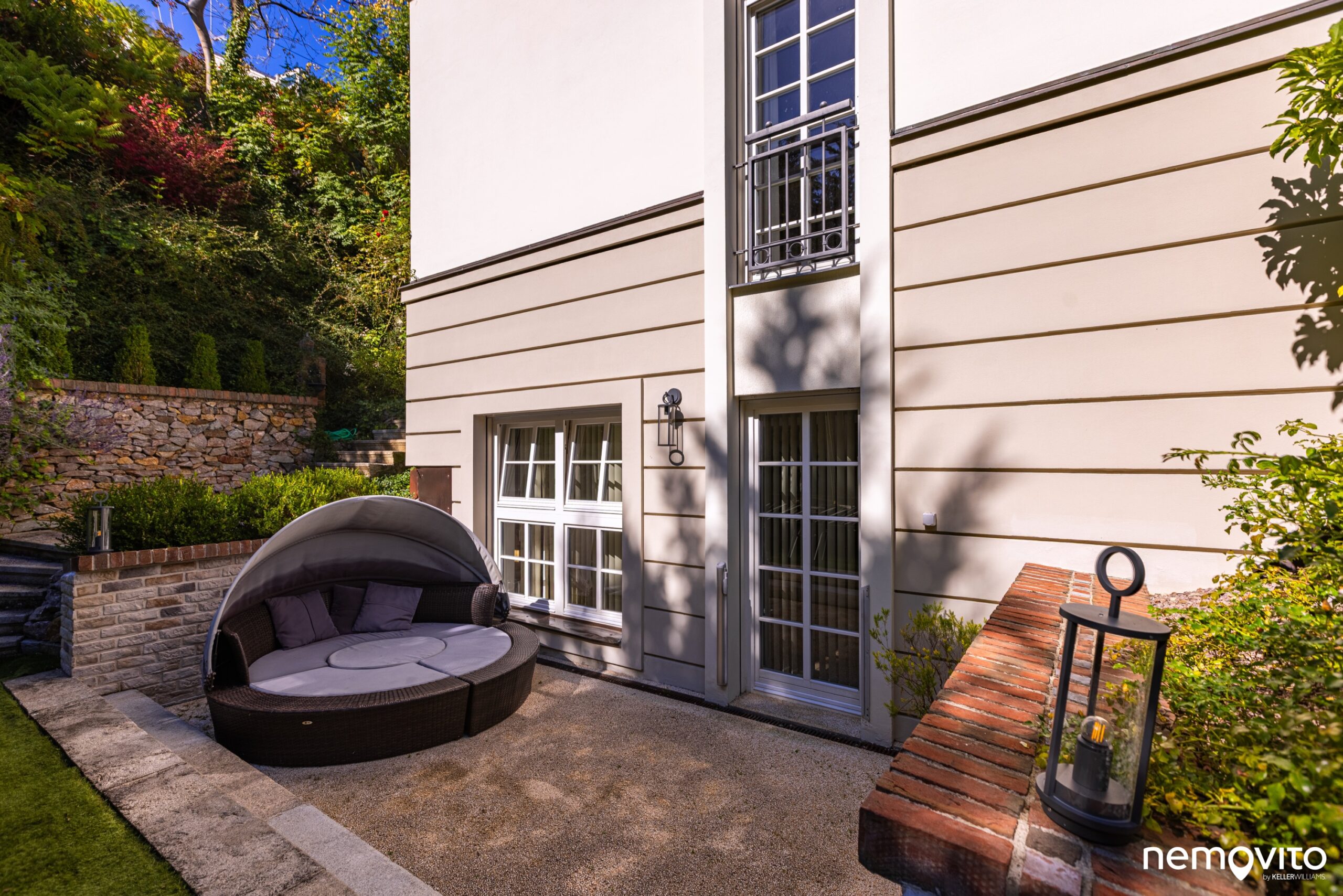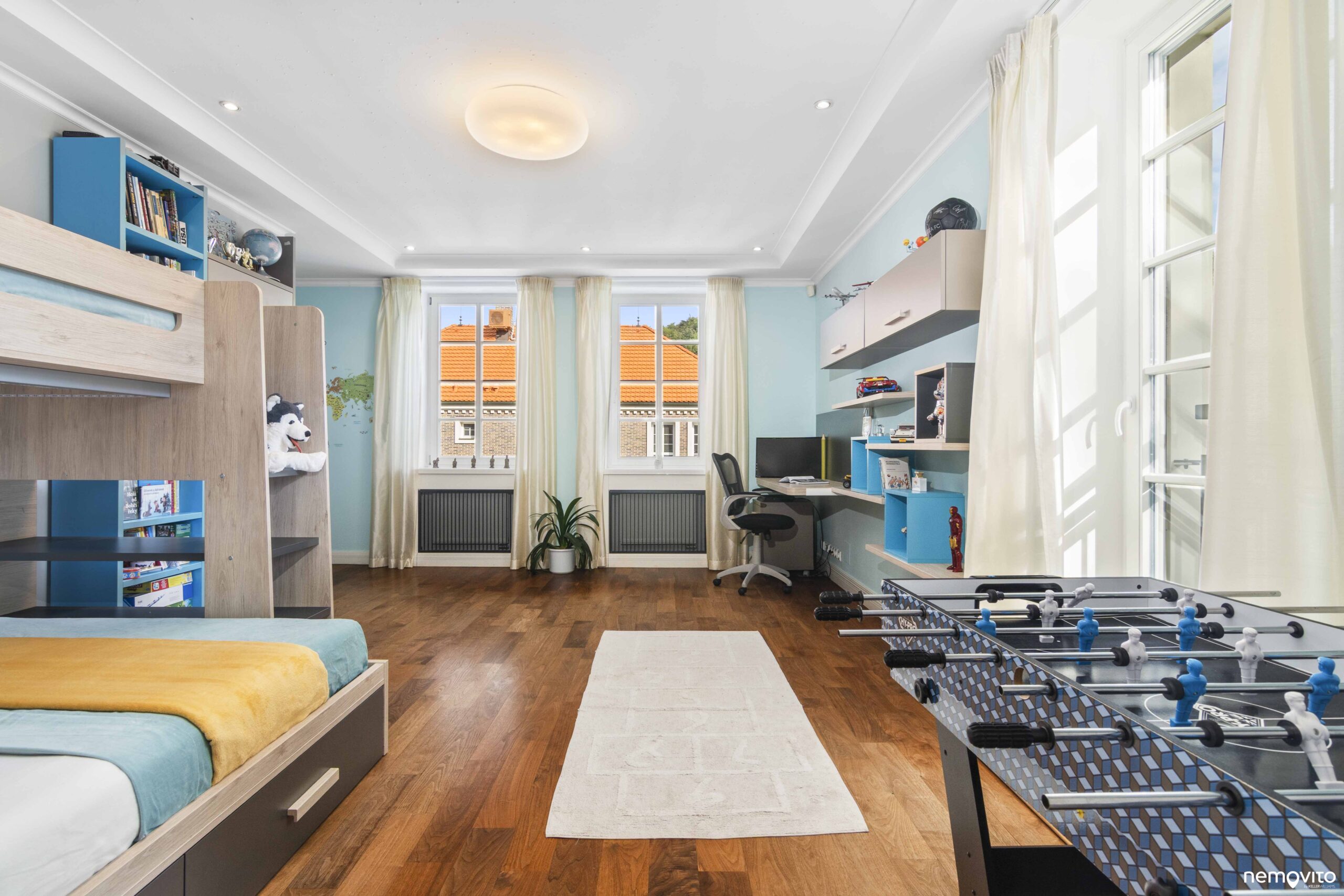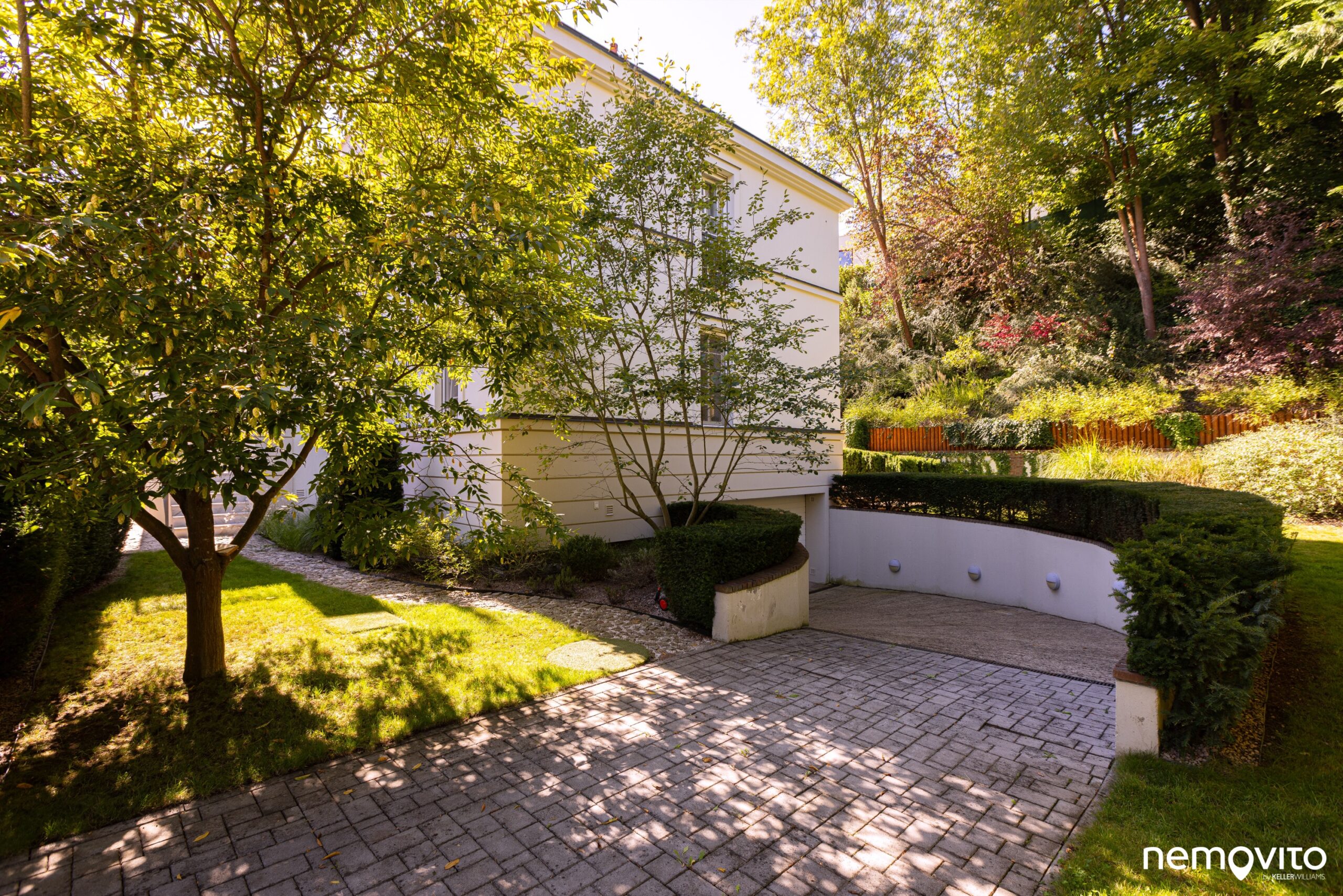 Posilovna, vnitřní bazén, parní lázeň. Vše potřebné k ranní rozcvičce či aktivitám pro pochmurné počasí naleznete dole, kde si však nebudete připadat jako ve sklepě. I do této části se dostávají paprsky díky velkým francouzským oknům z boku domu, s přístupem na jižní terasu. Díky velkým odstupům od sousedů nejsou okna stíněná, ale zejména jsou skutečně rozměrná, a tak si budete ve všech místnostech užívat velké spousty světla. Útulně zařízený interiér navodí příjemnou atmosféru již od prvních kroků. Kouzelný dojem, který vytvoří obývací pokoj s takovou plochou, že by se tu dal uspořádat malý vídeňský ples, si z první návštěvy odnesete stejně jako já. Popíjení u zapáleného krbu a gentlemanské či dámské diskuze pak dostanou skutečně nový rozměr. Hosty ubytujete v hostinské části dole, zatímco vaší ložnici nahoře asistují ještě dva dětské pokoje. Nechybí 3 koupelny, 3 hlavní šatny, technické zázemí nebo prádelna. Jednoduše neschází nic, co by pořádný dům dané kategorie měl obsahovat. Přitom však stále zůstává kompaktní a z jeho údržby, ať už technické nebo provozní, nebudete šílet. Všeho dost, ale ničeho nevyužitelný nadbytek. Smysluplný luxus, který zůstává mimo zraky veřejnosti, a který nemusí křičet do ulice. Objevte kouzlo gated community, která je v Čechách stále velmi neobvyklá, a to přímo v jednom z nejhezčích a nejzelenějších míst hlavního města.