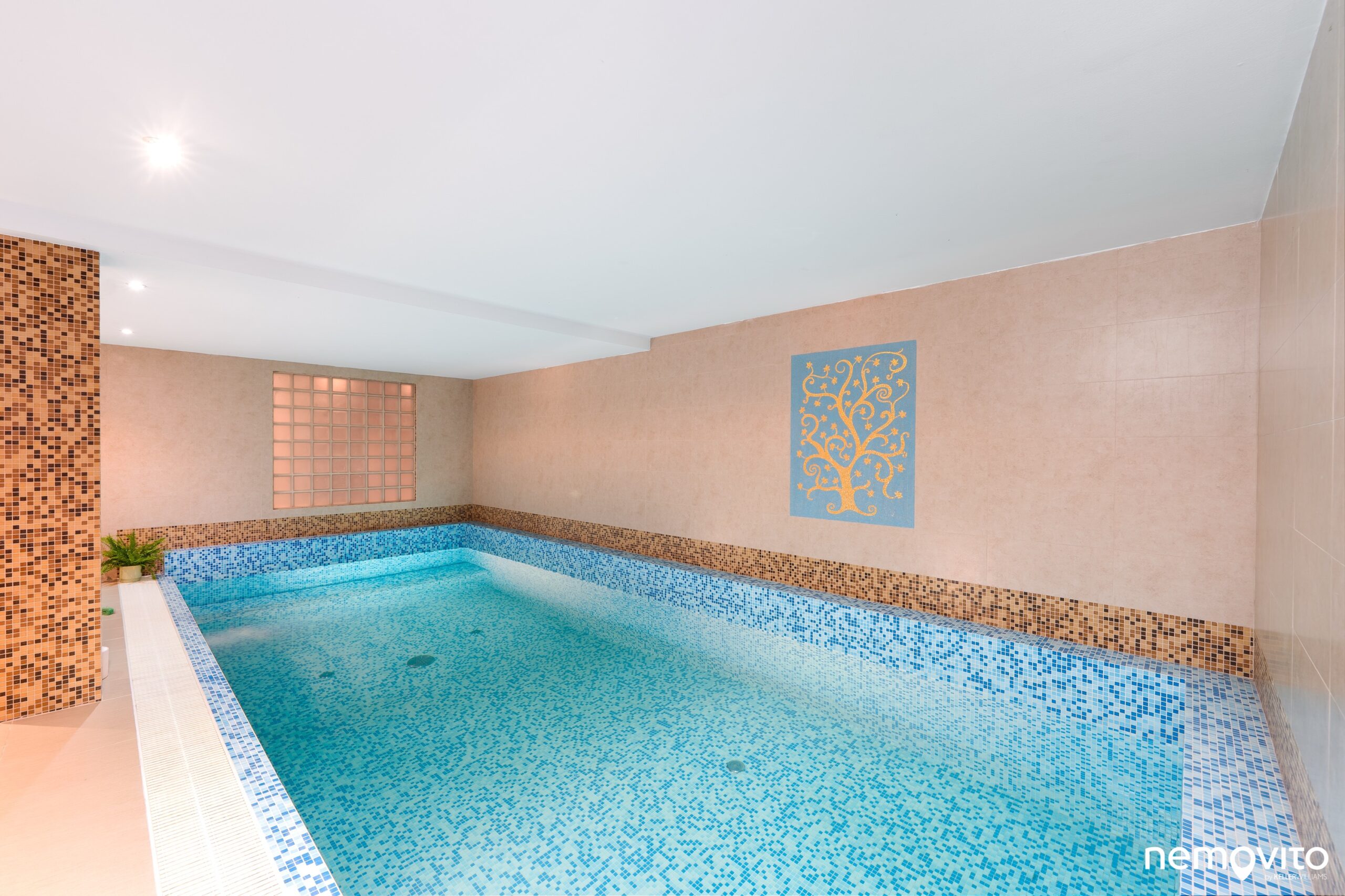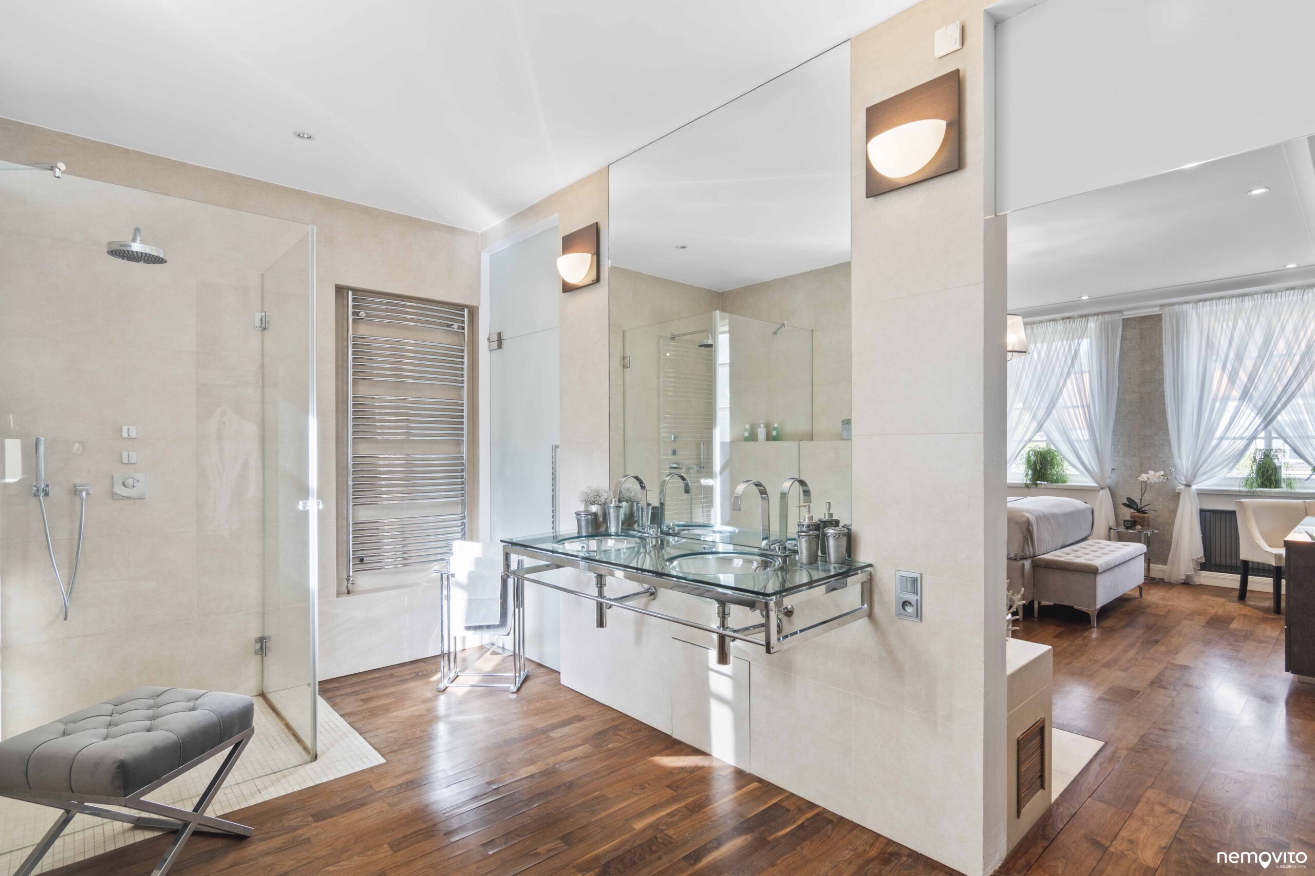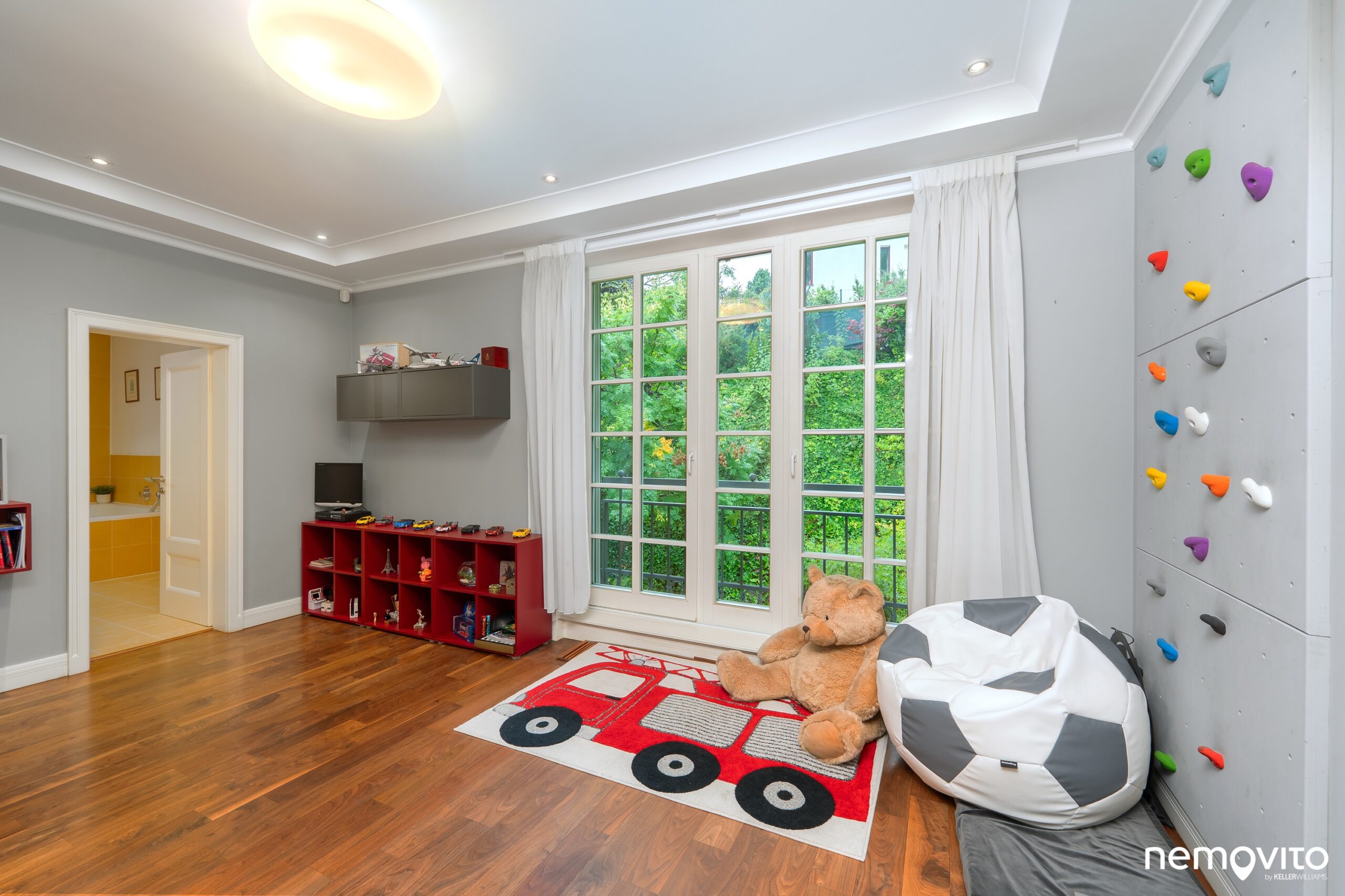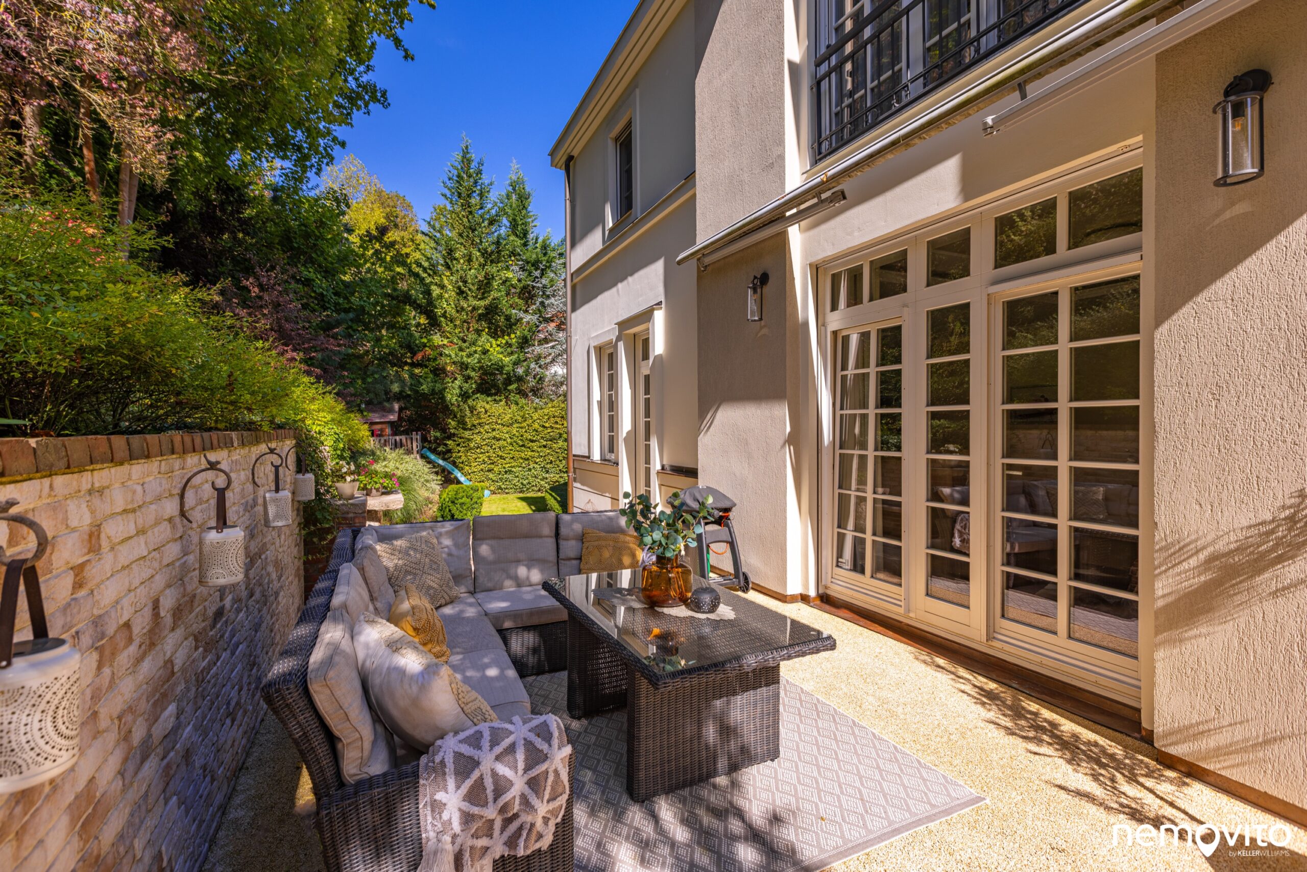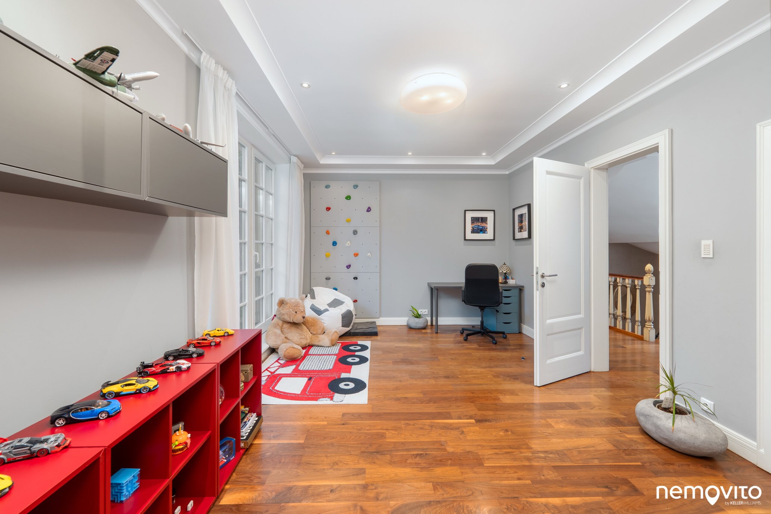 Posilovna, vnitřní bazén, parní lázeň. Vše potřebné k ranní rozcvičce či aktivitám pro pochmurné počasí naleznete dole, kde si však nebudete připadat jako ve sklepě. I do této části se dostávají paprsky díky velkým francouzským oknům z boku domu, s přístupem na jižní terasu. Díky velkým odstupům od sousedů nejsou okna stíněná, ale zejména jsou skutečně rozměrná, a tak si budete ve všech místnostech užívat velké spousty světla. Útulně zařízený interiér navodí příjemnou atmosféru již od prvních kroků. Kouzelný dojem, který vytvoří obývací pokoj s takovou plochou, že by se tu dal uspořádat malý vídeňský ples, si z první návštěvy odnesete stejně jako já. Popíjení u zapáleného krbu a gentlemanské či dámské diskuze pak dostanou skutečně nový rozměr. Hosty ubytujete v hostinské části dole, zatímco vaší ložnici nahoře asistují ještě dva dětské pokoje. Nechybí 3 koupelny, 3 hlavní šatny, technické zázemí nebo prádelna. Jednoduše neschází nic, co by pořádný dům dané kategorie měl obsahovat. Přitom však stále zůstává kompaktní a z jeho údržby, ať už technické nebo provozní, nebudete šílet. Všeho dost, ale ničeho nevyužitelný nadbytek. Smysluplný luxus, který zůstává mimo zraky veřejnosti, a který nemusí křičet do ulice. Objevte kouzlo gated community, která je v Čechách stále velmi neobvyklá, a to přímo v jednom z nejhezčích a nejzelenějších míst hlavního města.
