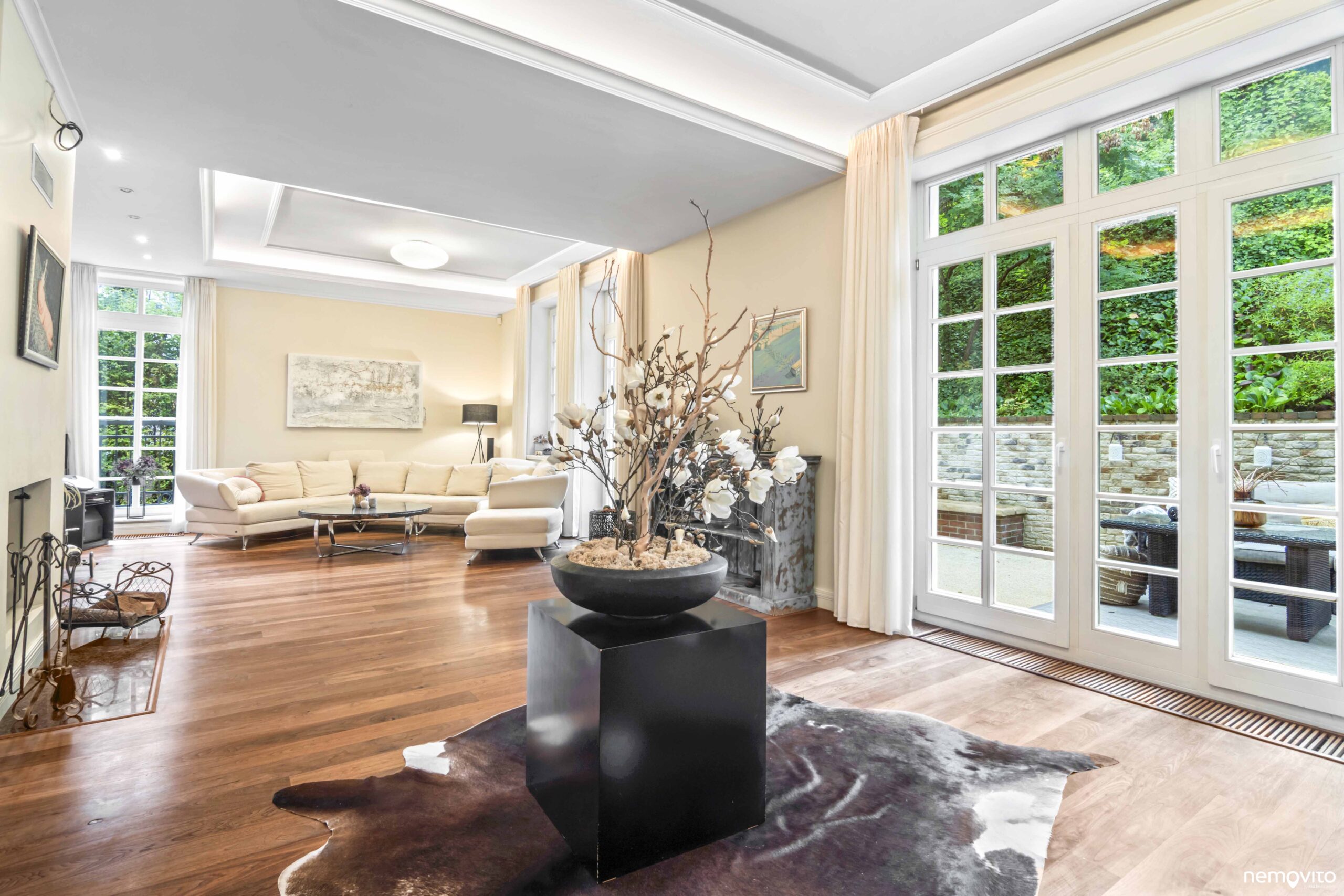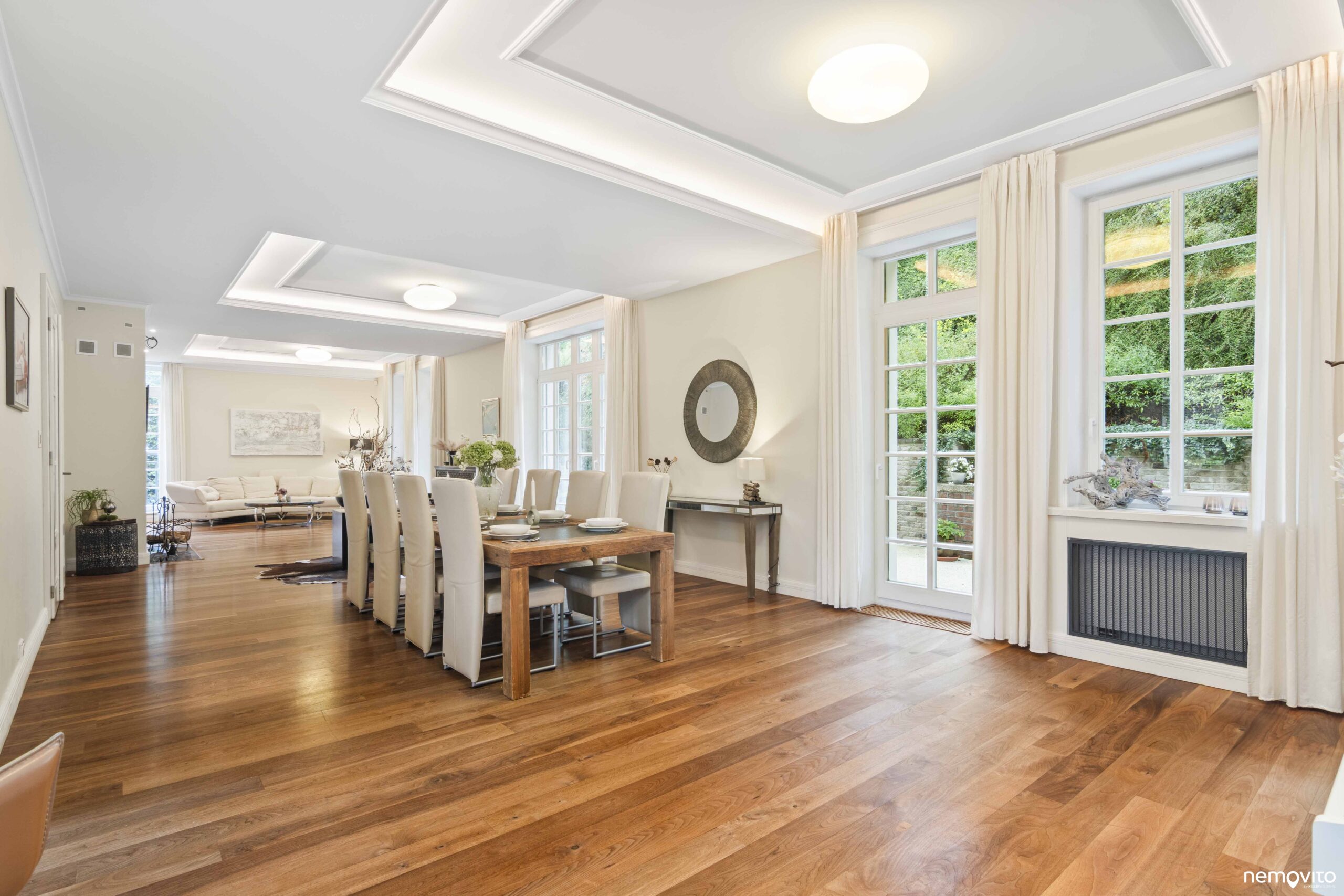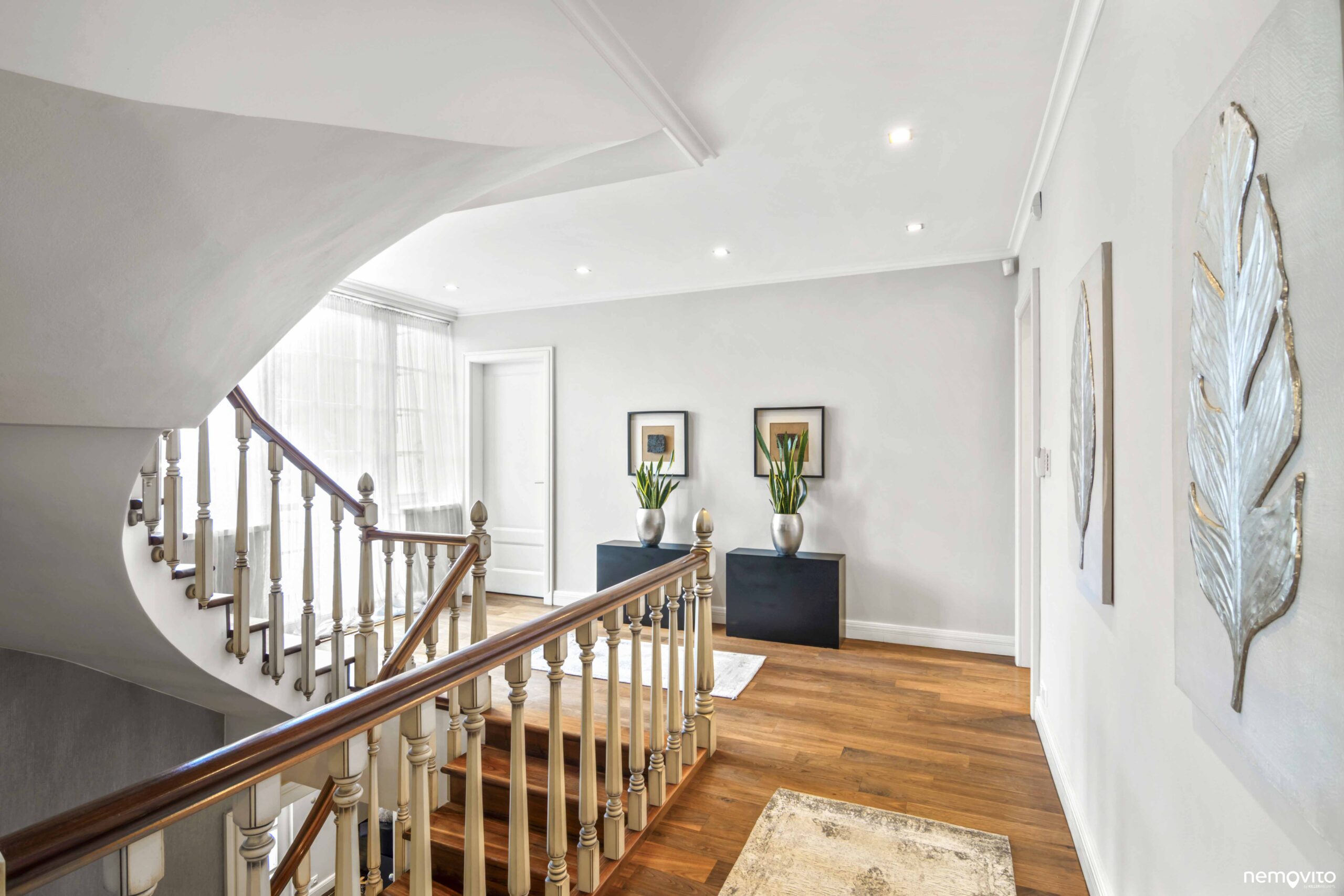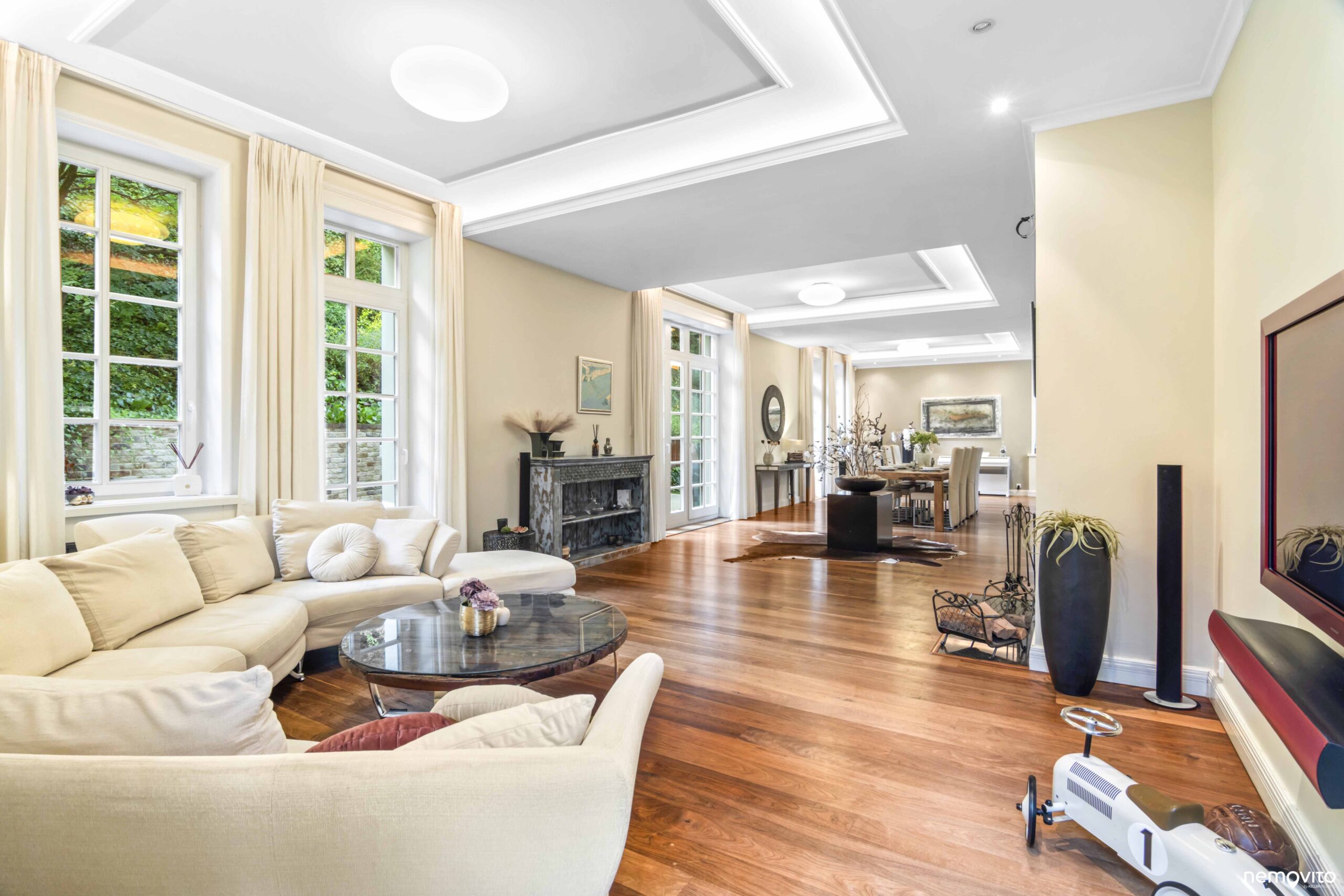 Posilovna, vnitřní bazén, parní lázeň. Vše potřebné k ranní rozcvičce či aktivitám pro pochmurné počasí naleznete dole, kde si však nebudete připadat jako ve sklepě. I do této části se dostávají paprsky díky velkým francouzským oknům z boku domu, s přístupem na jižní terasu. Díky velkým odstupům od sousedů nejsou okna stíněná, ale zejména jsou skutečně rozměrná, a tak si budete ve všech místnostech užívat velké spousty světla. Útulně zařízený interiér navodí příjemnou atmosféru již od prvních kroků. Kouzelný dojem, který vytvoří obývací pokoj s takovou plochou, že by se tu dal uspořádat malý vídeňský ples, si z první návštěvy odnesete stejně jako já. Popíjení u zapáleného krbu a gentlemanské či dámské diskuze pak dostanou skutečně nový rozměr. Hosty ubytujete v hostinské části dole, zatímco vaší ložnici nahoře asistují ještě dva dětské pokoje. Nechybí 3 koupelny, 3 hlavní šatny, technické zázemí nebo prádelna. Jednoduše neschází nic, co by pořádný dům dané kategorie měl obsahovat. Přitom však stále zůstává kompaktní a z jeho údržby, ať už technické nebo provozní, nebudete šílet. Všeho dost, ale ničeho nevyužitelný nadbytek. Smysluplný luxus, který zůstává mimo zraky veřejnosti, a který nemusí křičet do ulice. Objevte kouzlo gated community, která je v Čechách stále velmi neobvyklá, a to přímo v jednom z nejhezčích a nejzelenějších míst hlavního města.