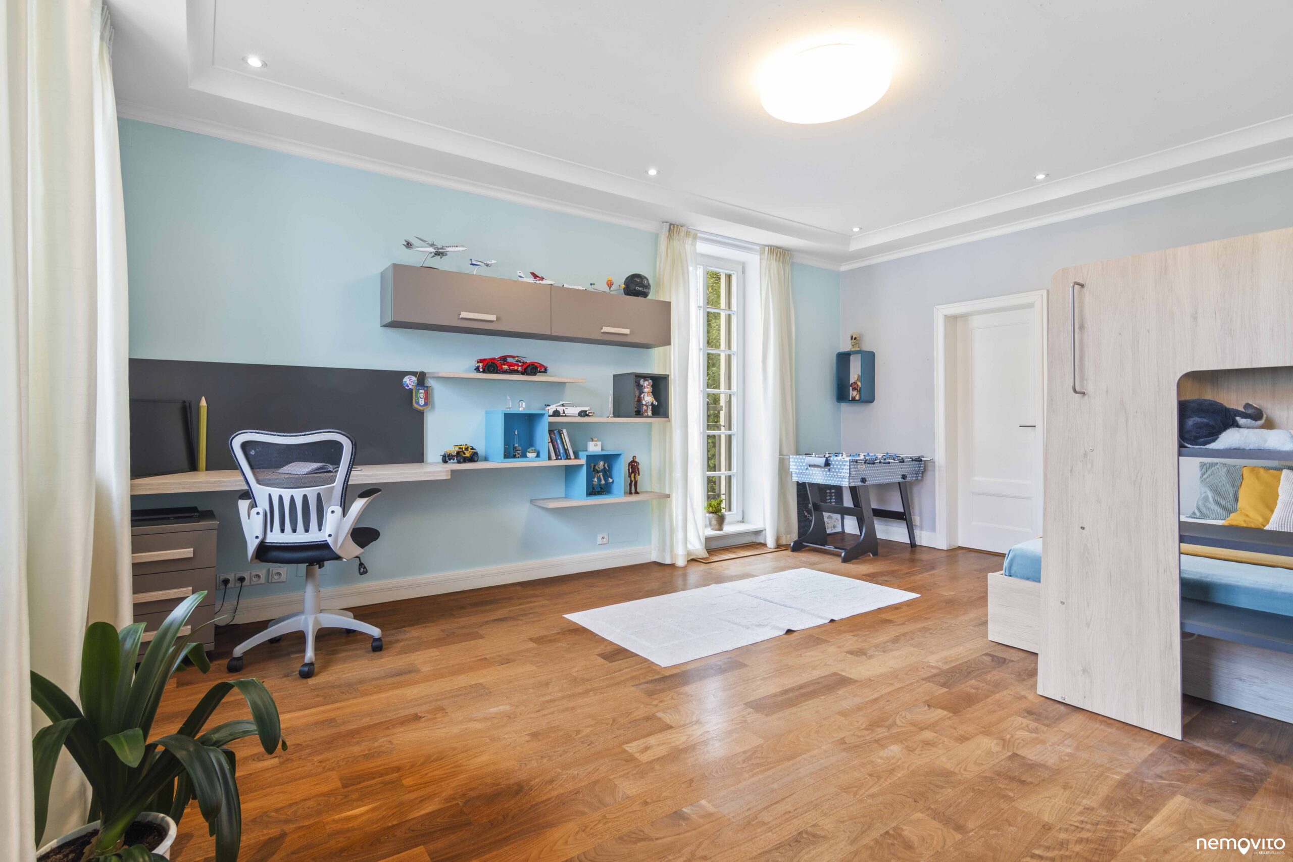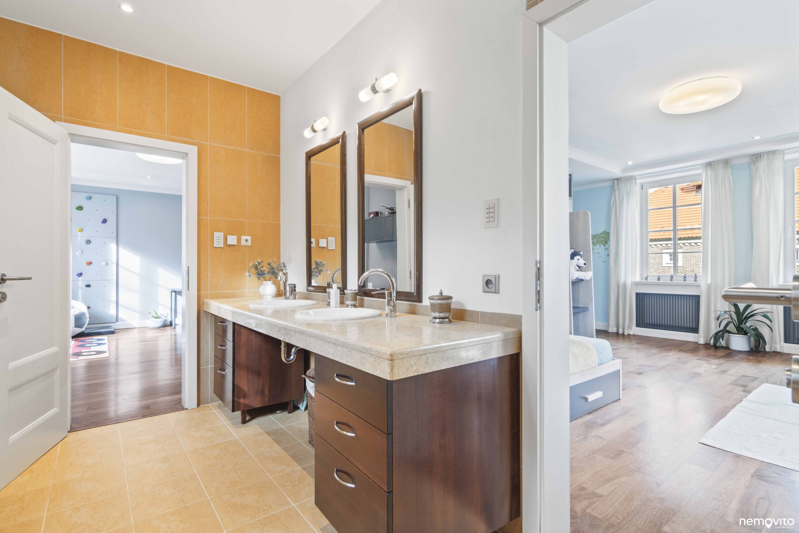 Dětské pokoje jsou spojené přes velkou koupelnu (11 m2) s vanou a sprchou. Propojené jsou taktéž velkou šatnou, kterou na fotkách nemáme.