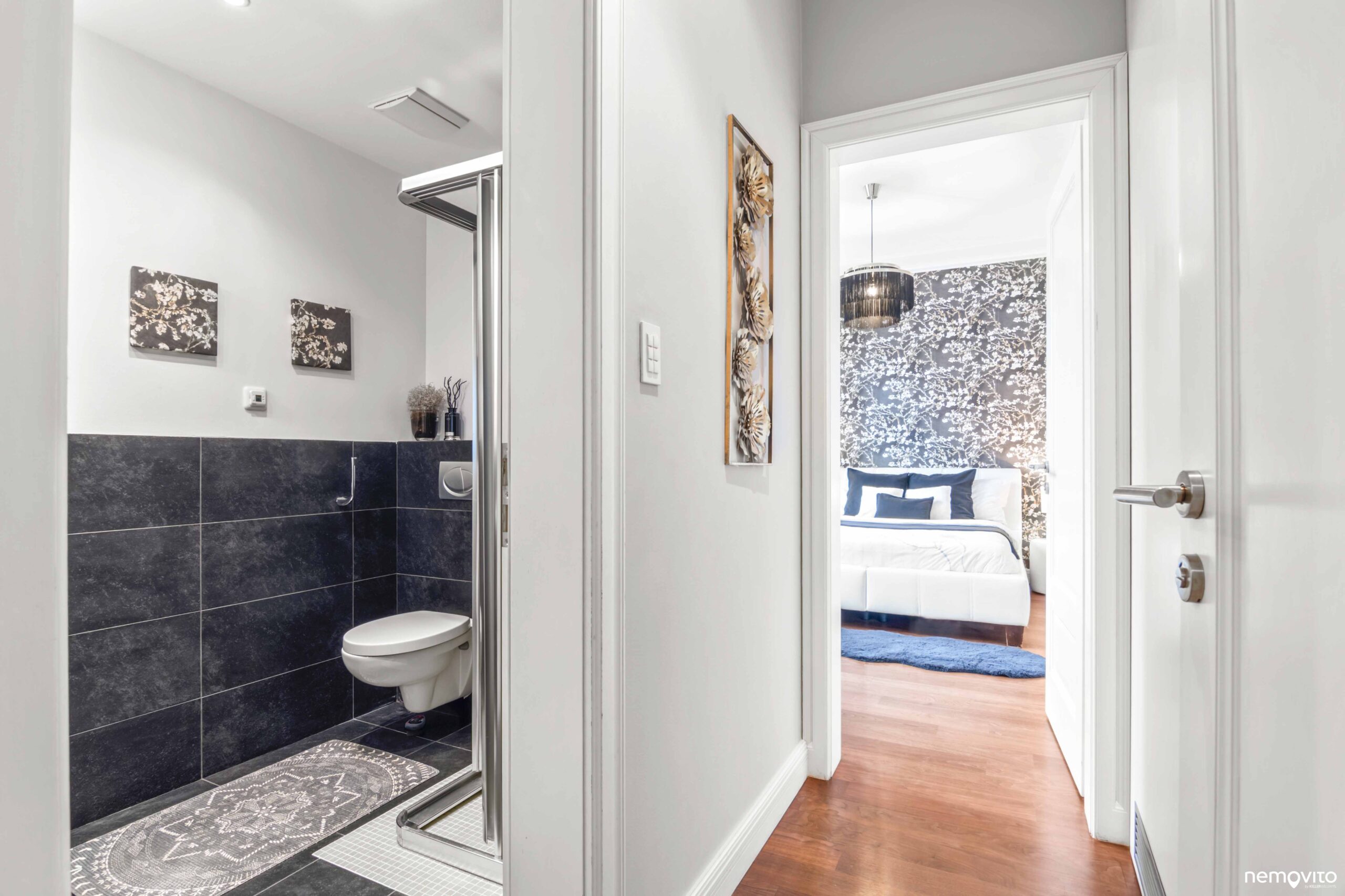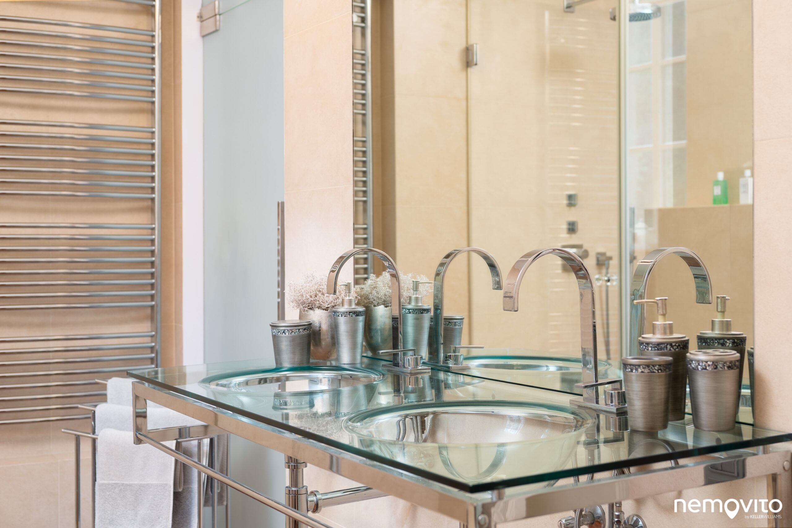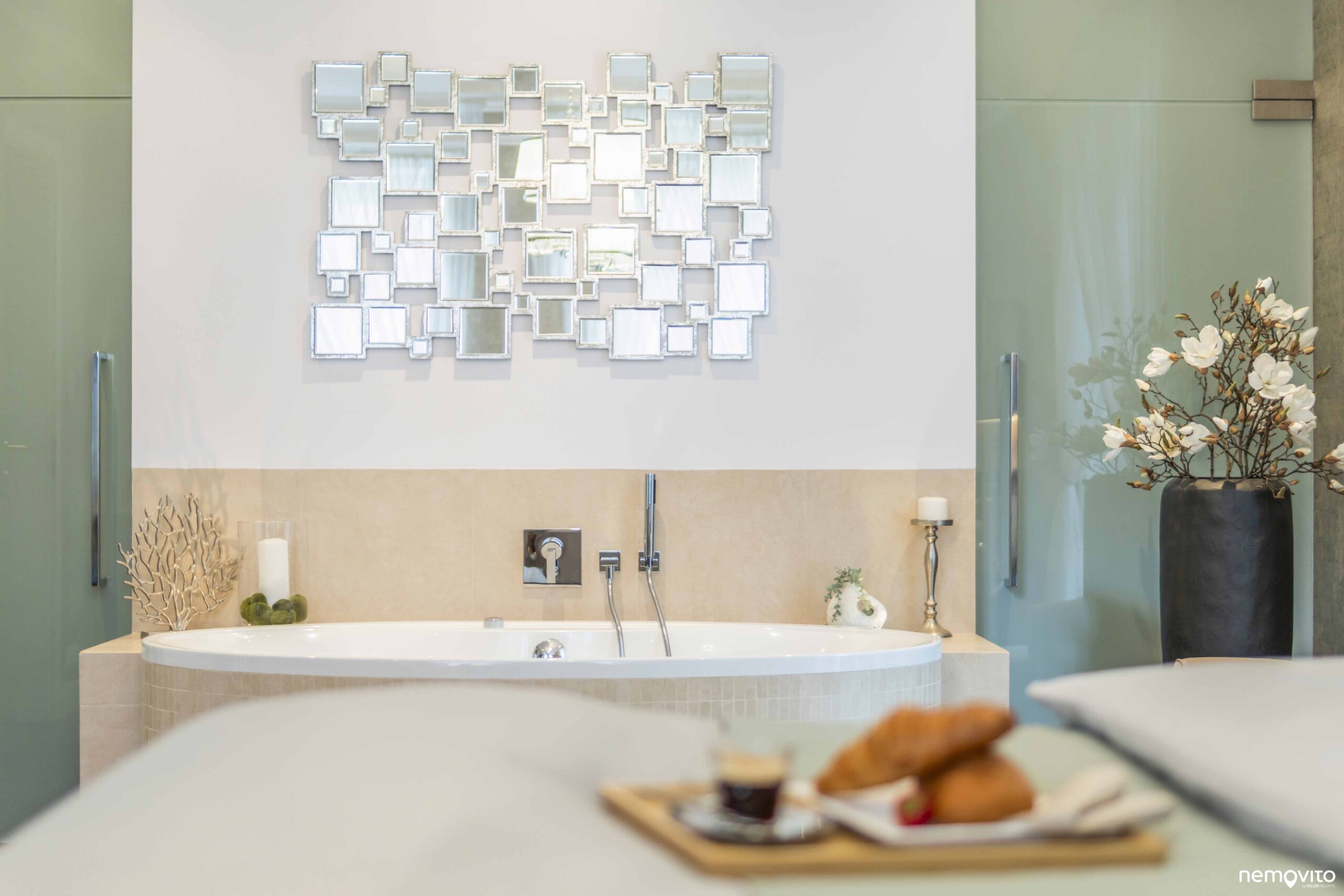 Koupelna je od ložnice oddělena příčkou a dvojicí posuvných dveří s mléčným sklem. Mimo volně stojící vany je k dispozici rovněž sprchový kout. Ve všech koupelnách domu je podlahové topení.