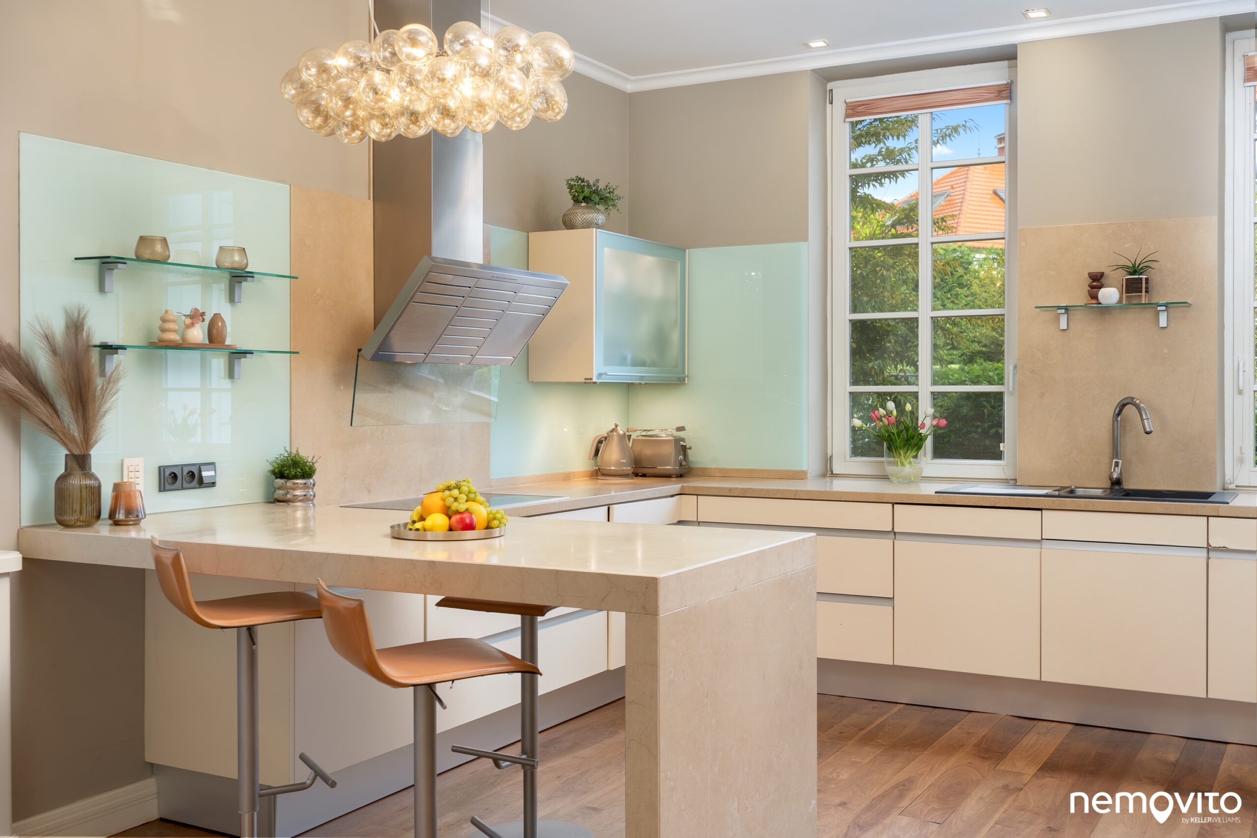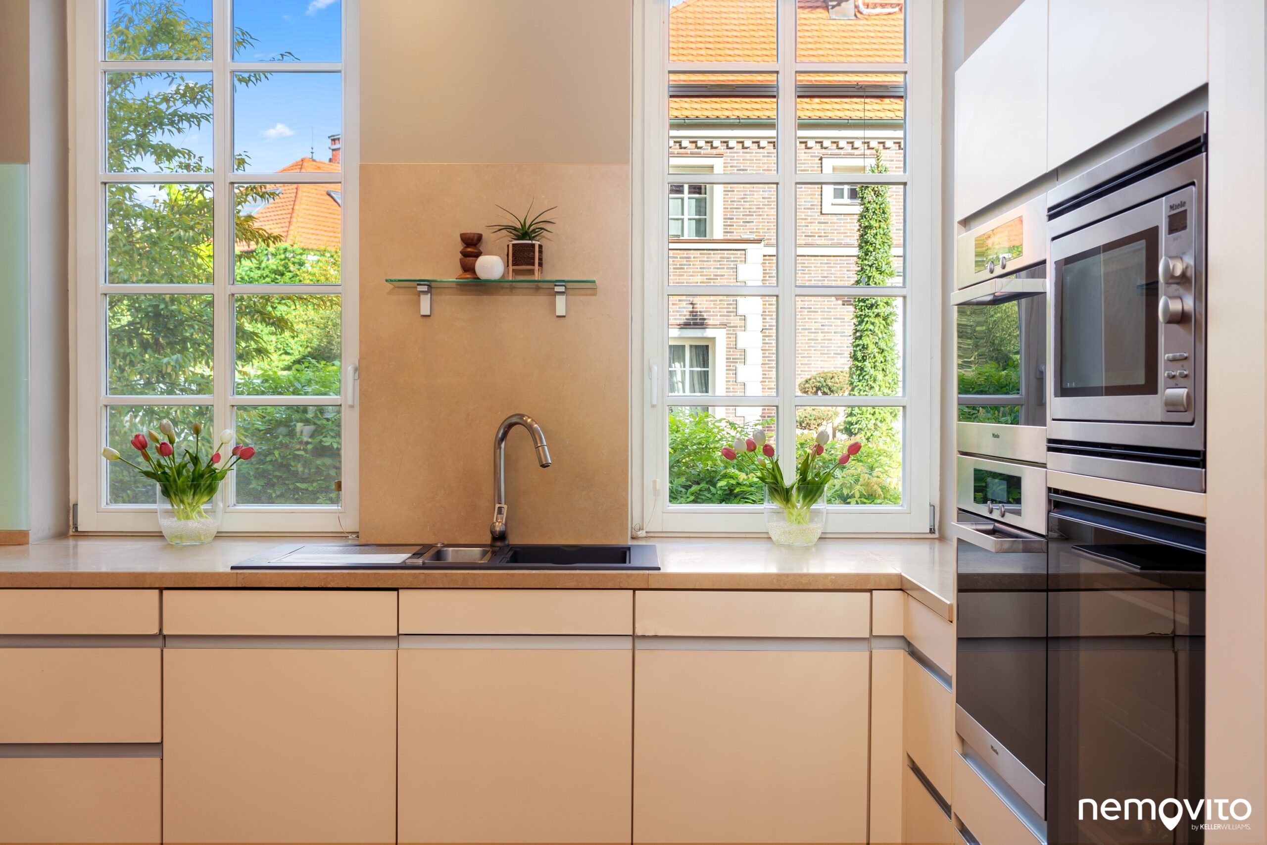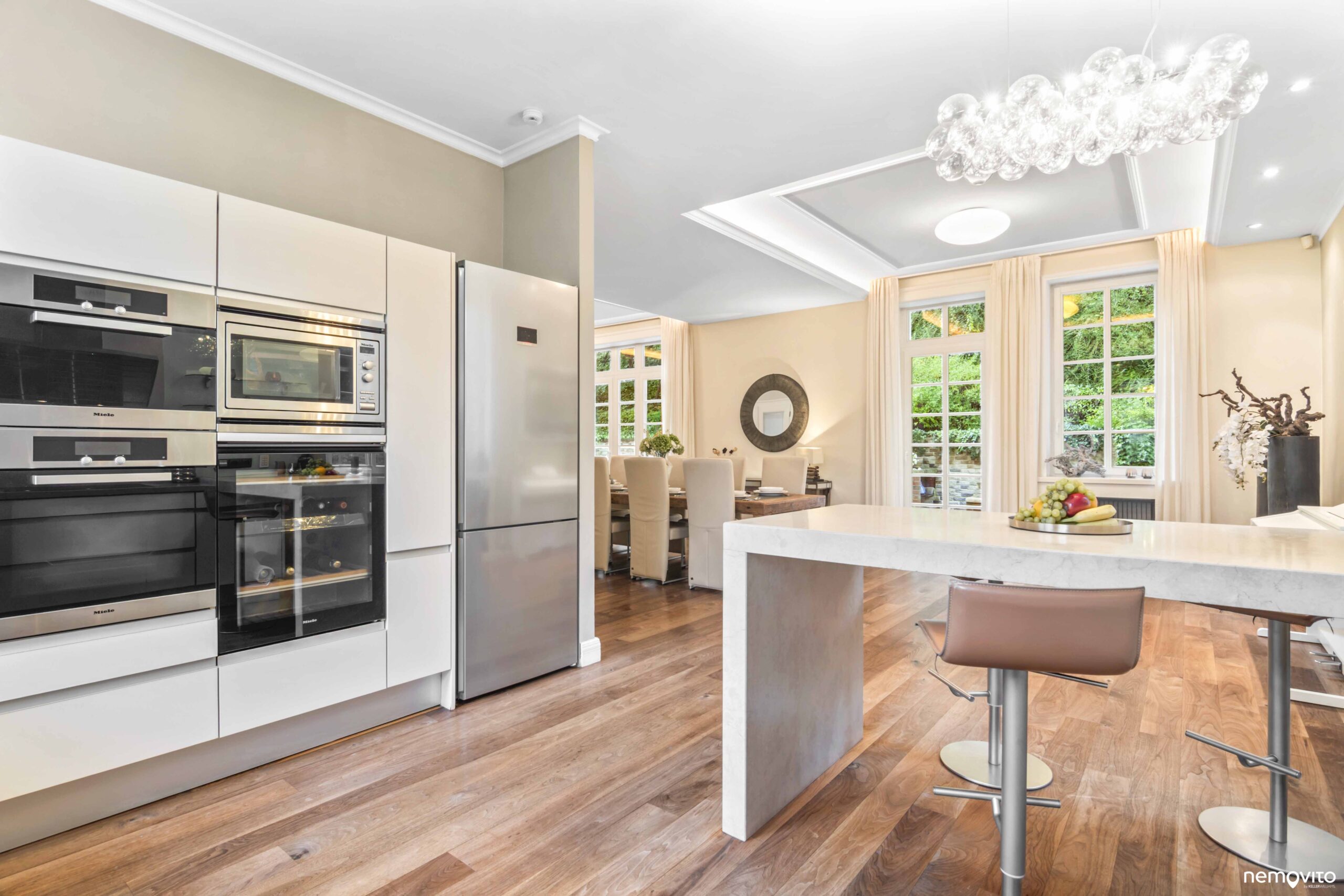 Část s kuchyní má hezkých 15 m2. Je řešena do tvaru U s barovým pultem. Spotřebiče jsou původní, nicméně s ohledem na kvalitní řadu Miele velmi trvanlivé a plně funkční. Nechybí vestavěná vinotéka, dva druhy trouby, široká lednice.
