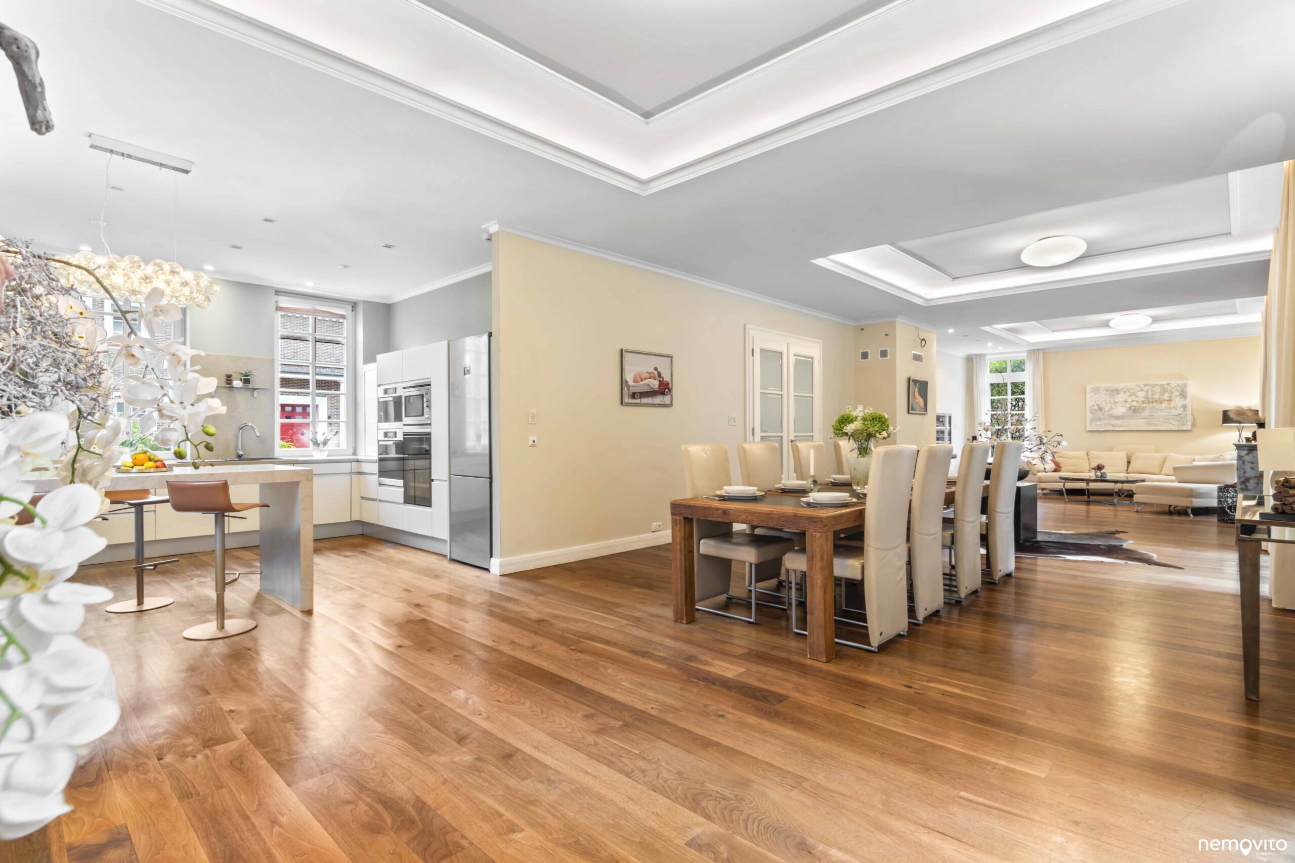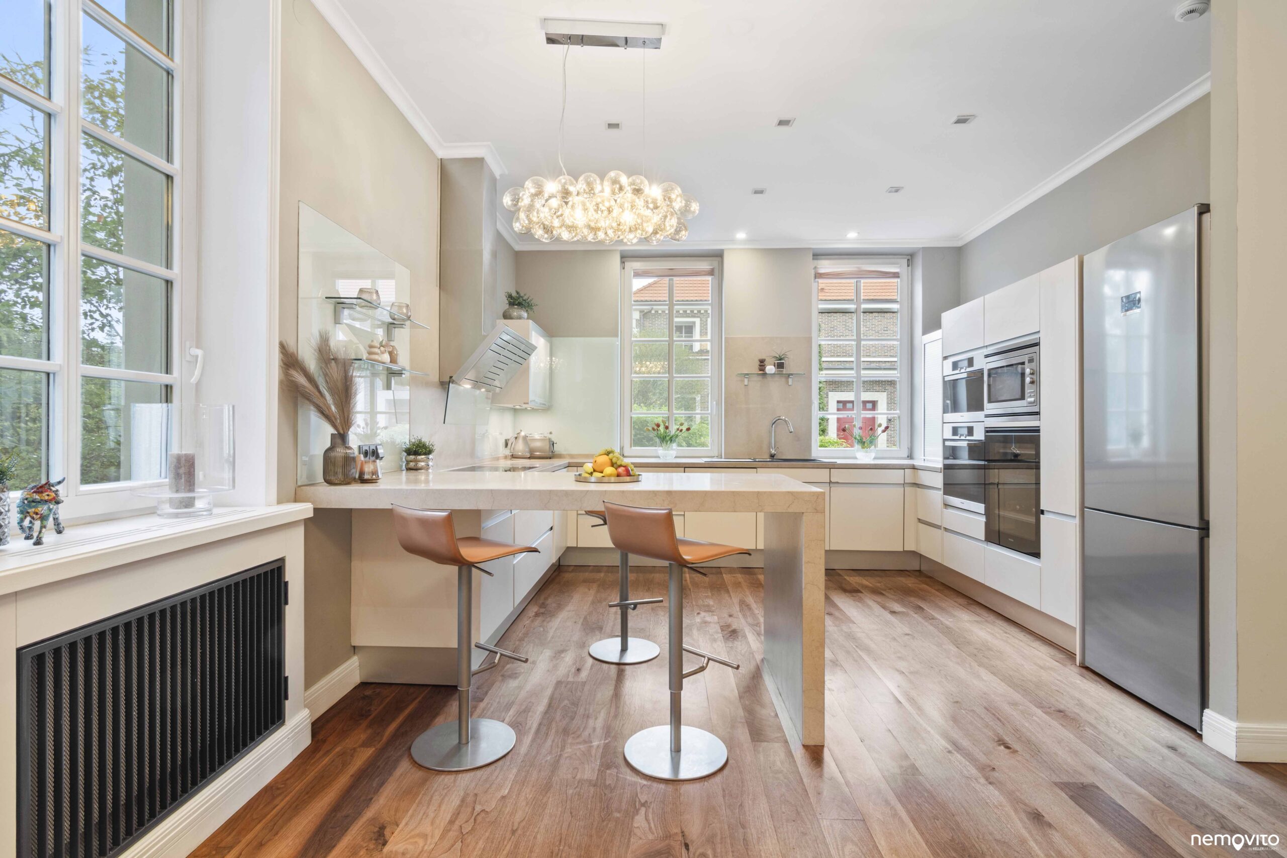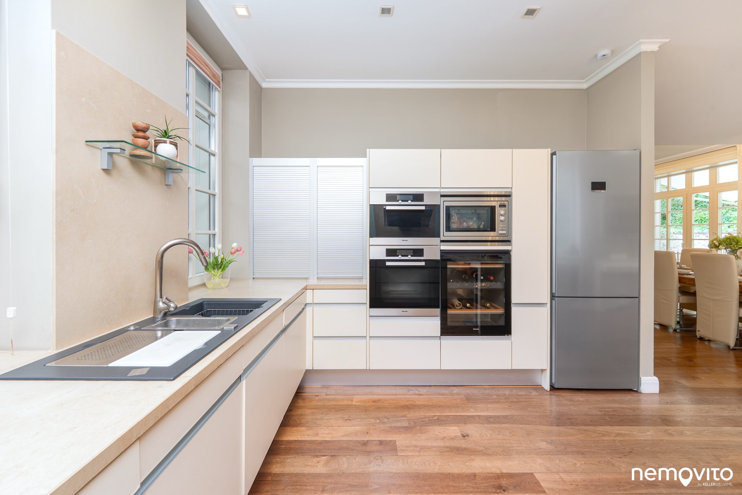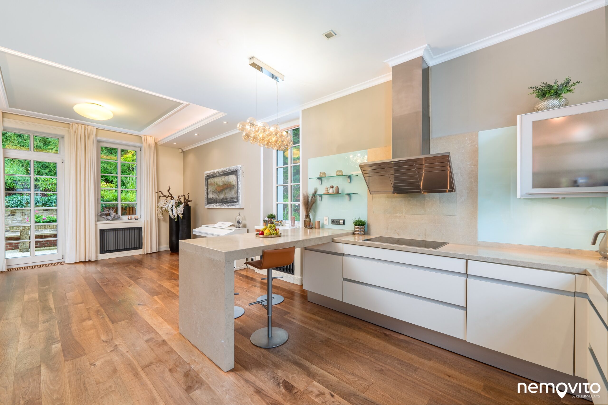 Část s kuchyní má hezkých 15 m2. Je řešena do tvaru U s barovým pultem. Spotřebiče jsou původní, nicméně s ohledem na kvalitní řadu Miele velmi trvanlivé a plně funkční. Nechybí vestavěná vinotéka, dva druhy trouby, široká lednice.
