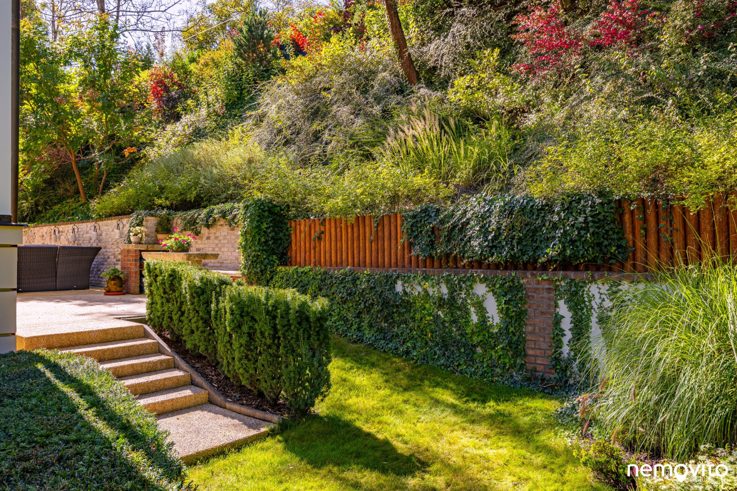 Severní část pozemku tvoří svah, který vytváří zelenou stěnu. Ta vypadá skvěle při pohledu z oken obýváku a jídelny.