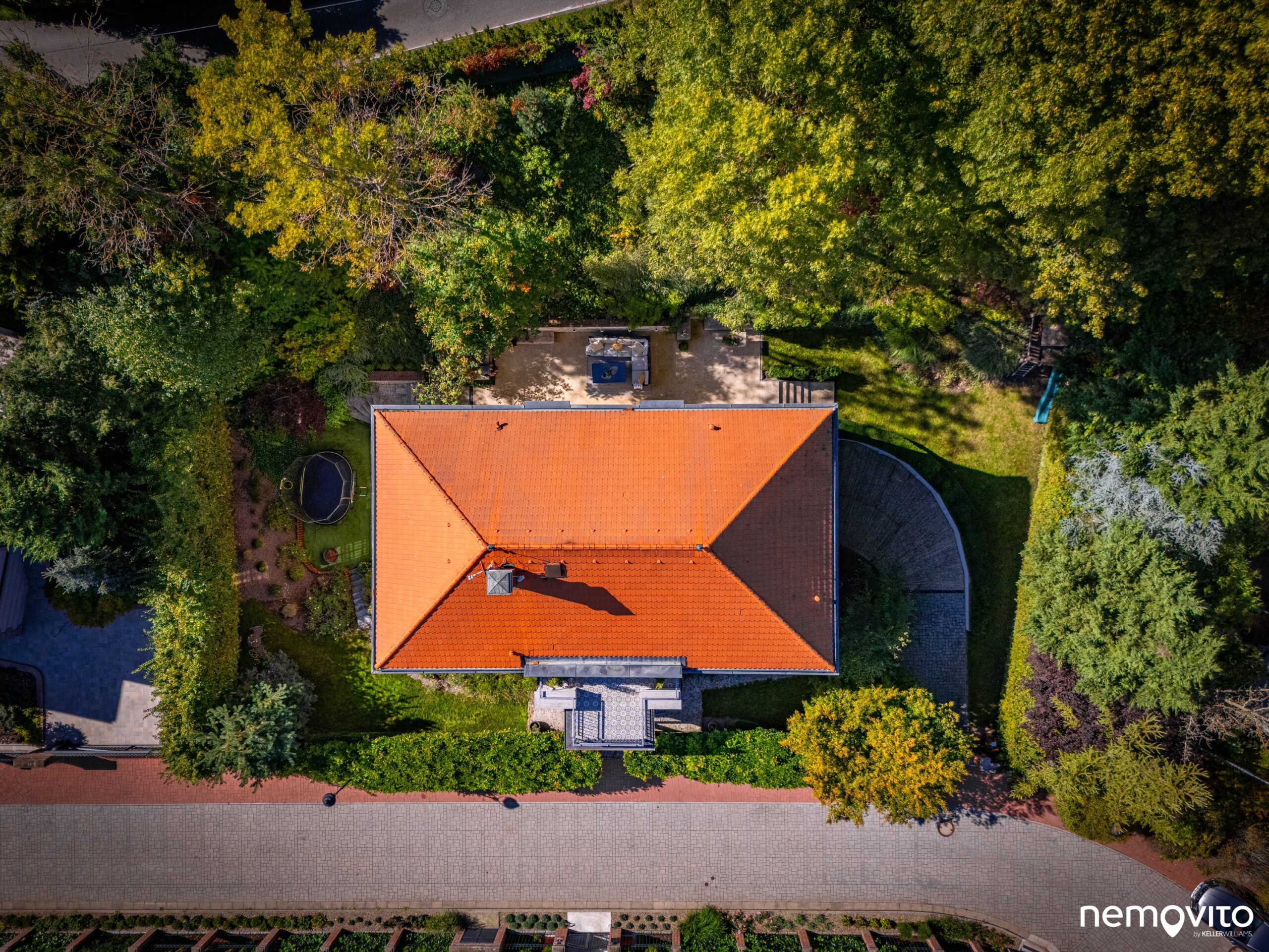 Vila je umístěna na pozemku o velikosti 1.067 m2, jehož severní stranu tvoří svah. Vstup do domu je z jihu. Znamená to tedy, že ze zadní strany není žádný přímý soused a na terase u obýváku tak sedíte v absolutním soukromí. Z pravé strany je vjezd do garáže, zleva pak terasa u vnitřního bazénu.