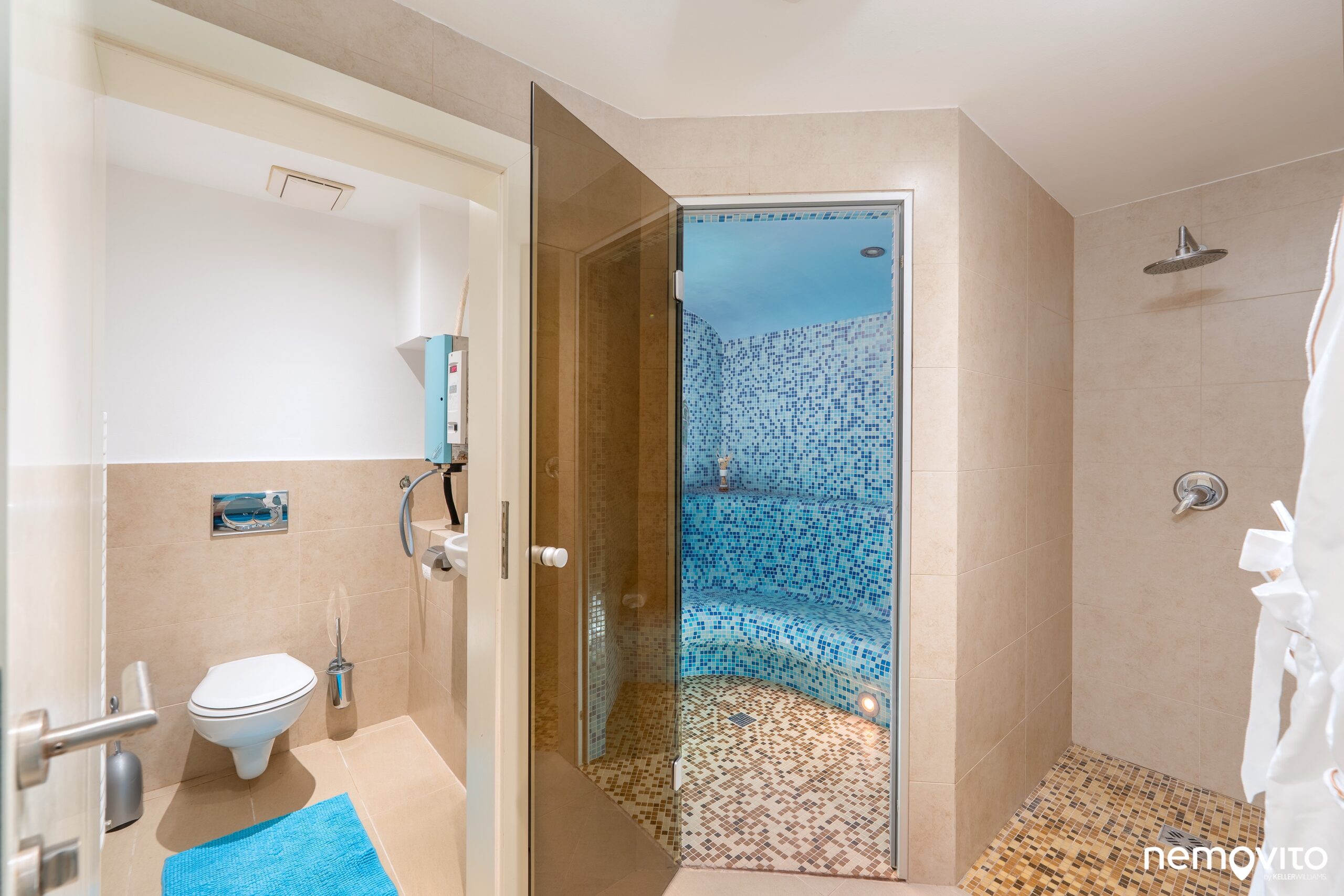 Mimo bazénu se můžete těšit také na parní lázeň a abyste nemuseli běhat po domě, je tu rovněž WC a sprcha.