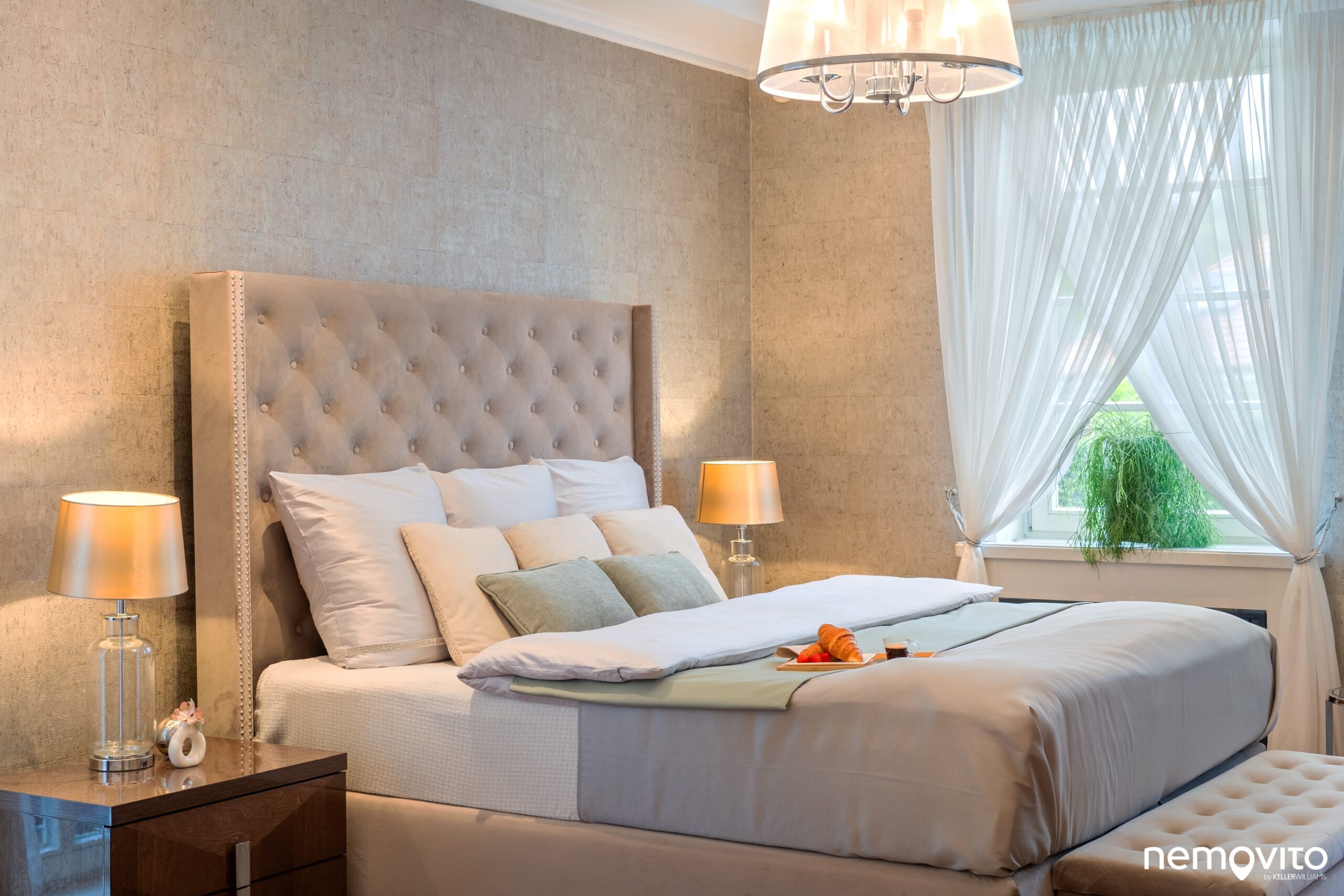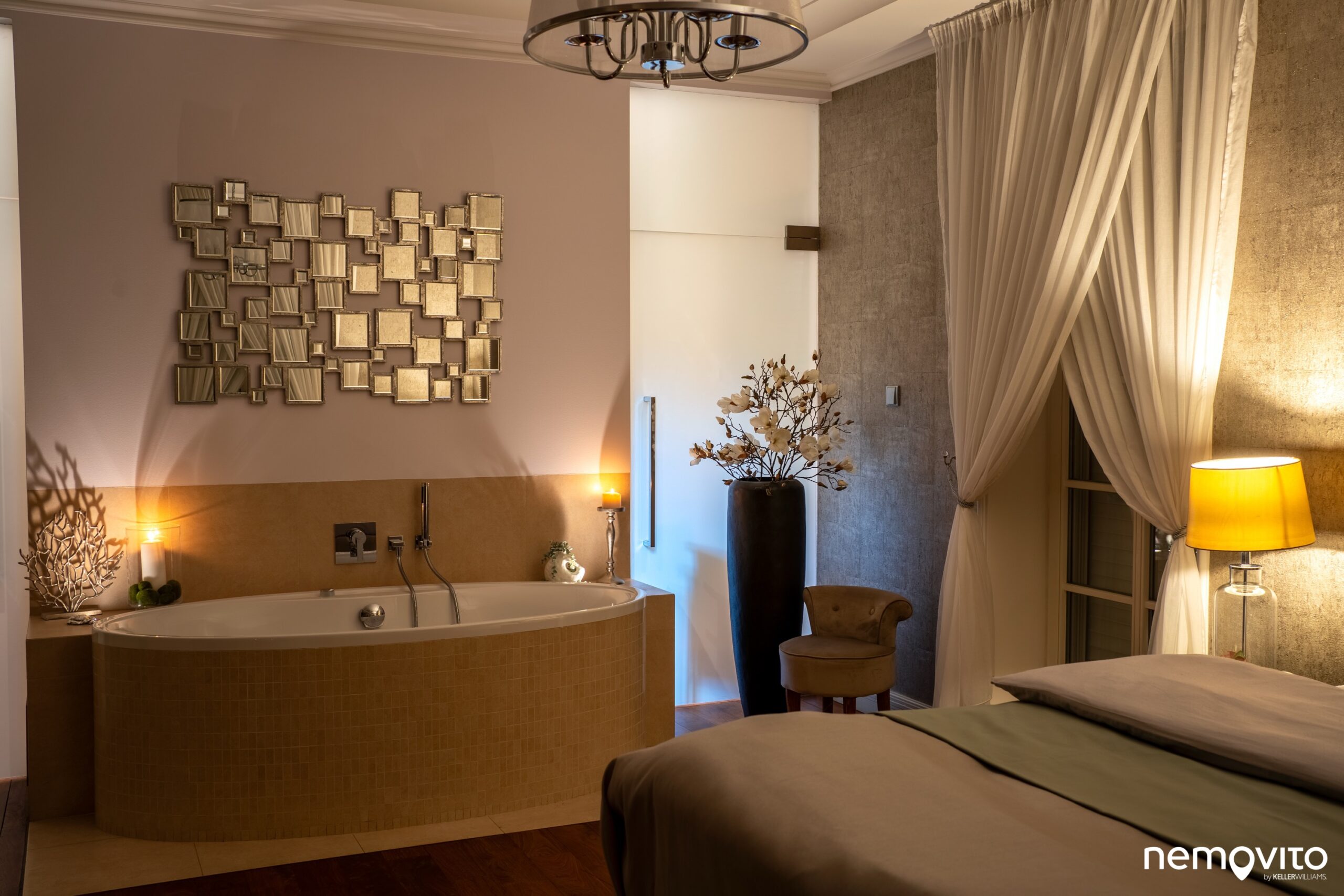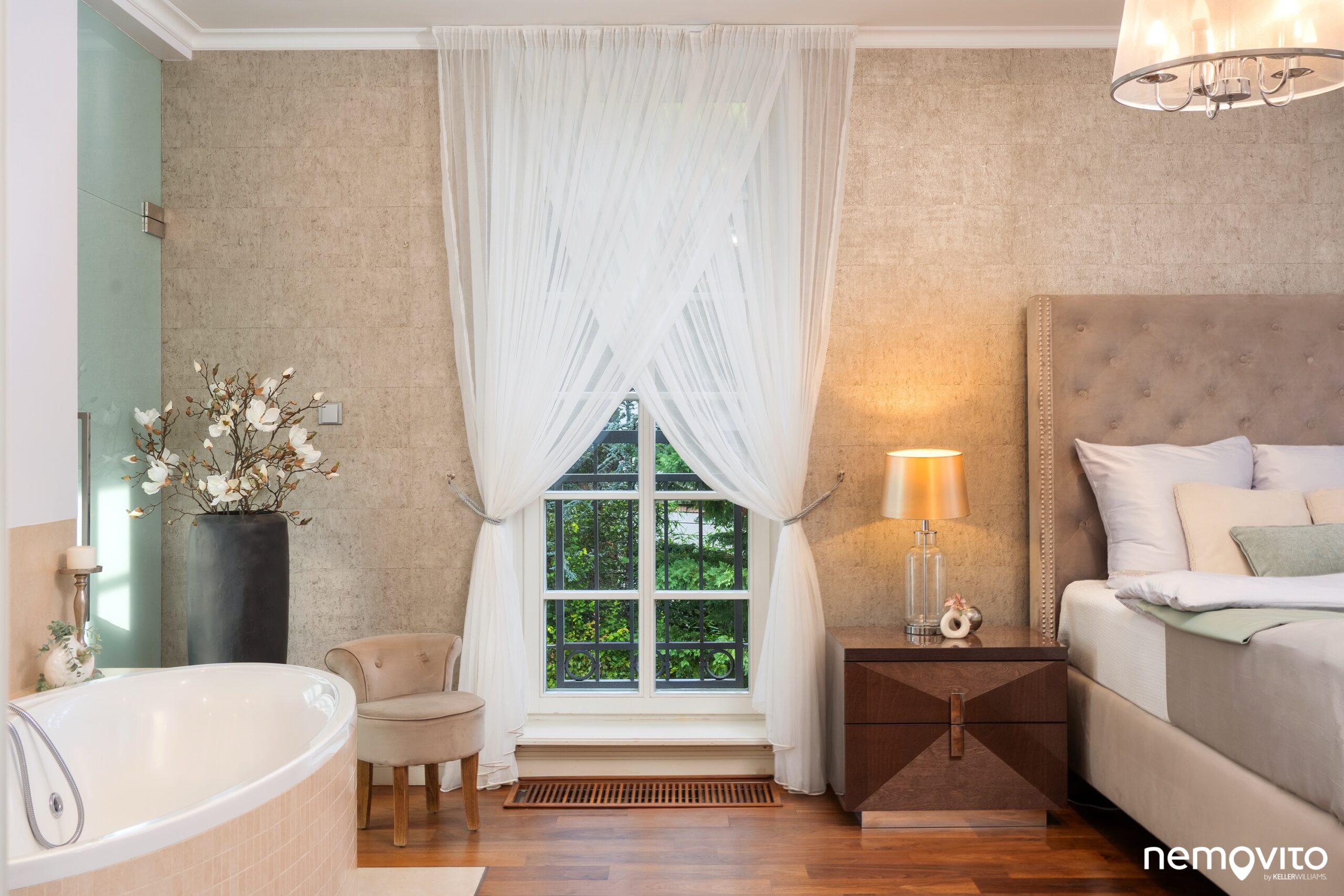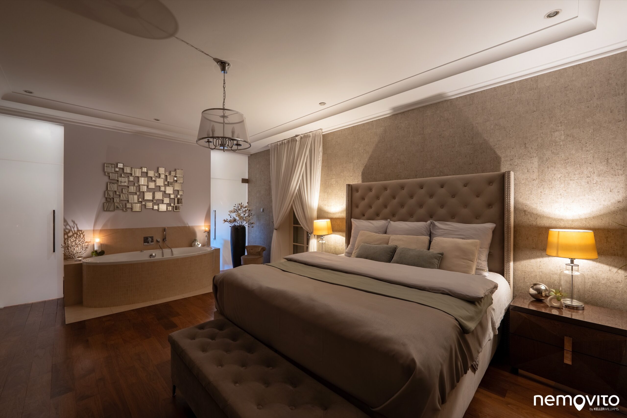 Hlavní ložnice je laděna především do světlých a lehkých odstínů. Na fotkách nenajdete pouze šatnu, kterou jistě ukazovat nemusíme. Má zhruba 6 m2 a je hned vedle dveří do koupelny, tedy vlevo od hydromasážní vany.